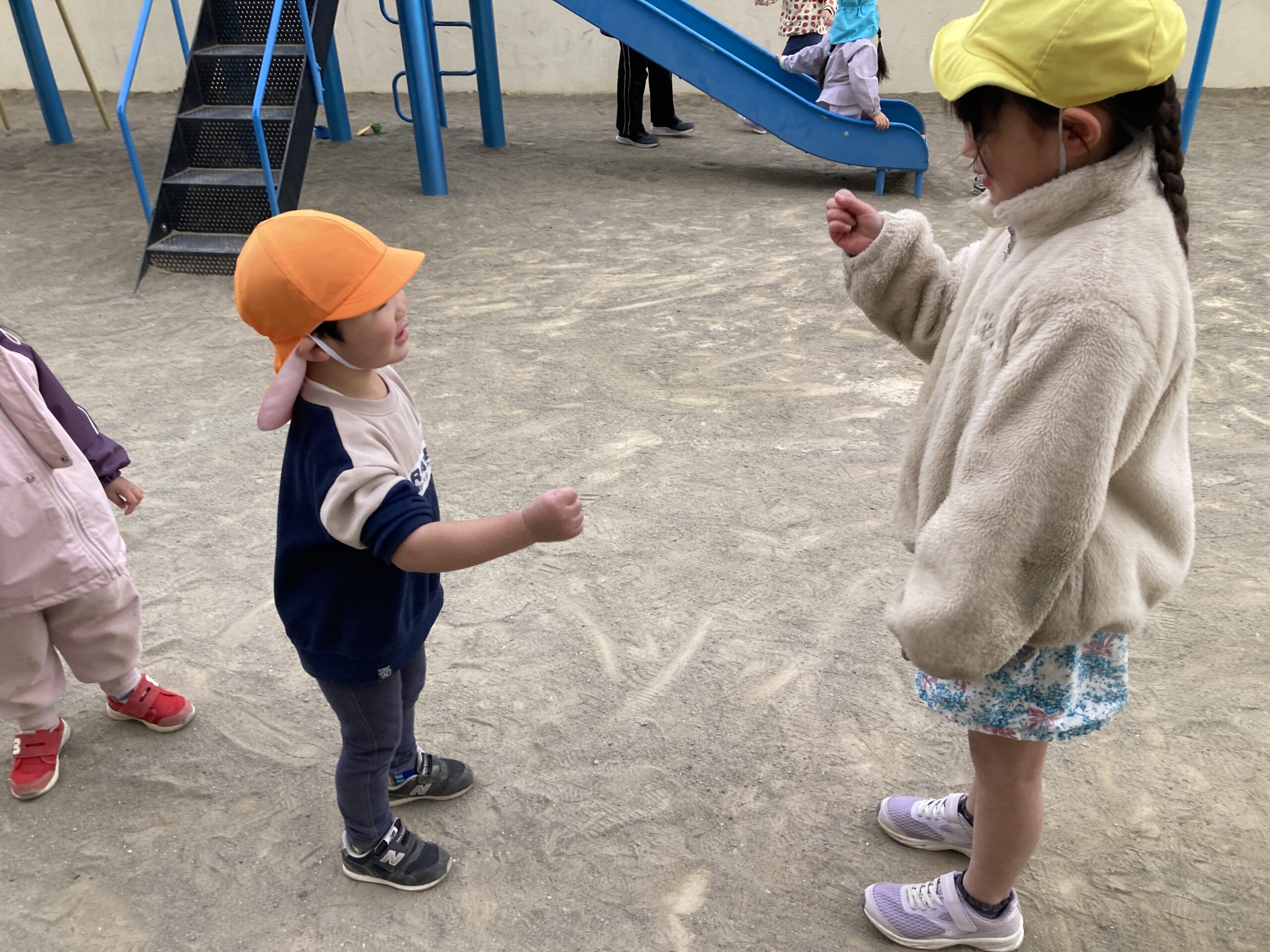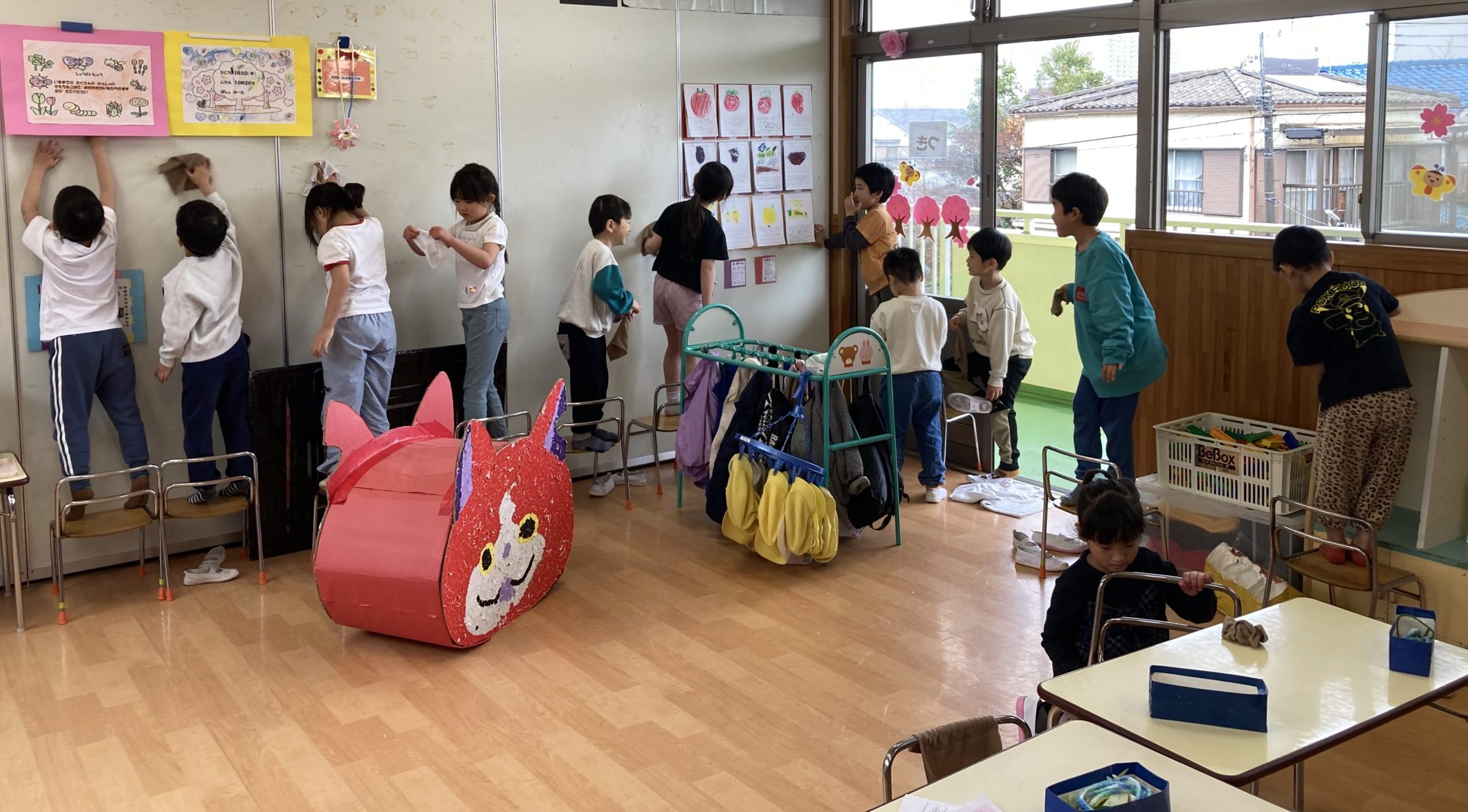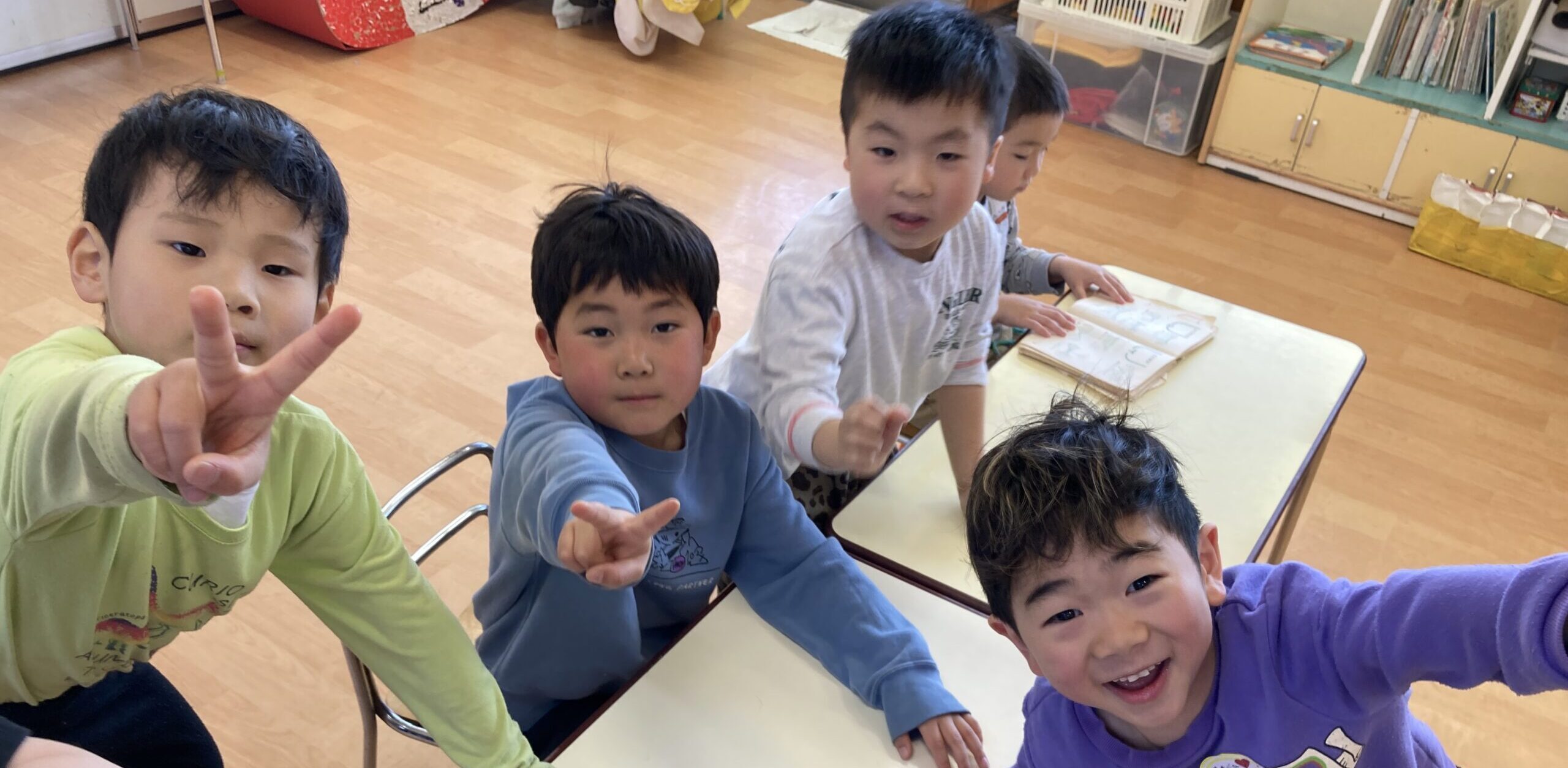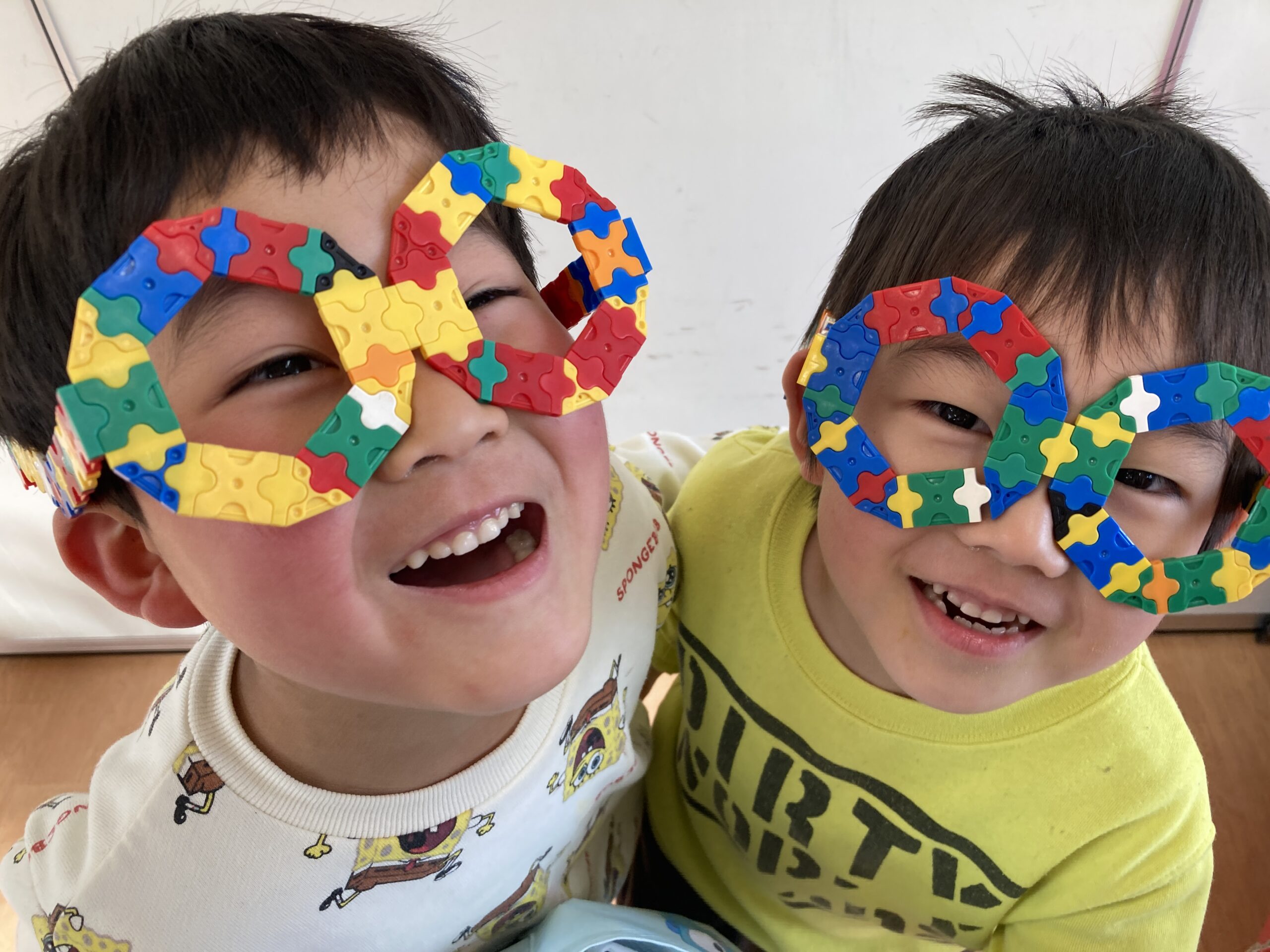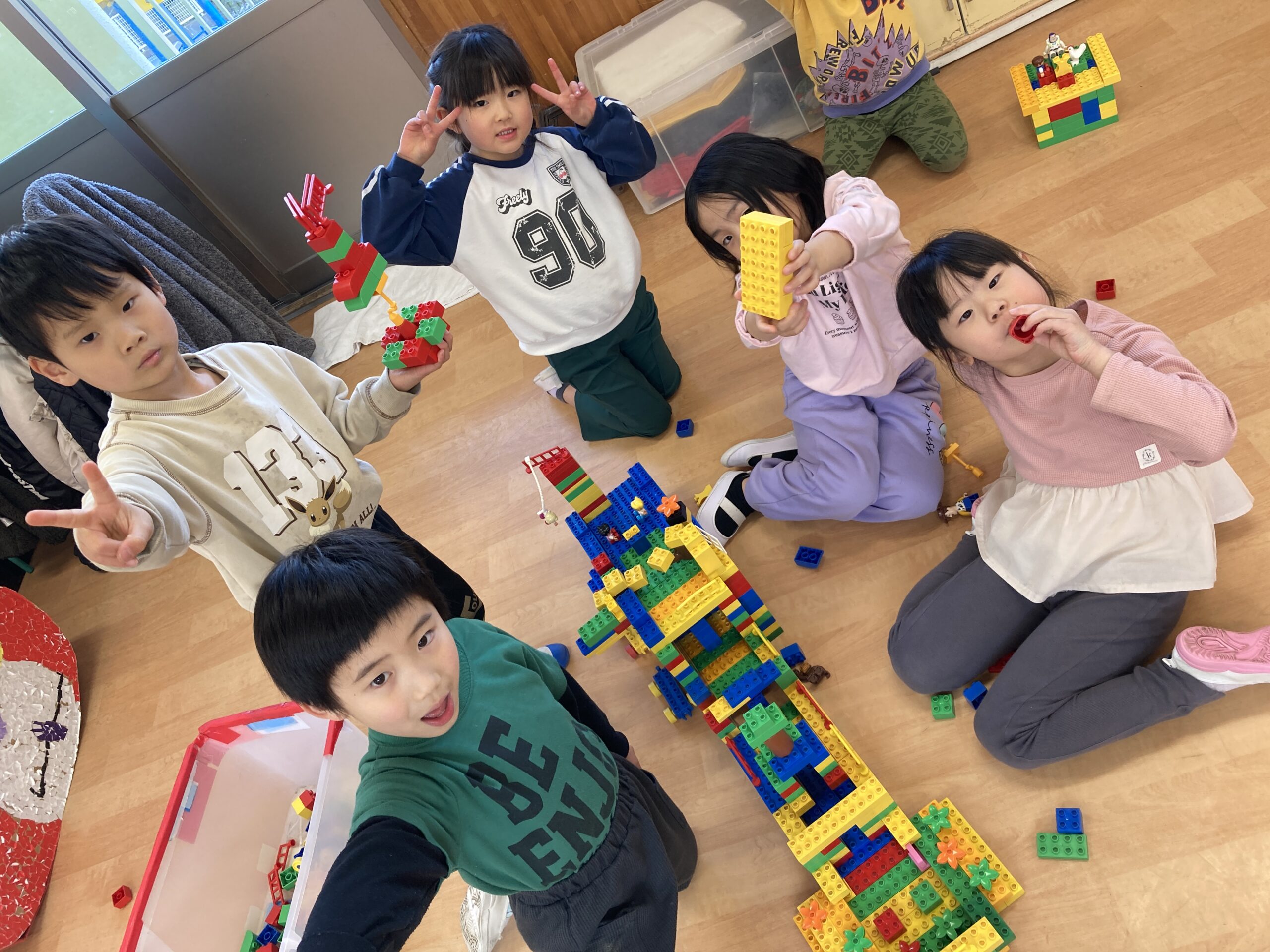 室内や園庭でも、みんなで楽しそうに遊んでいます!残りの時間をみんなで仲良く過ごしています!好きなもの探し、ラキュー、毛糸であやとりなどそれぞれ楽しんでいます。