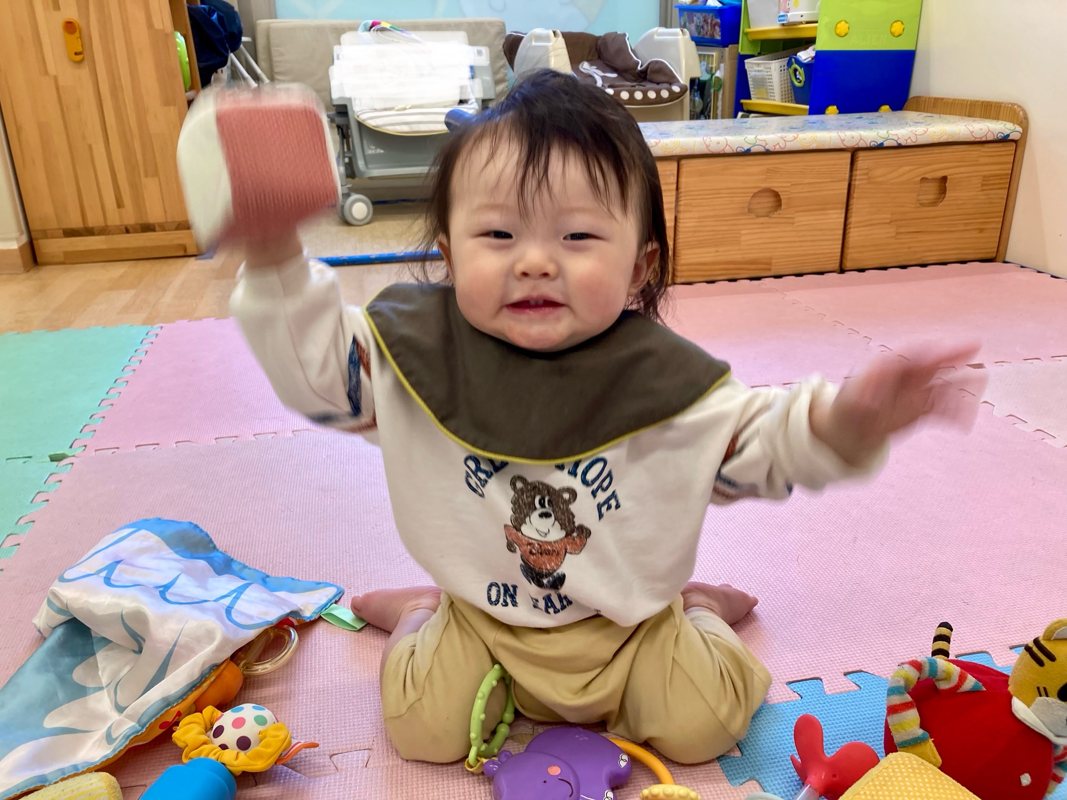 玩具をしっかり持ってフリフリして楽しいね。