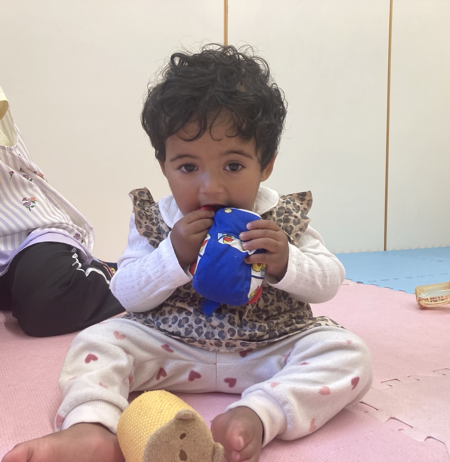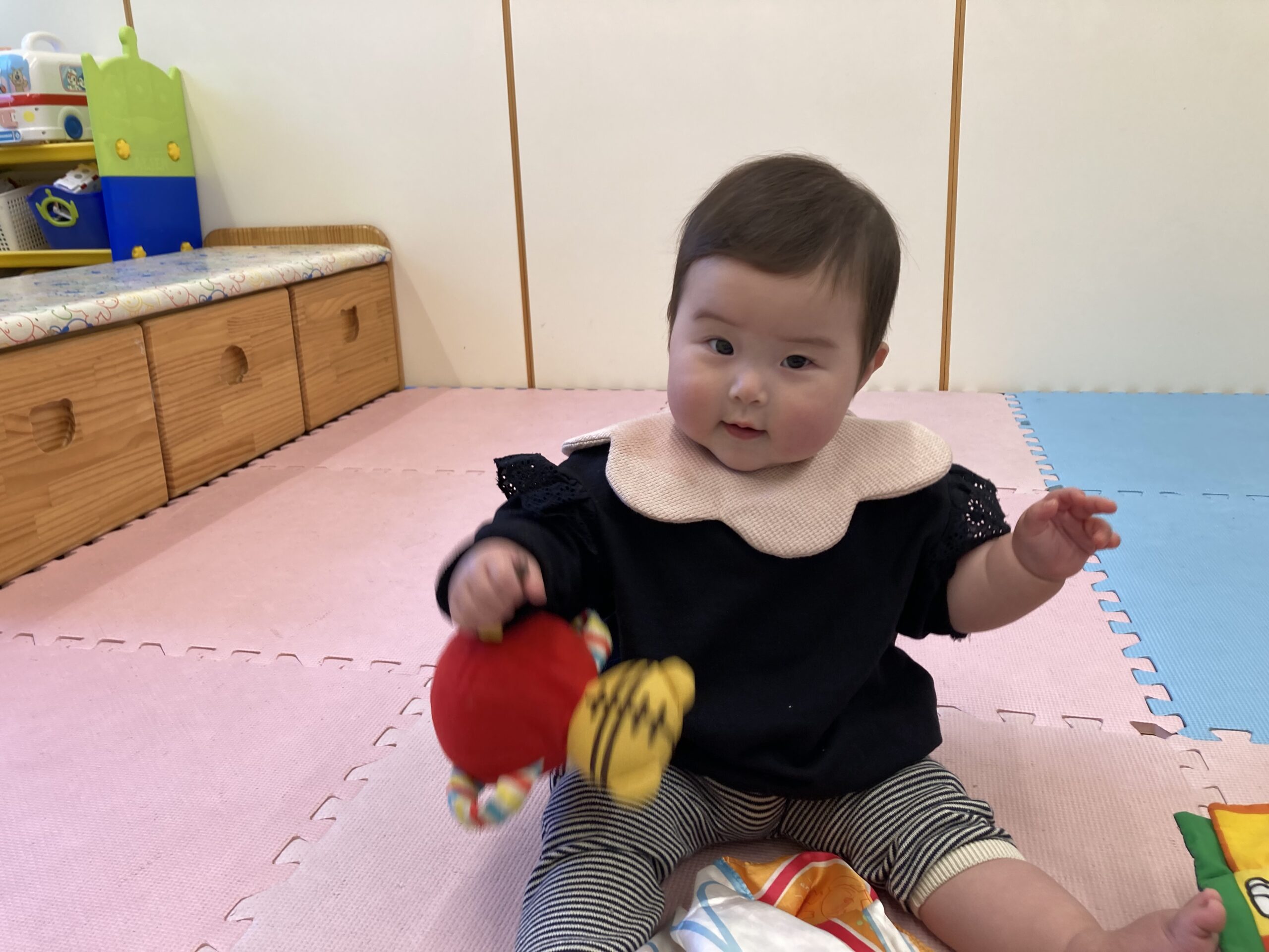 お気に入りの玩具を見つけるとニコニコで遊んだり、ハイハイでお部屋の中を移動したりと元気に過ごしています。