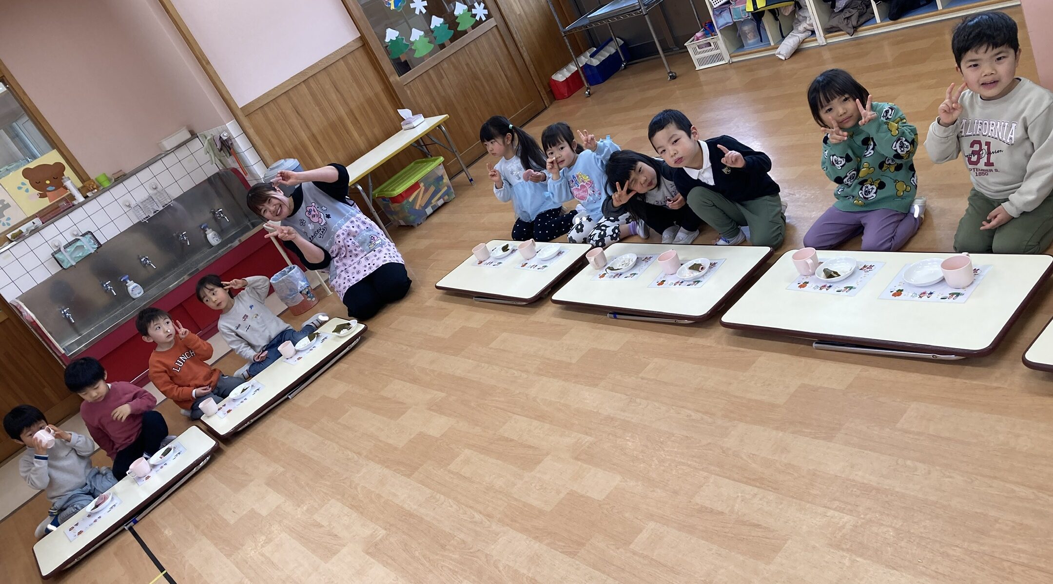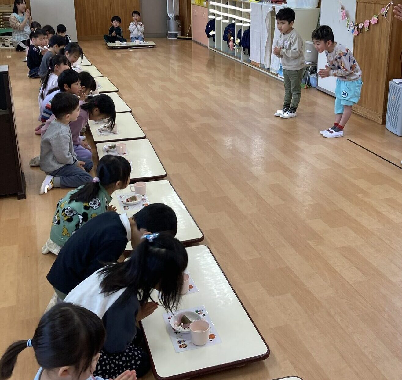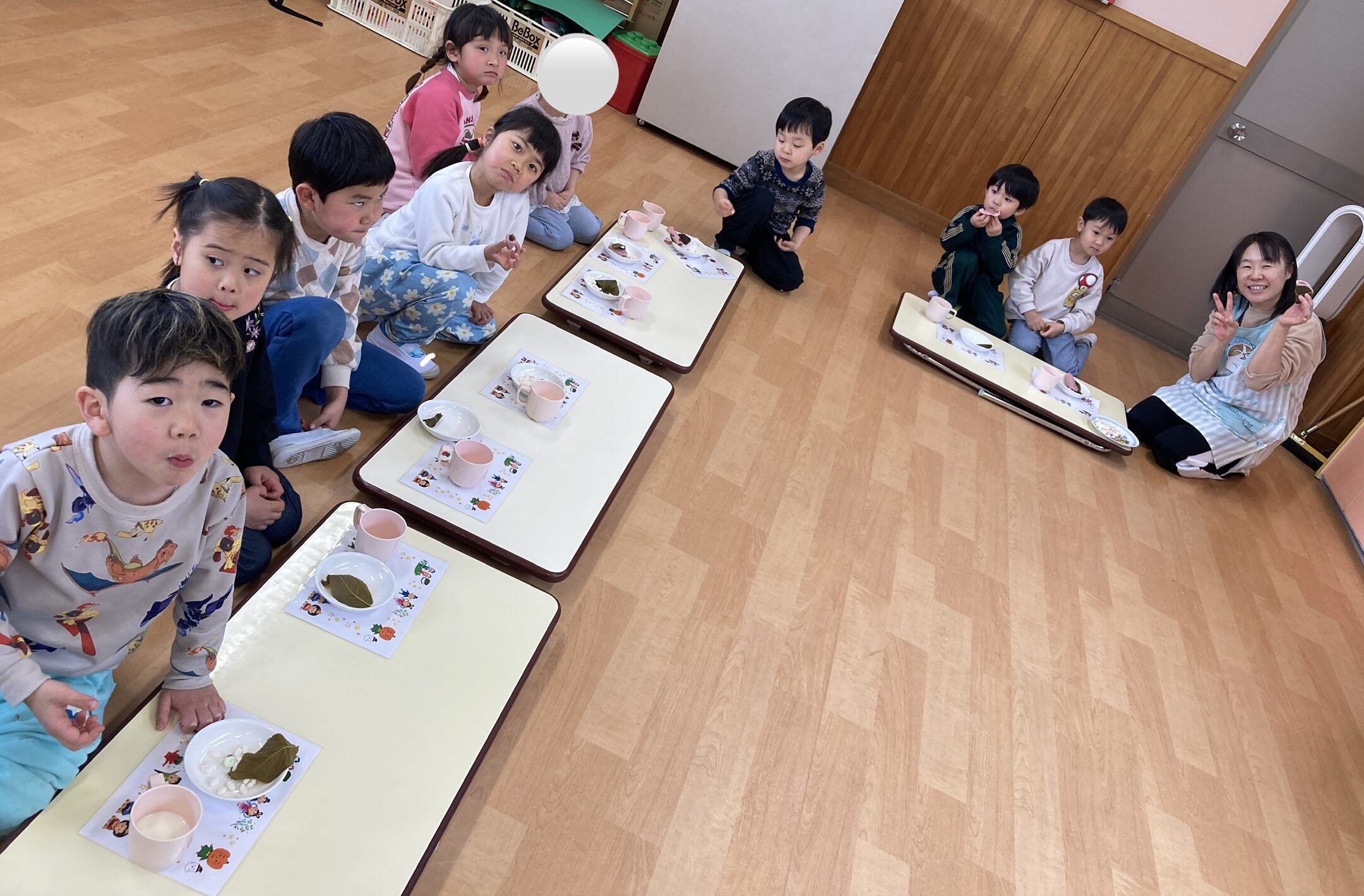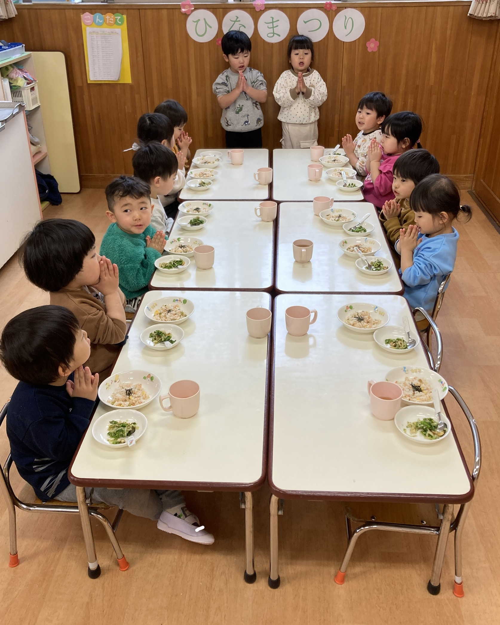 なぜ桃の節句にひなあられや桜餅を食べるのか。午前中にお話したひな祭りクイズに出てきた内容も再確認してから、みんな揃って「いただきます!」