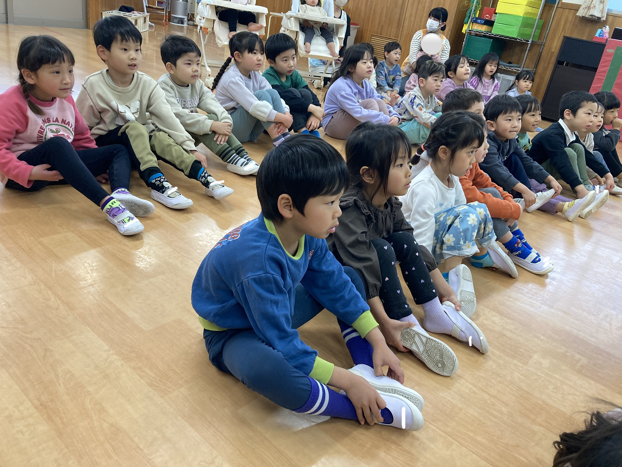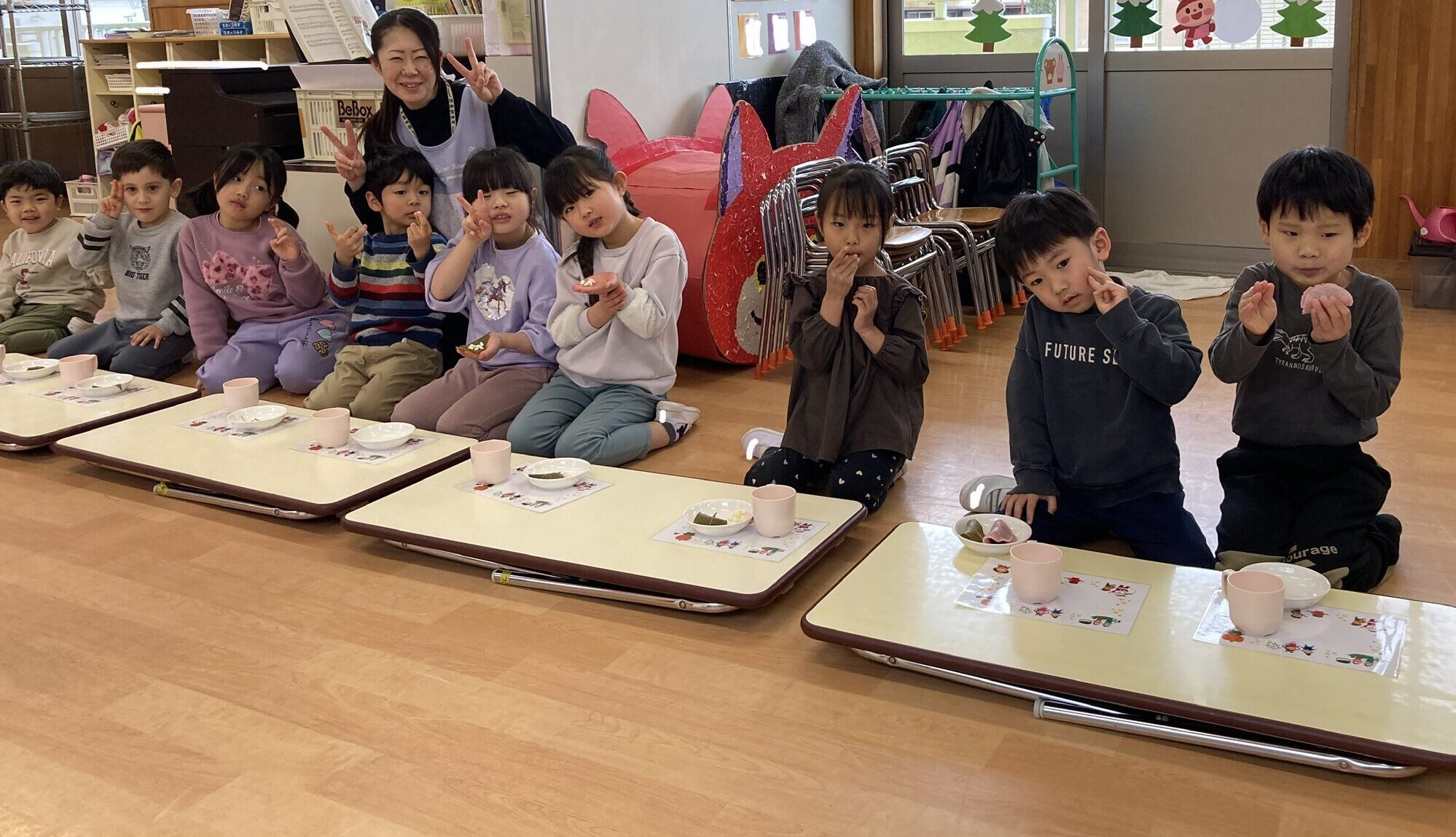 おやつは、にじ組・うみ組・つき組みんな揃って、おやつを食べました。