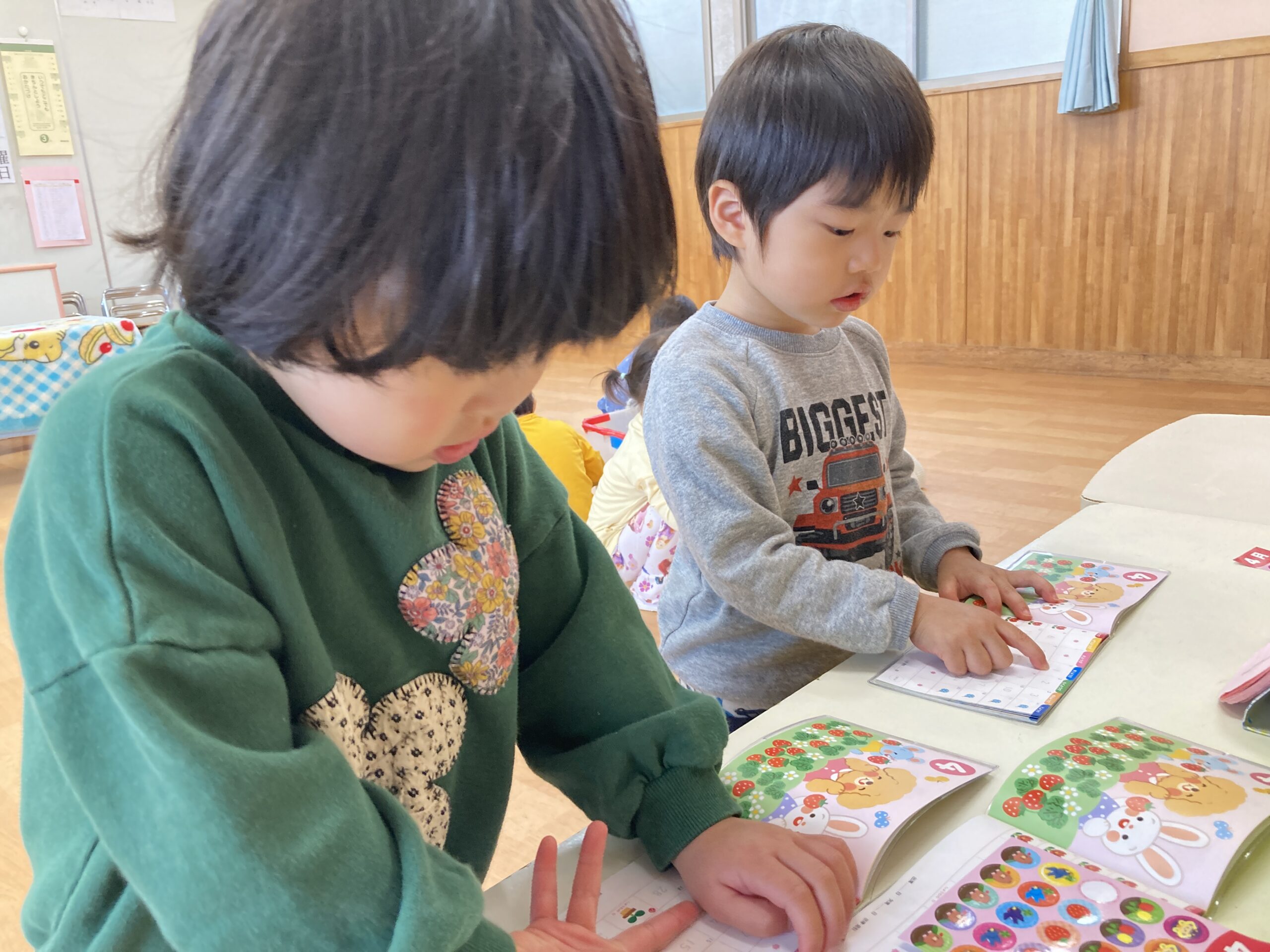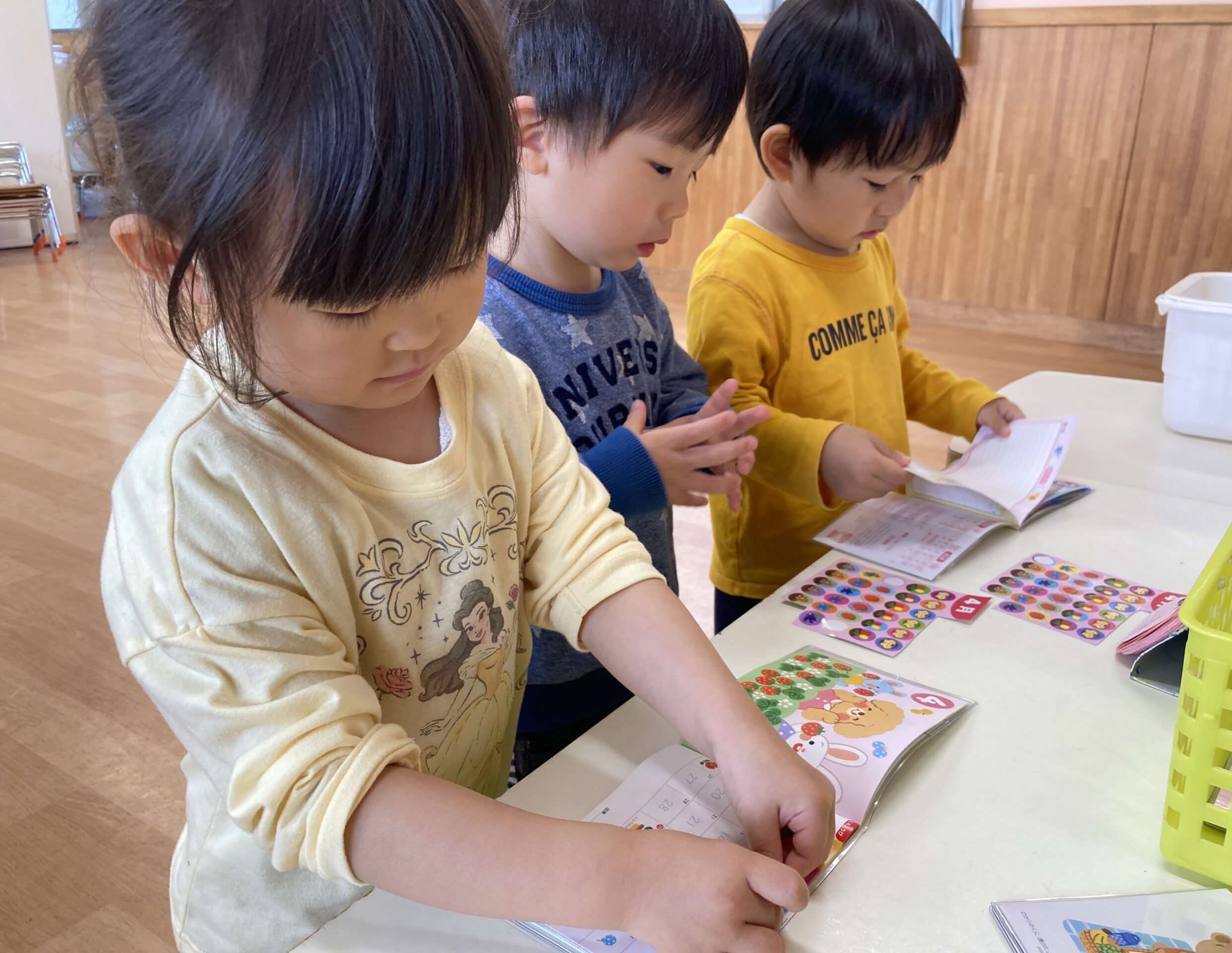 「今日はどれにしようかな?」と嬉しそうにシールを選び、丁寧に貼る姿が見られます。回数を重ねる中で、自分のページを開き、数字を見つけることも上手になってきました。