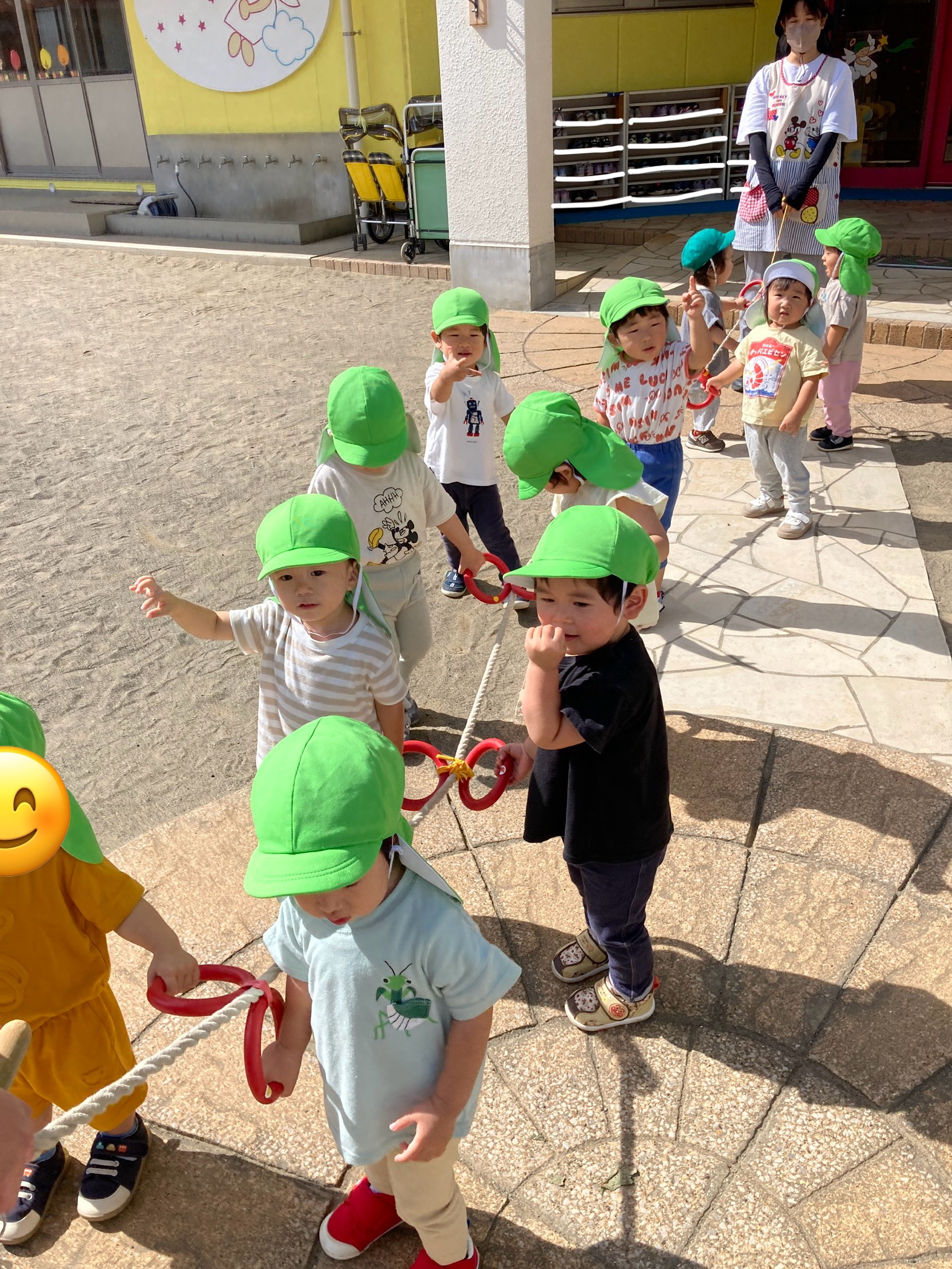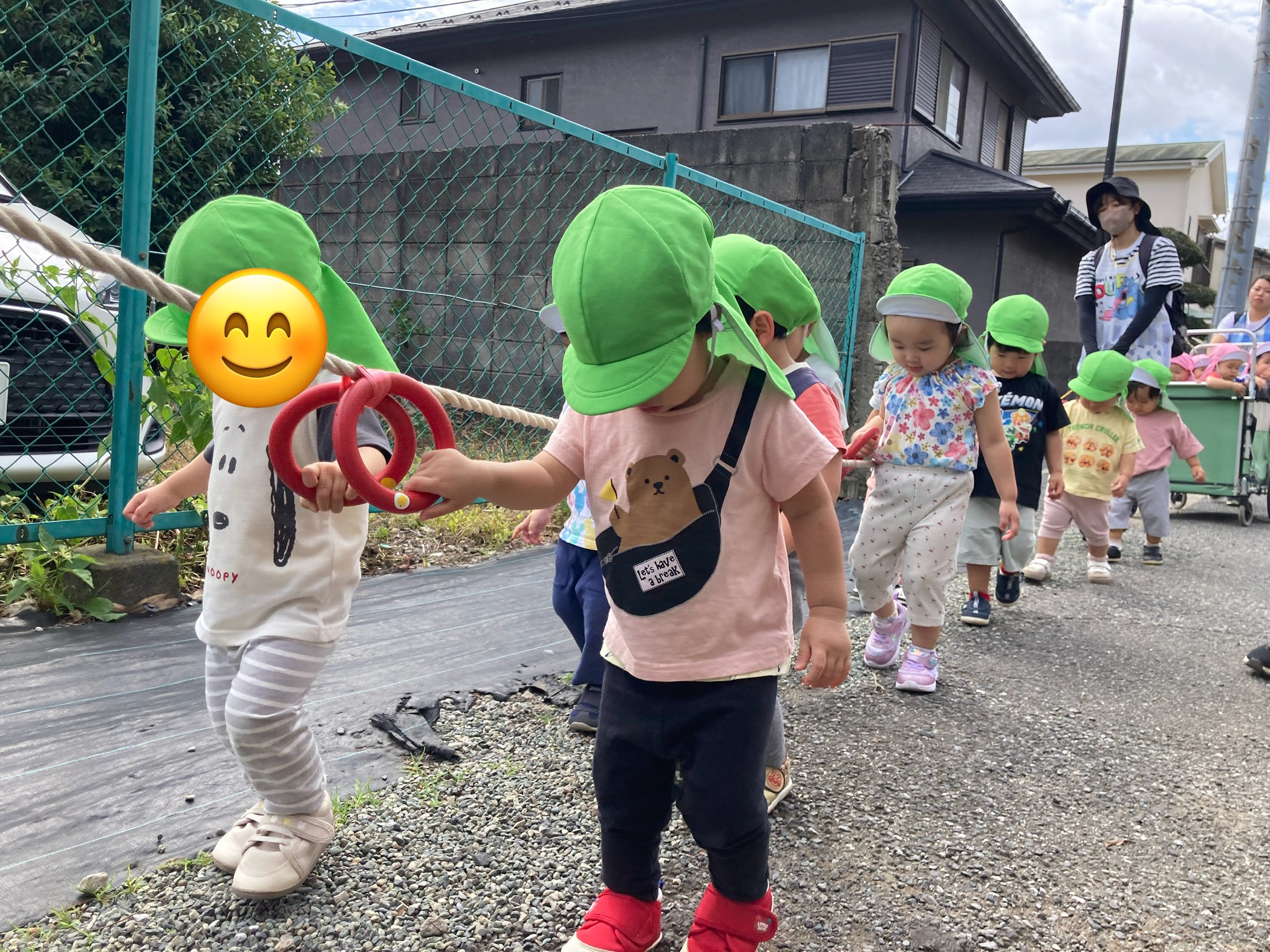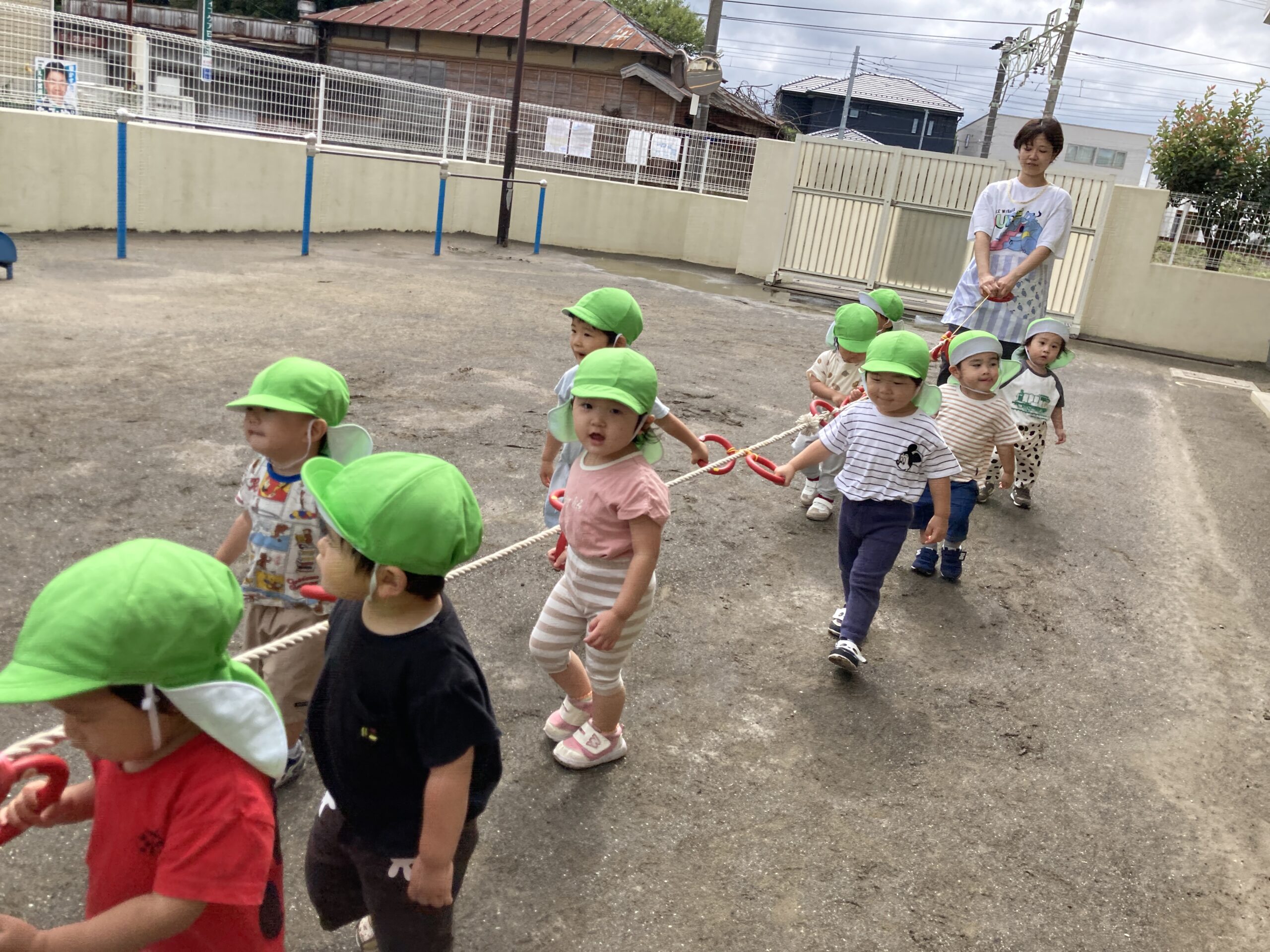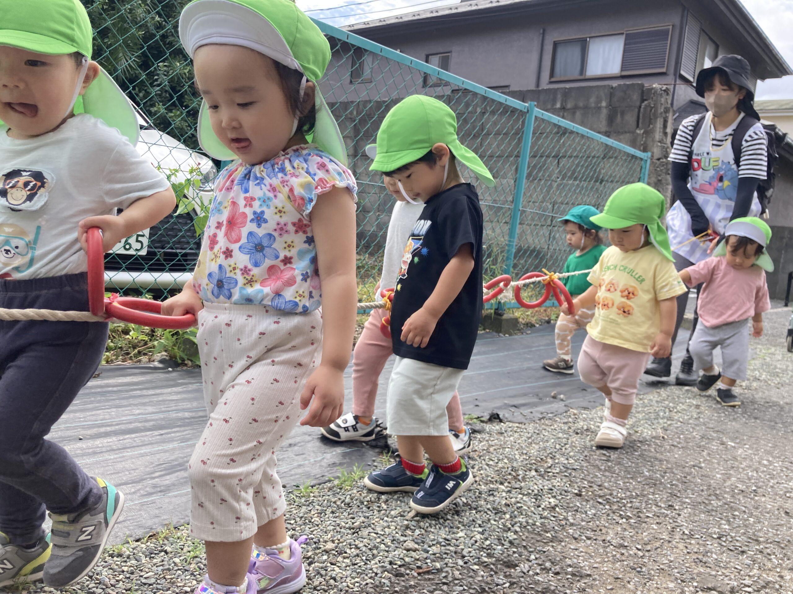 園庭で散歩ロープに掴まり、準備完了!!