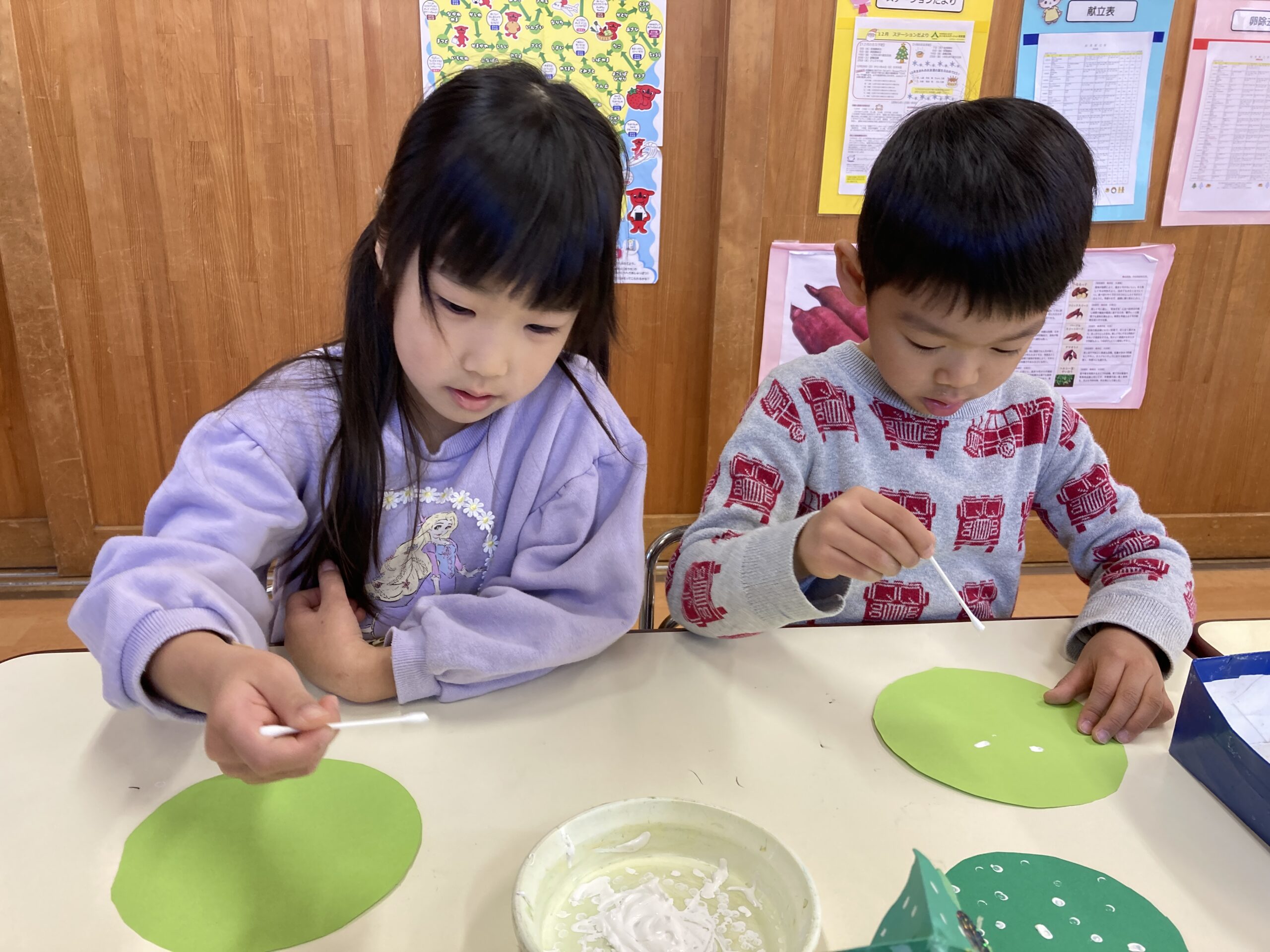 丸形に切った画用紙に綿棒を使って雪の模様をつけています。