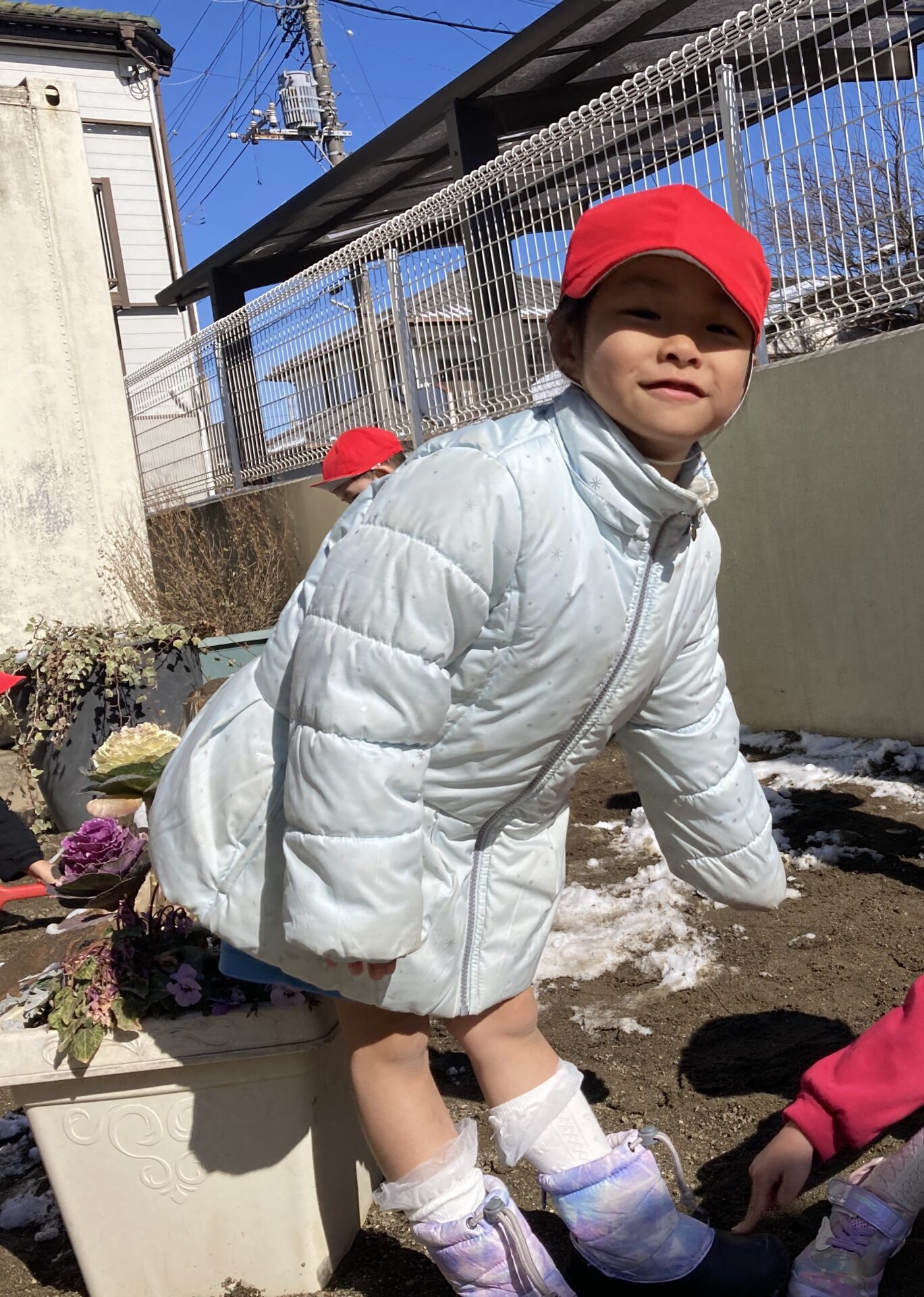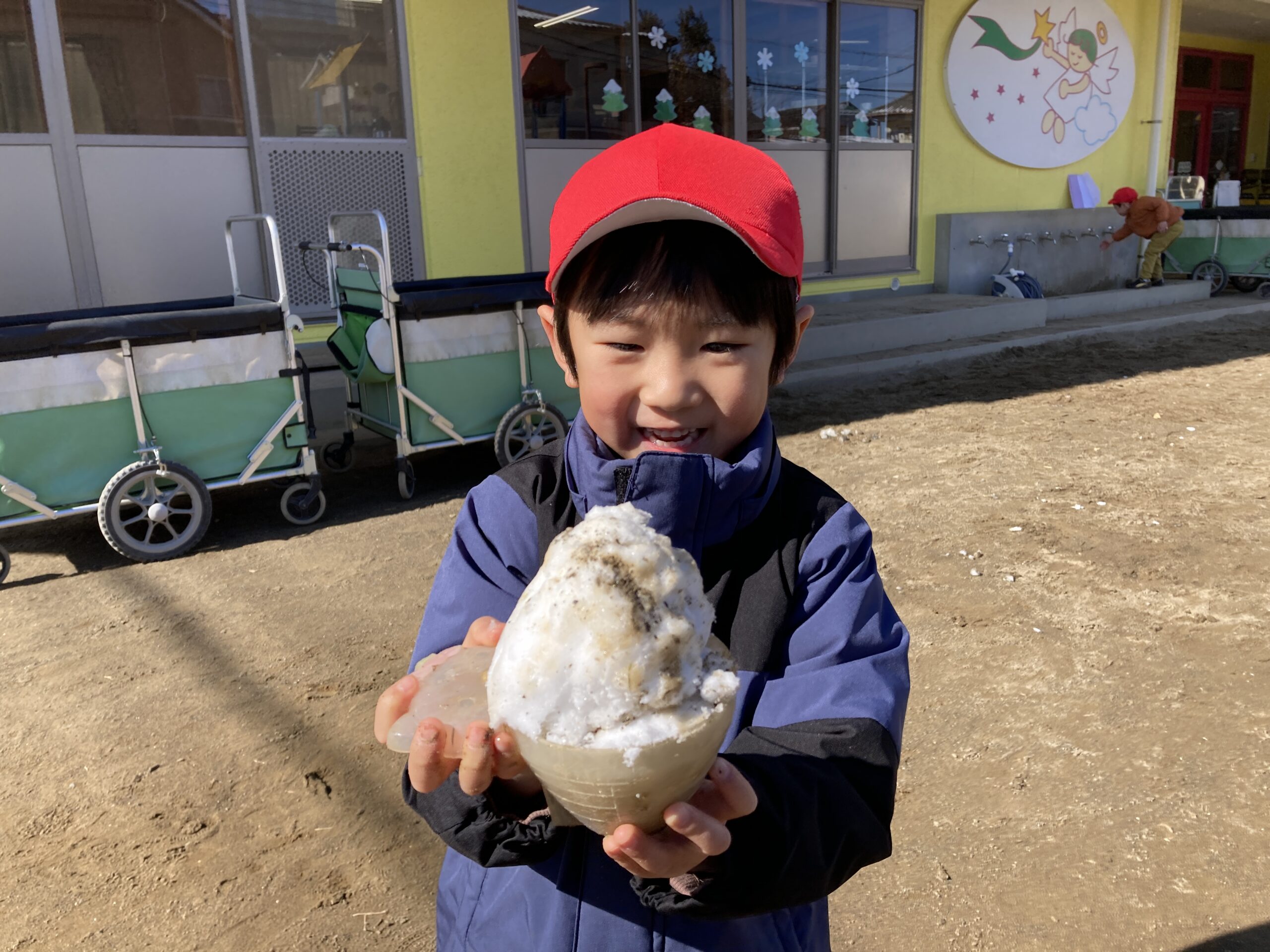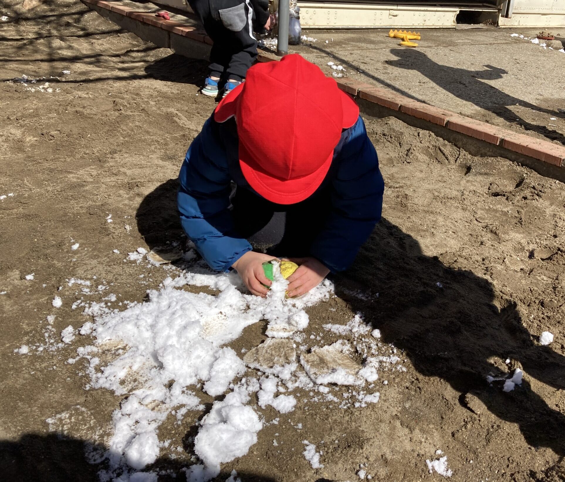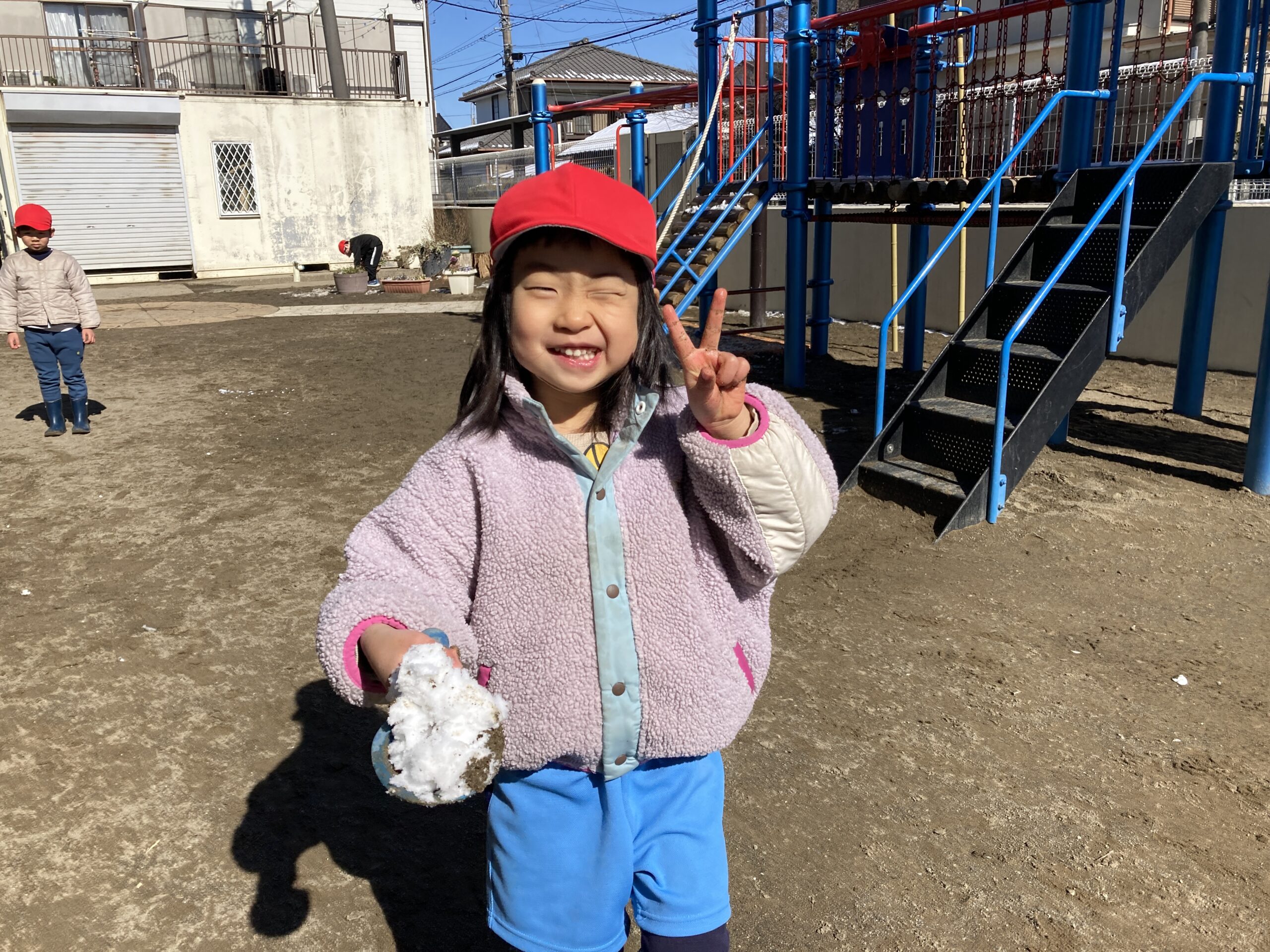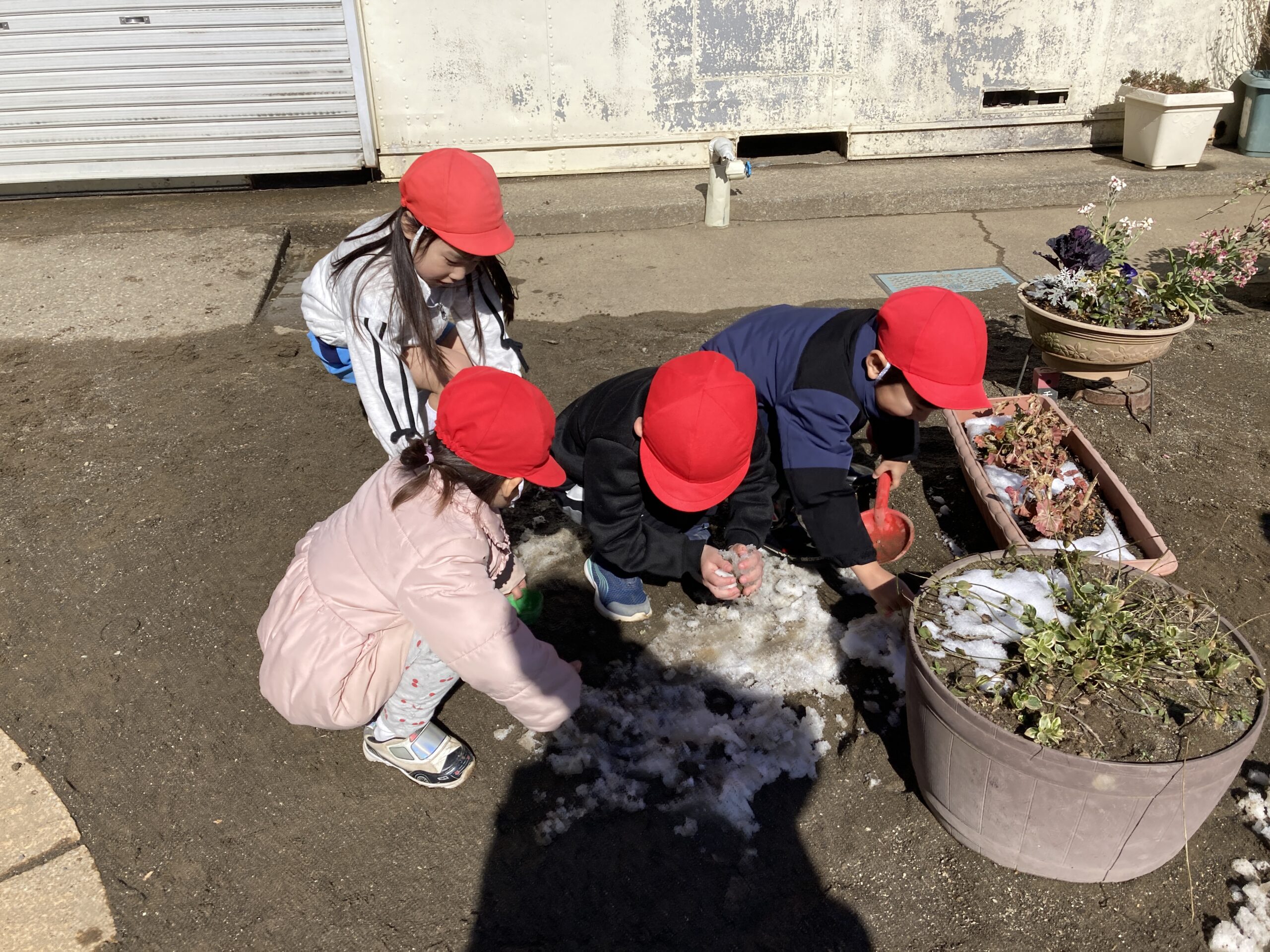 園庭に出るとすぐにその雪をかき集めて遊ぶ姿が見られました。