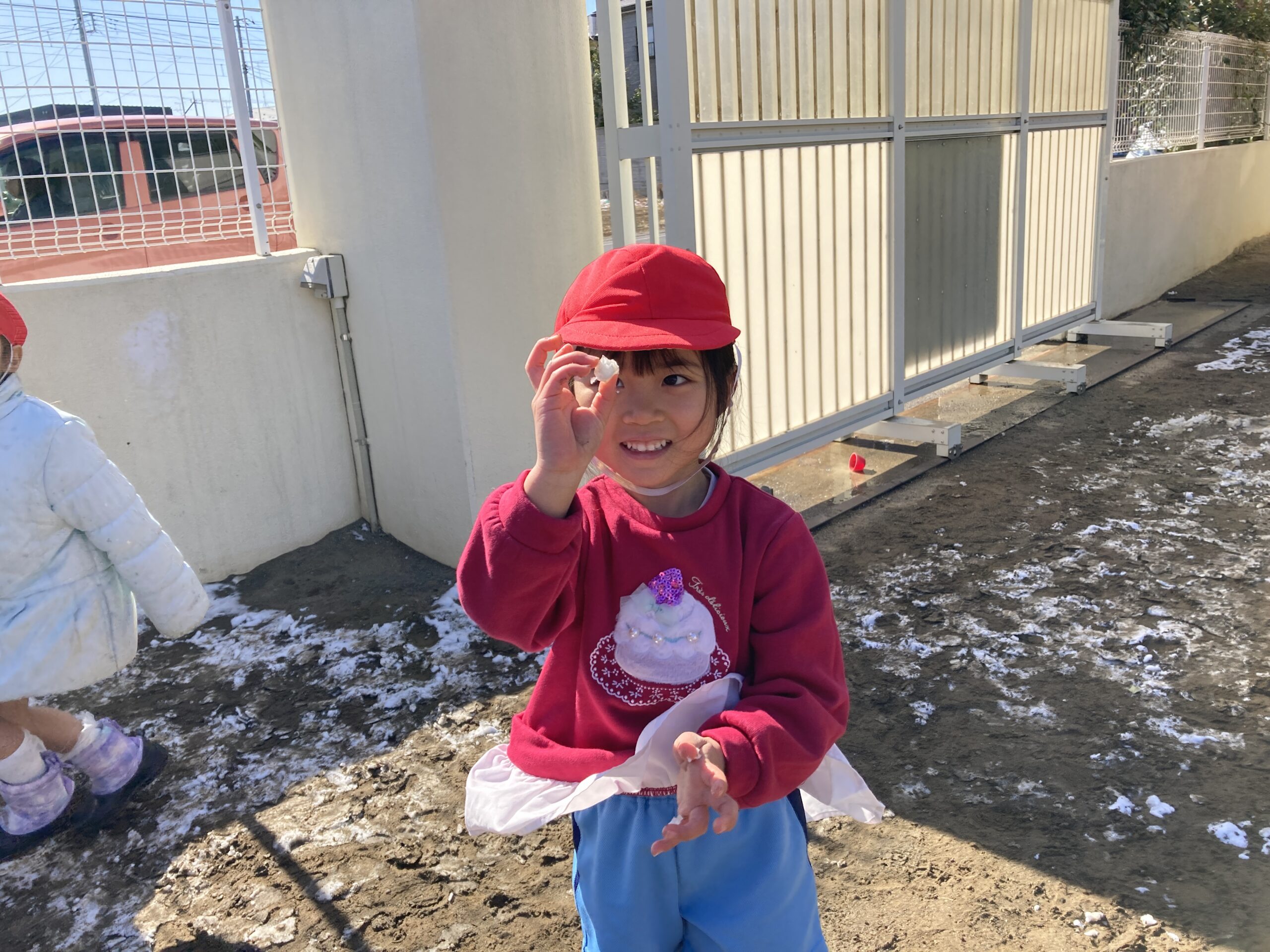 「ここにも!」「おーい!こっちにもあるよ〜」と友だち同士で声を掛け合い、冷たい雪も何の園、「気持ちいいよね〜♡」と言いながら手に乗せていました。