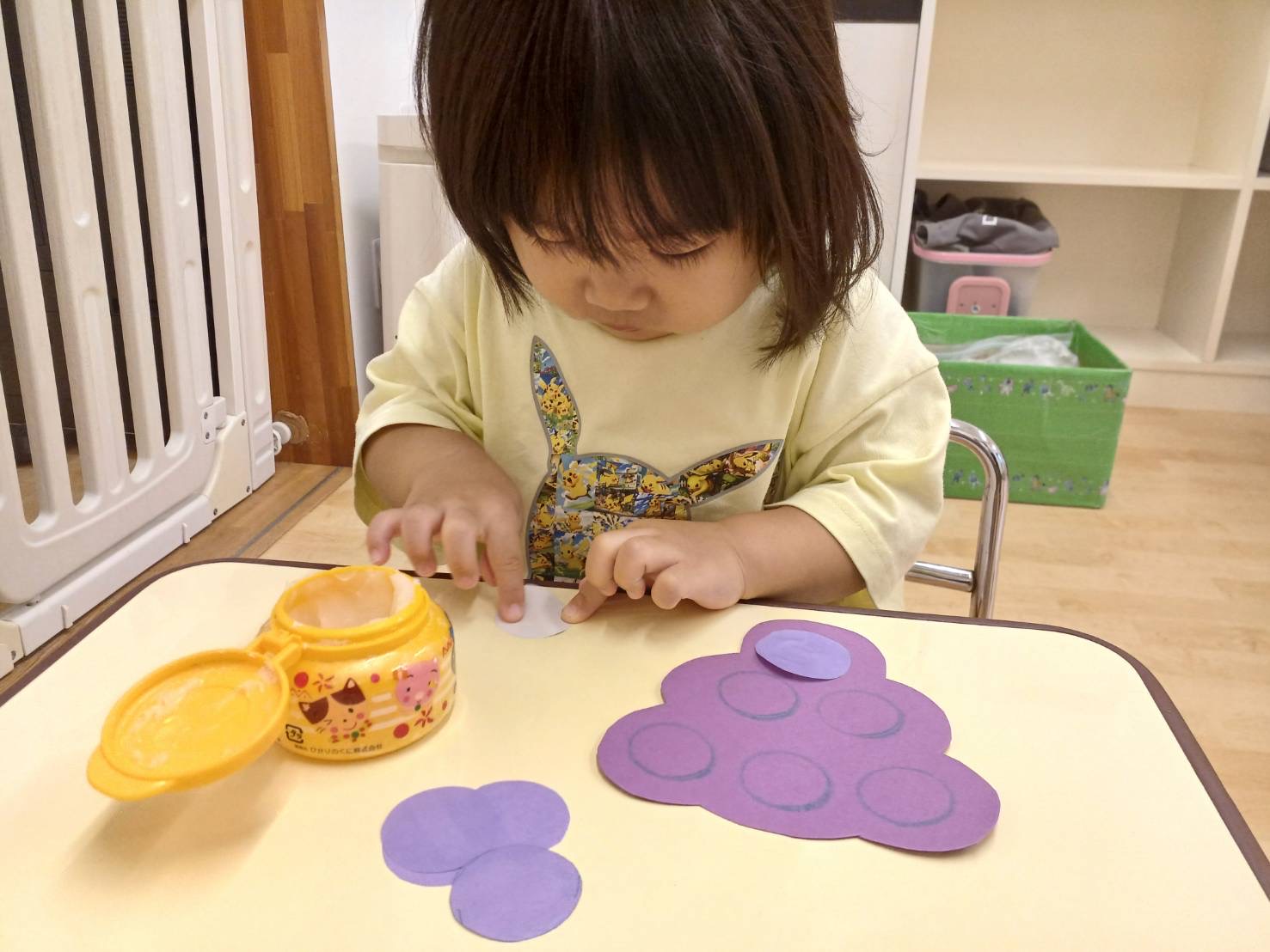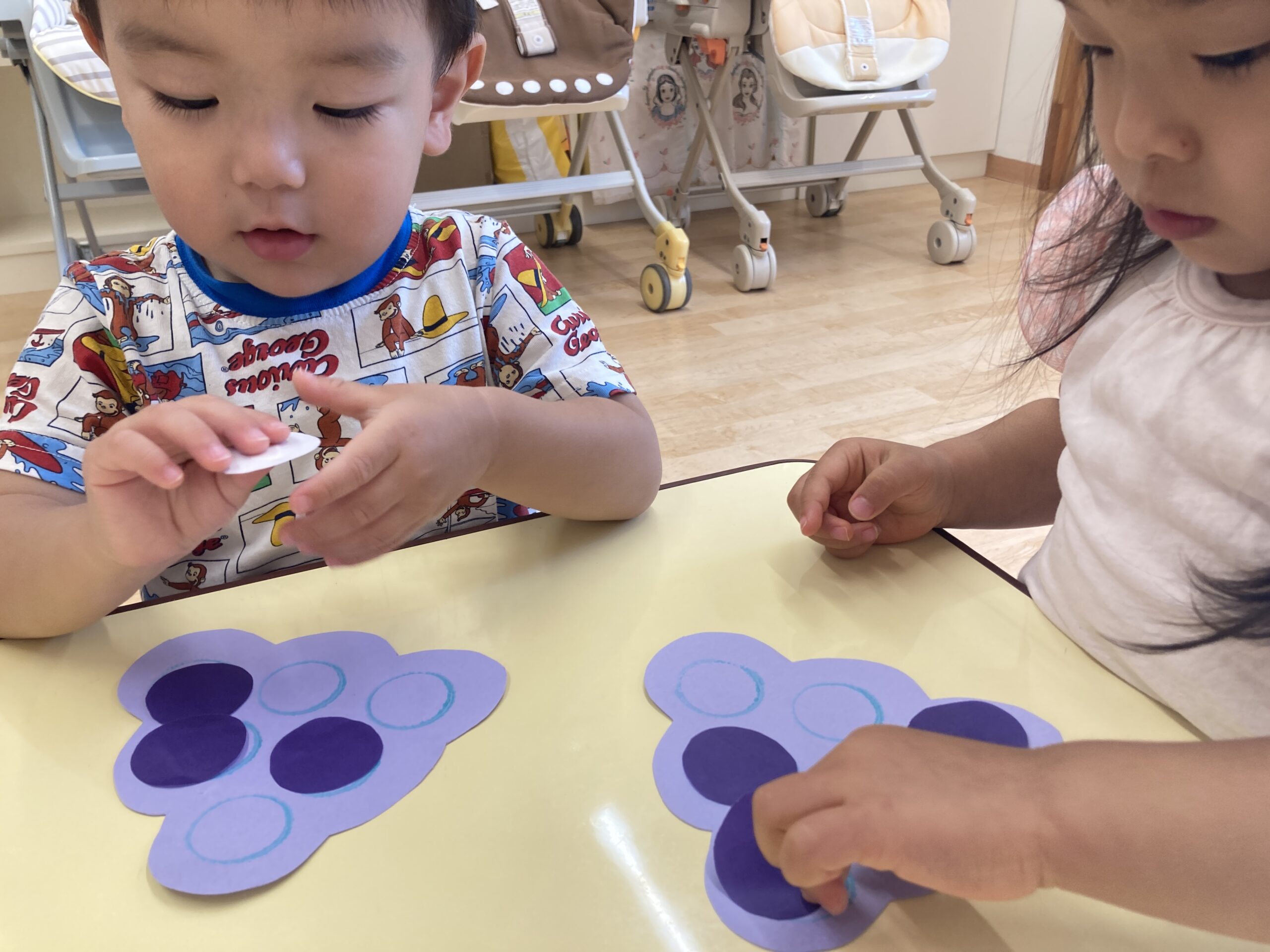 2歳児さんものり付けとっても上手で驚きました。 美味しそうなぶどうが出来上がりました!暑すぎてお外には出れませんでしたがお部屋の中でもたくさん遊びました。