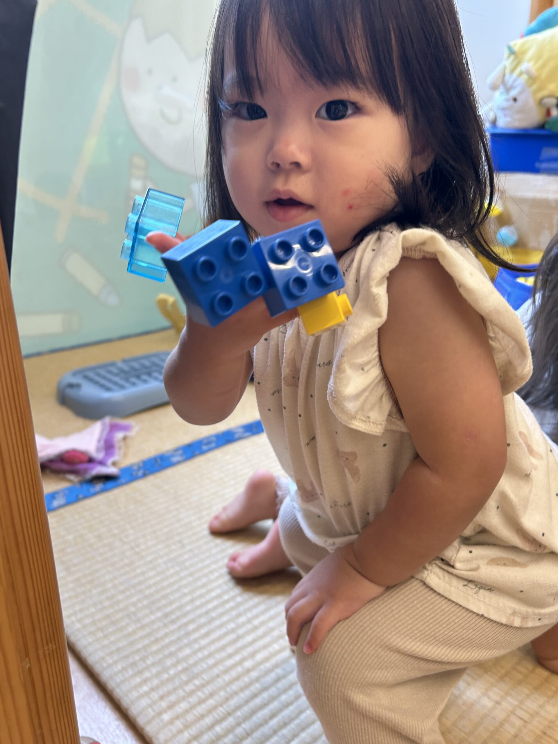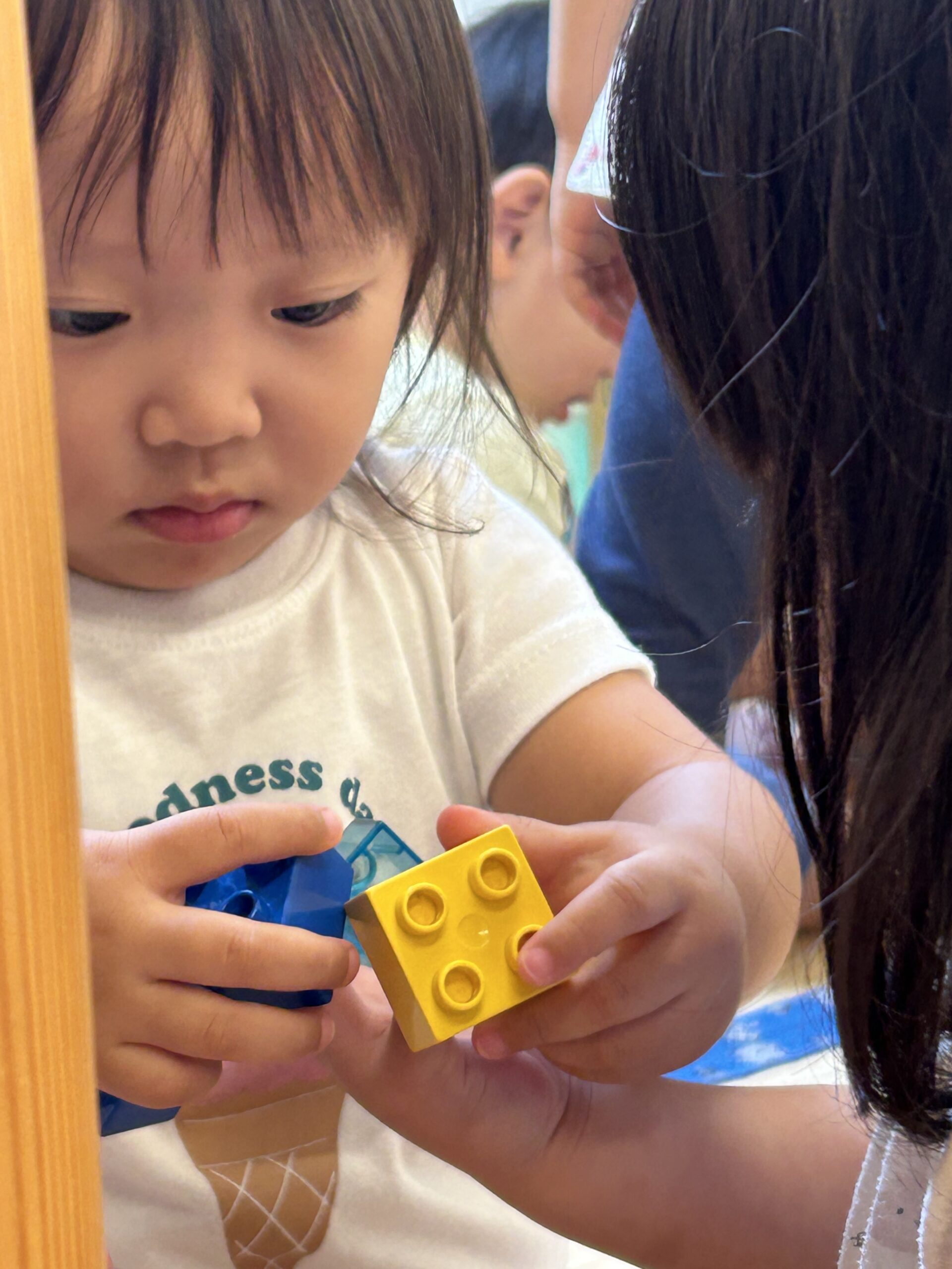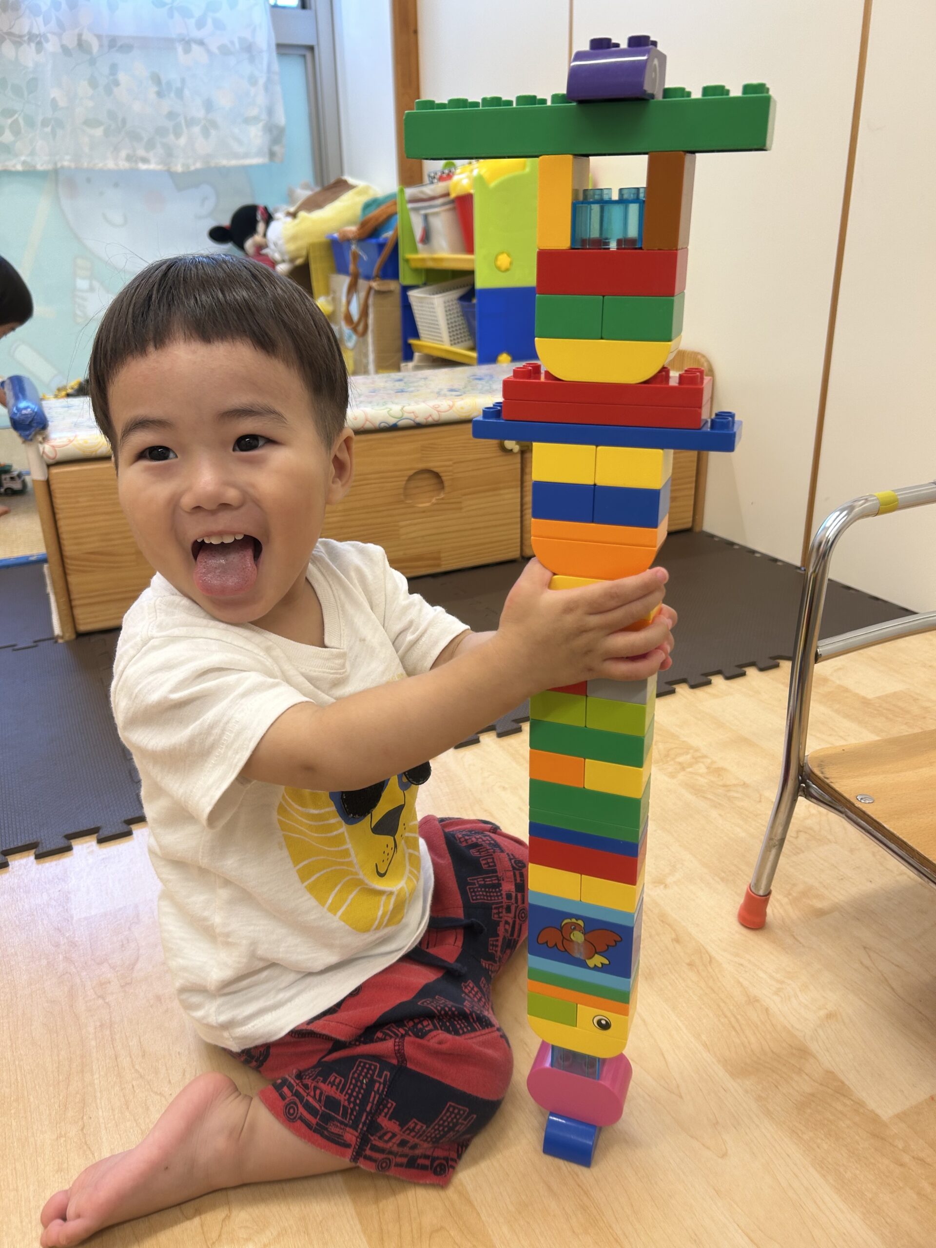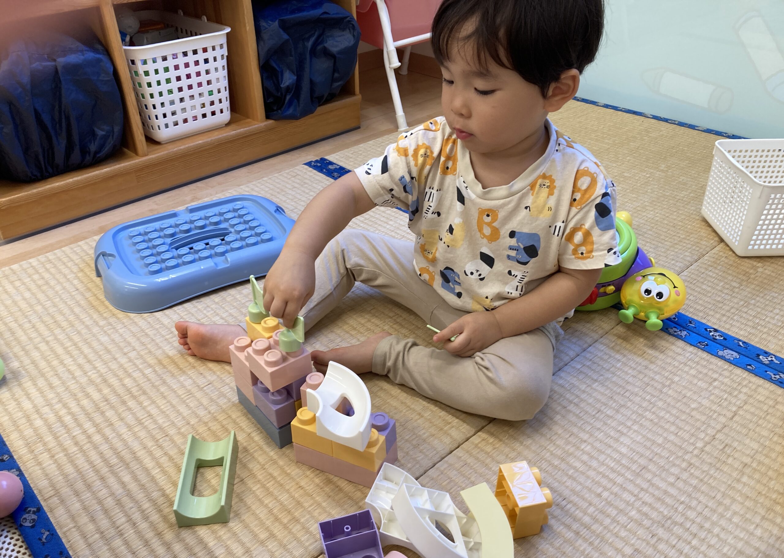 ブロックが人気で、2歳児さんは特に自分で組み立てて私たちが思いもよらない作品を完成させてくれます。1歳児さんはよく見て真似してますよ!異年齢ならではの刺激ですね♪