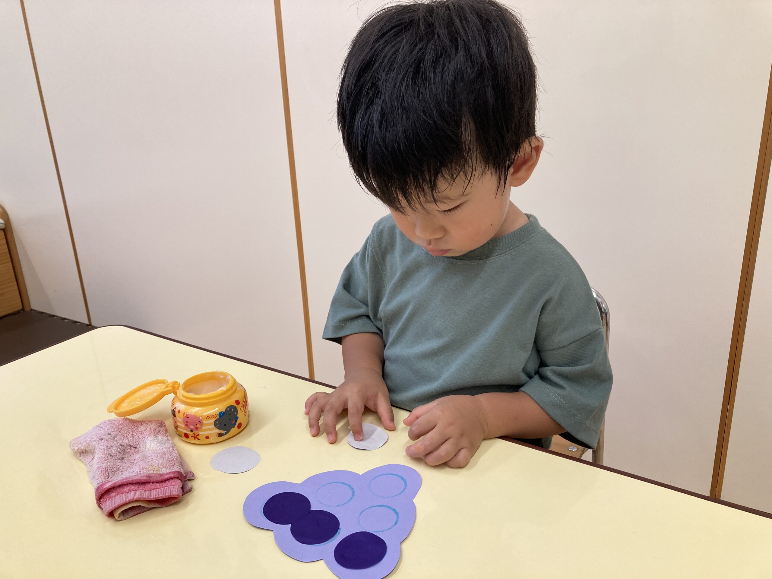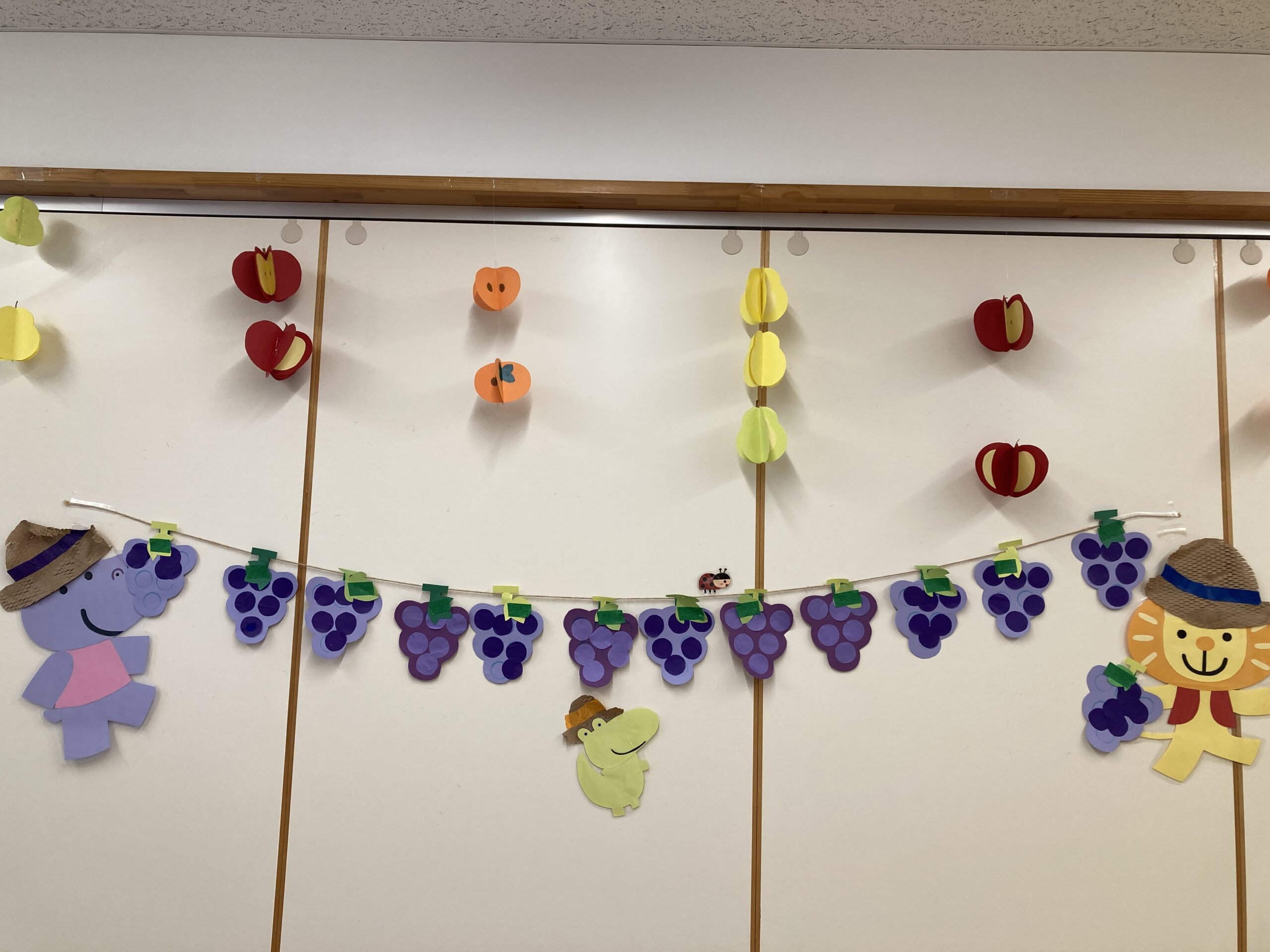 9月になっても猛暑で、汗びっしょりで登園してくれたお友達。まずは水分補給をして落ち着いてから遊び始めます。今月の壁面製作は、〝ぶどう🍇‘’ 1歳児さんは折り紙の後ろについた両面テープを剥がして台紙の丸の中に貼ります。2歳児さんは丸の折り紙にのりをつけて台紙の丸に貼りました。