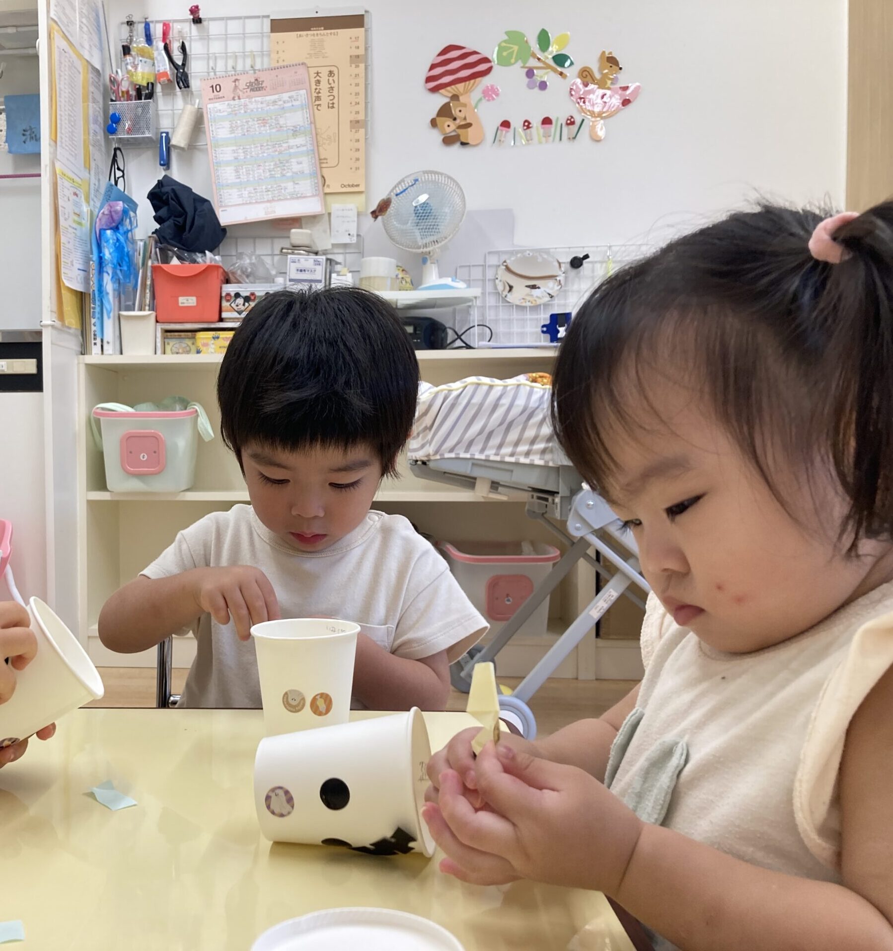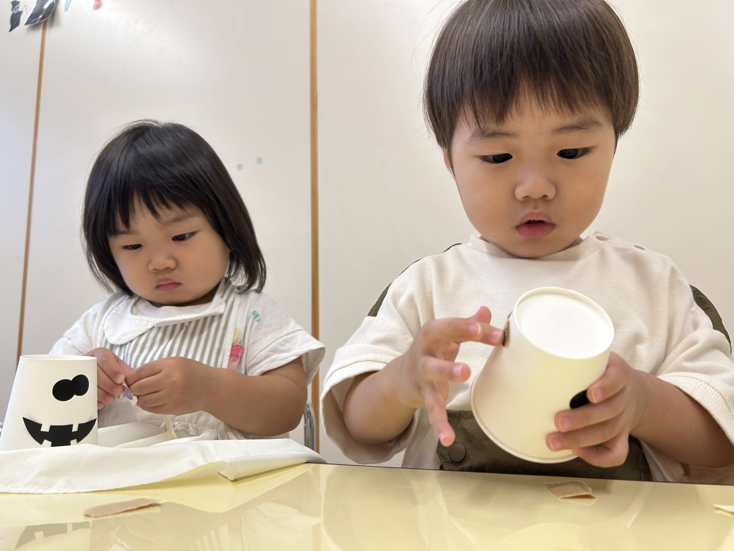 紙コップに目や口のシールやハロウィンのシールを自由に貼りました。
