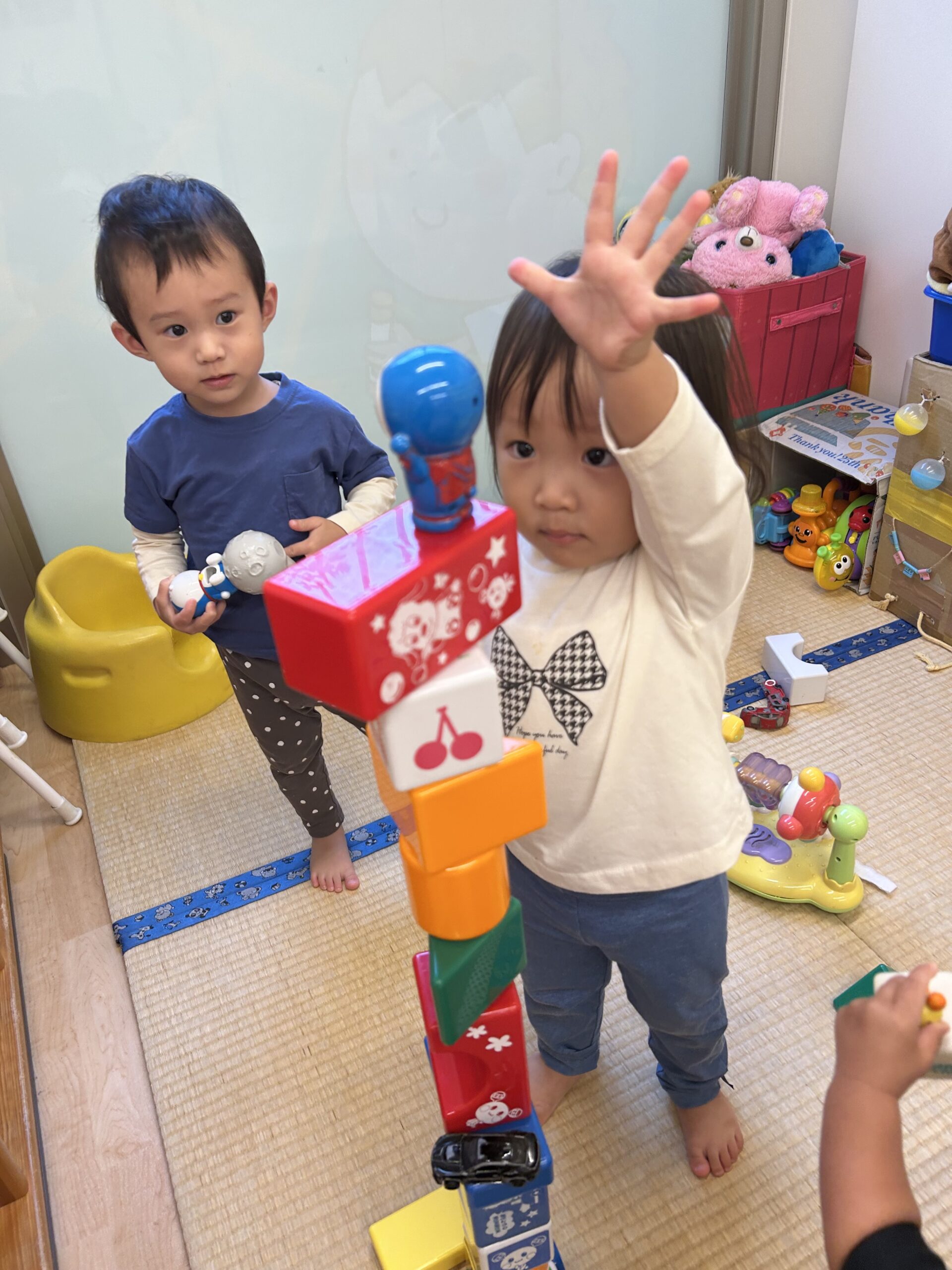 慎重に自分の背より大きく積み重ねられたね!すご〜い