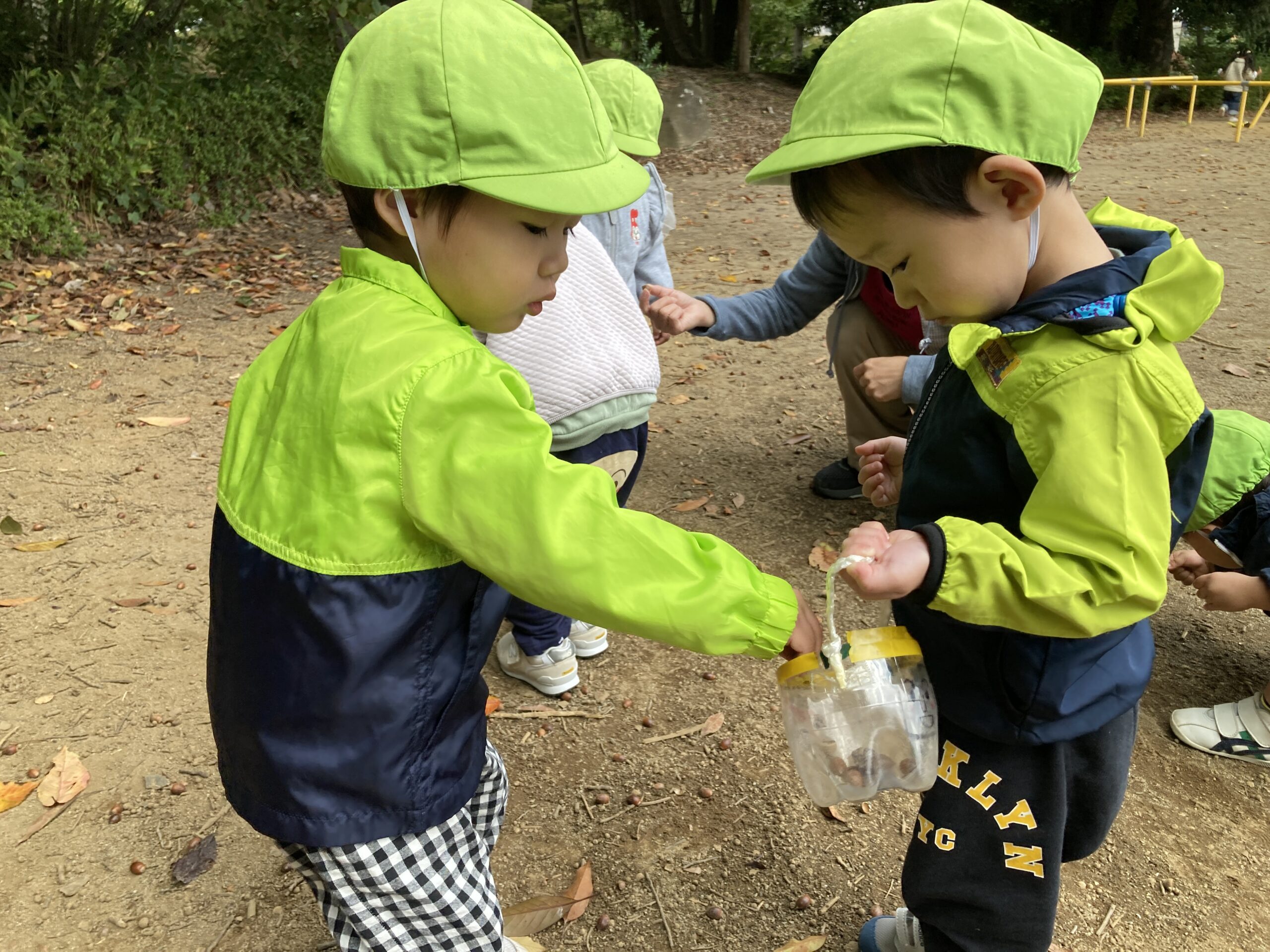「僕のどんぐり入れておいてね」持っていった入れ物にみんなで拾ったどんぐりを持って帰ります。
