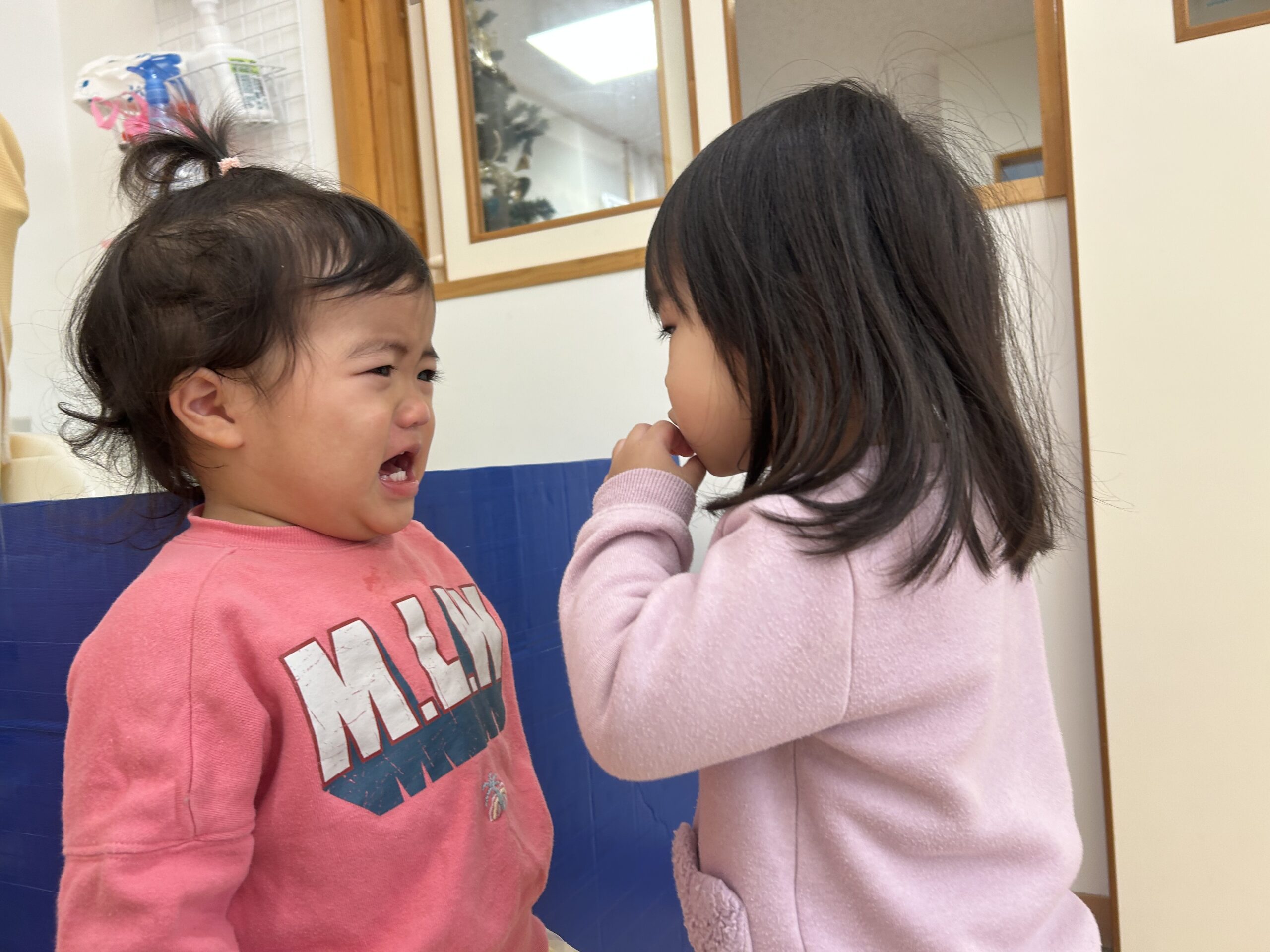 泣いてるお友達を一生懸命慰めてくれるお姉さんです。