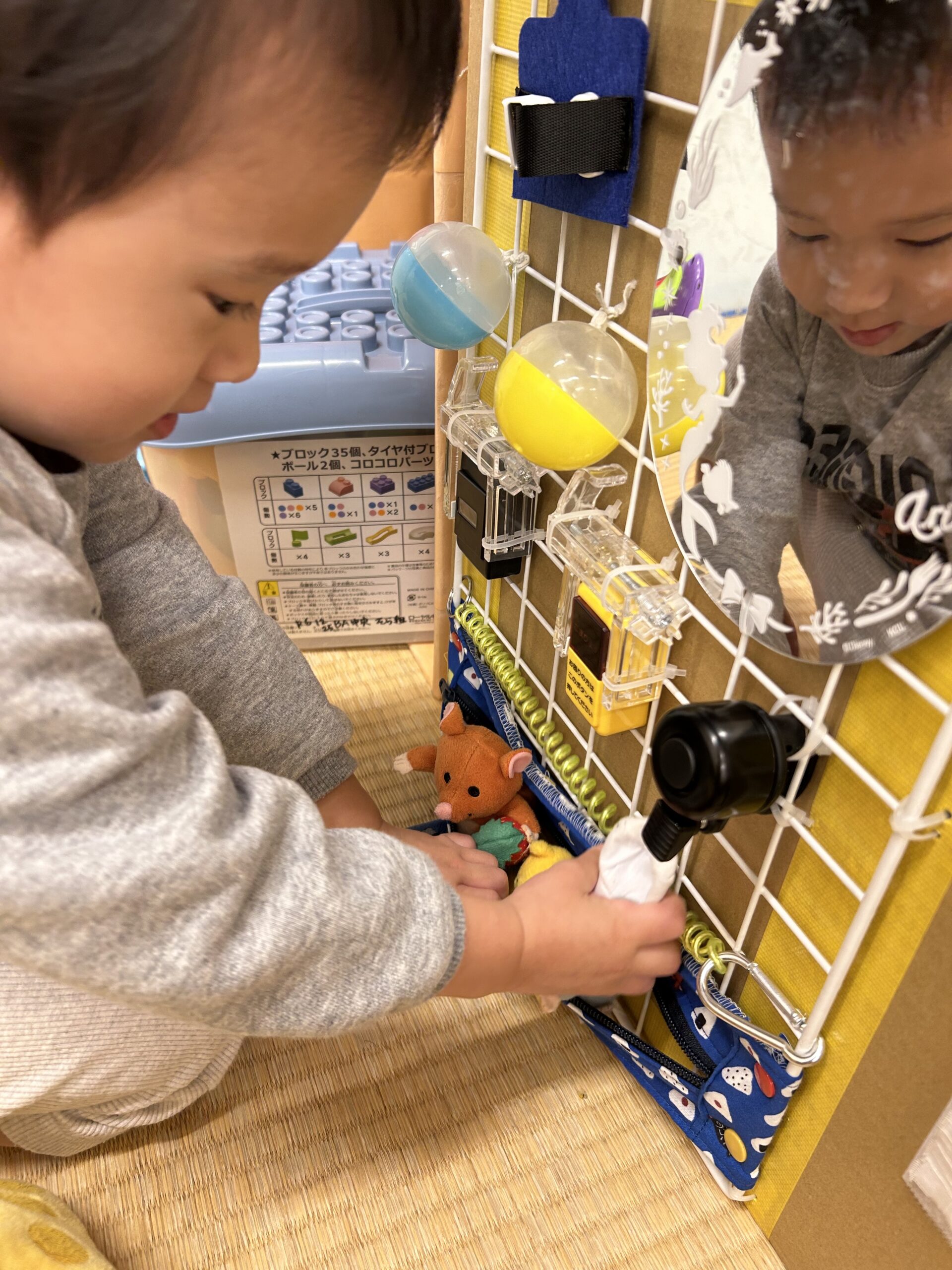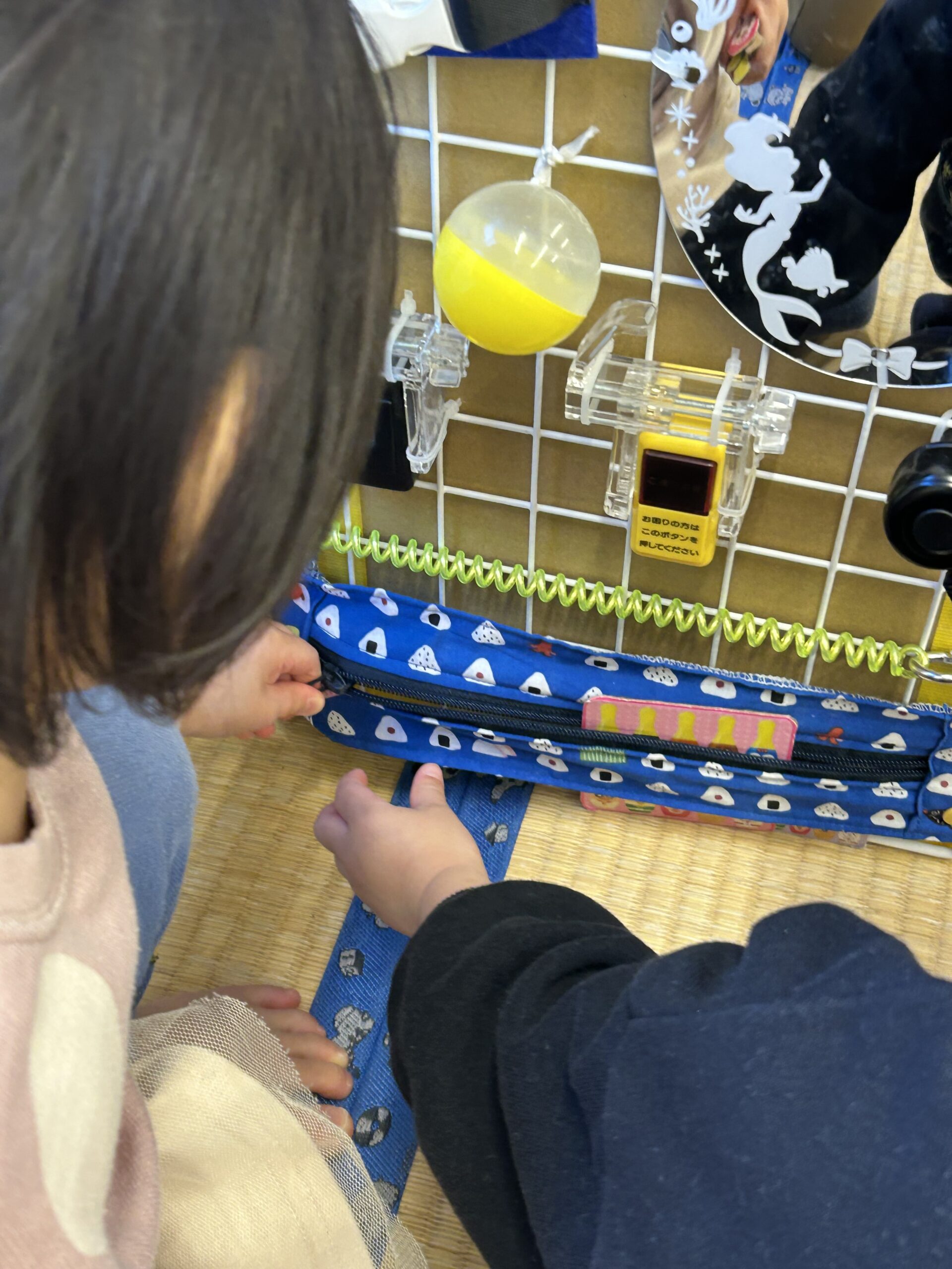 お部屋では手作りの指先おもちゃが大人気!引っ張ったり、マジックテープを剥がしたり、チャックを開けたり閉めたり…0歳児から2歳児まで楽しめます。