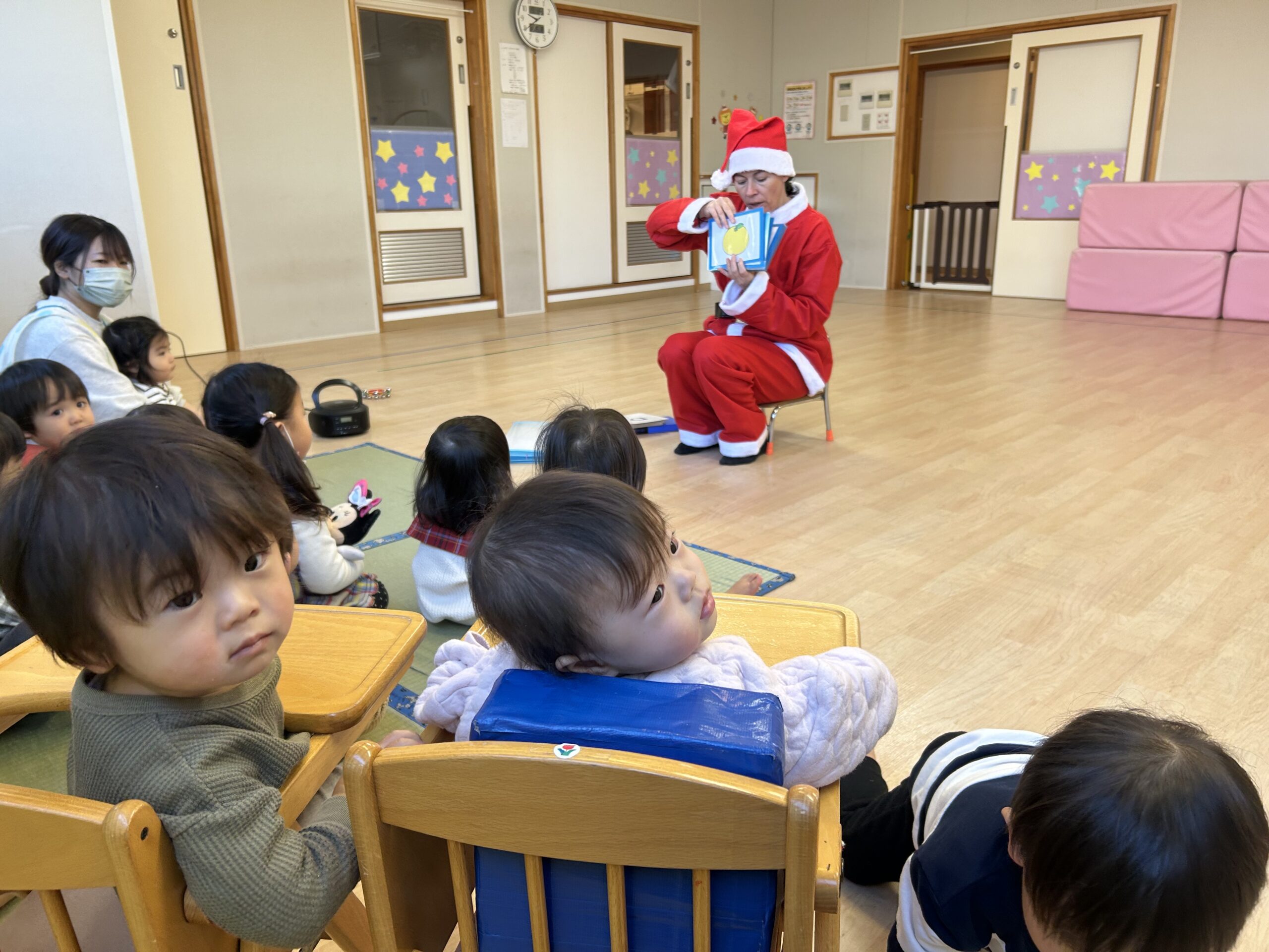 毎週月曜日に参加している英語でも今月は先生がサンタになって来てくださり、シールのプレゼントをもらいました🎁