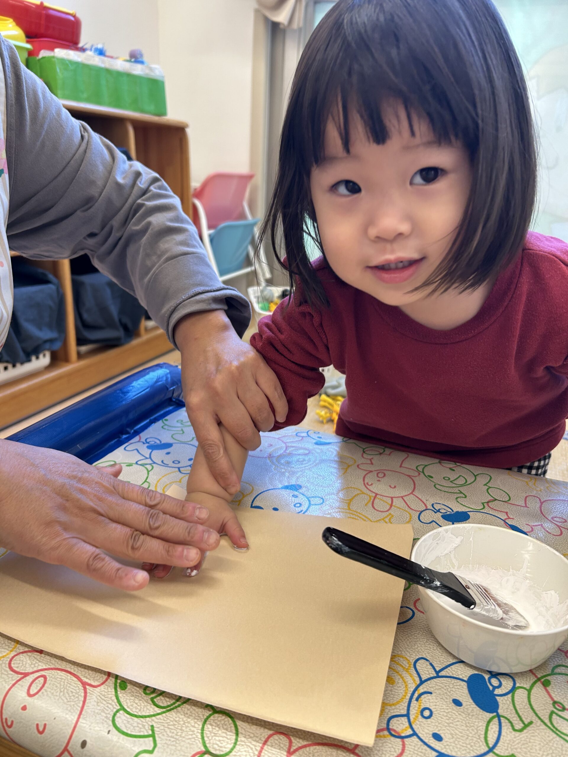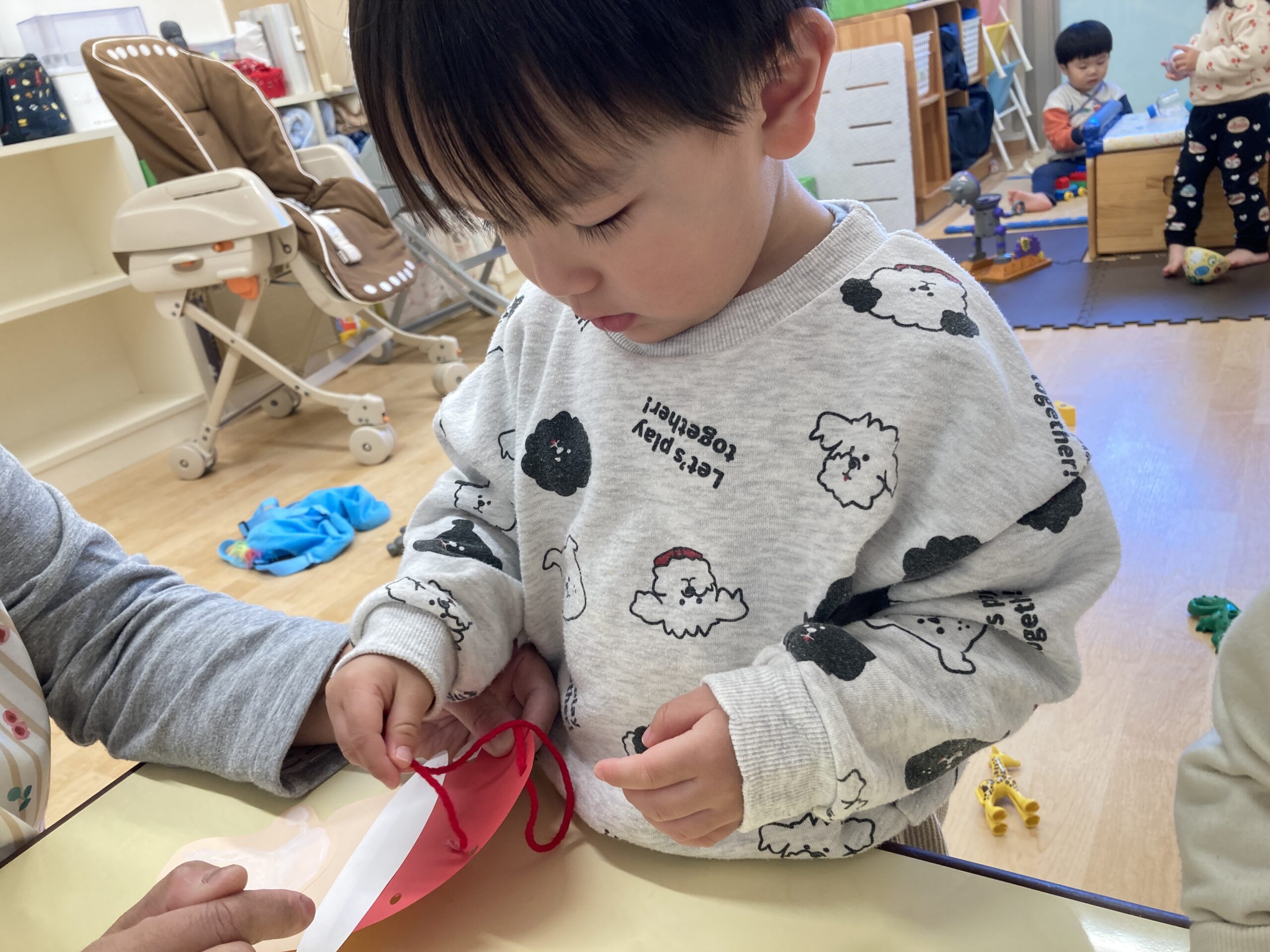 1、2歳児さんは手形をヒゲにして、顔はシールを貼り、帽子はひも通しやシール貼りをして〝サンタさん”を作りました♪年齢や月齢に応じて無理なく楽しめる製作で毎月取り組んでいます。