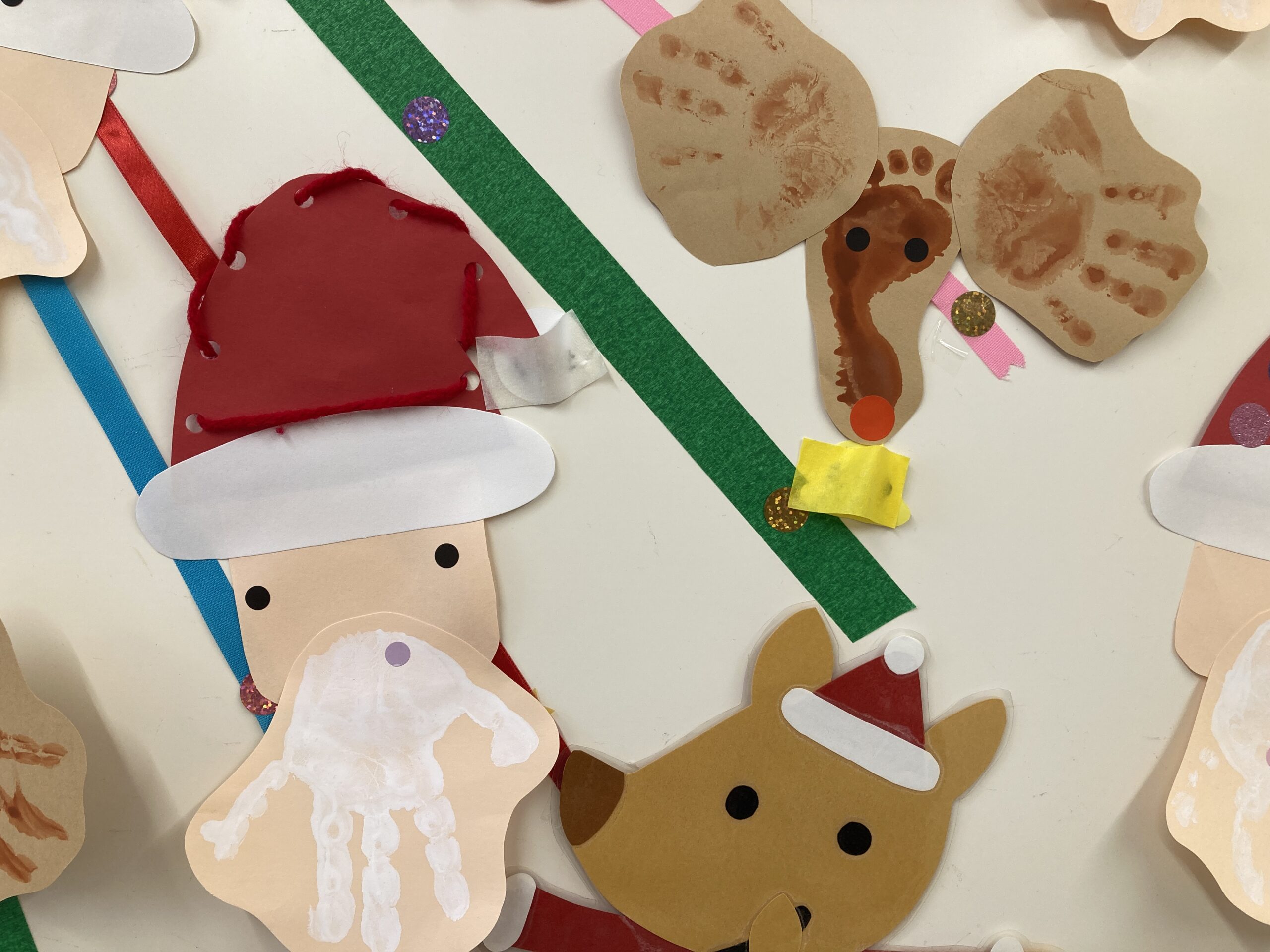 今月の壁面は、0歳児さんはかわいい手形と足形で〝トナカイ‘’を作りました♪