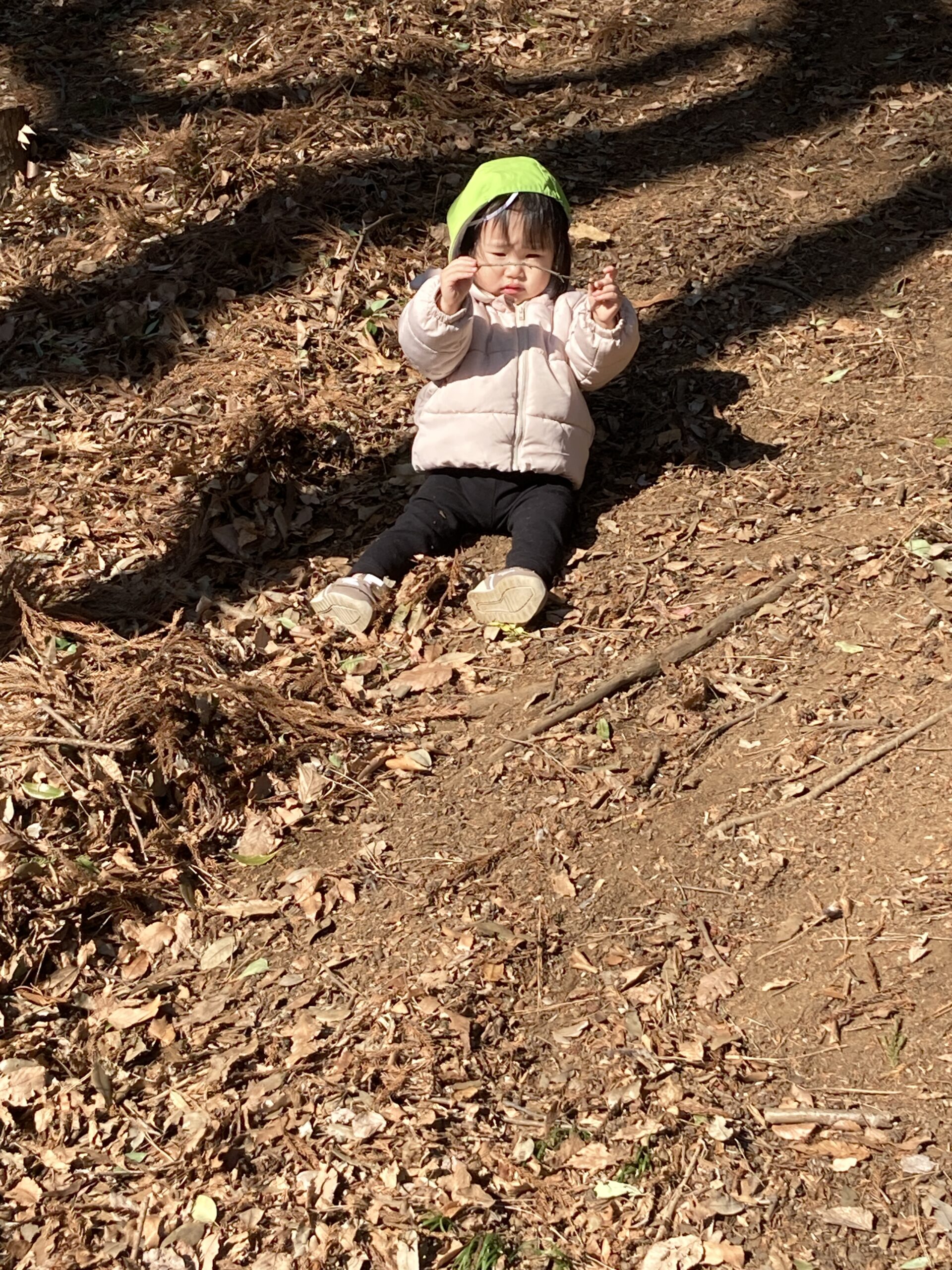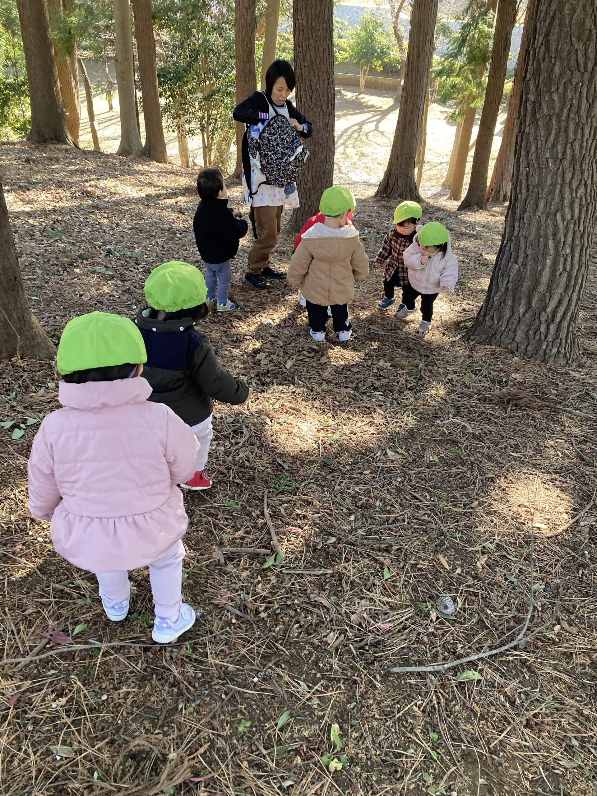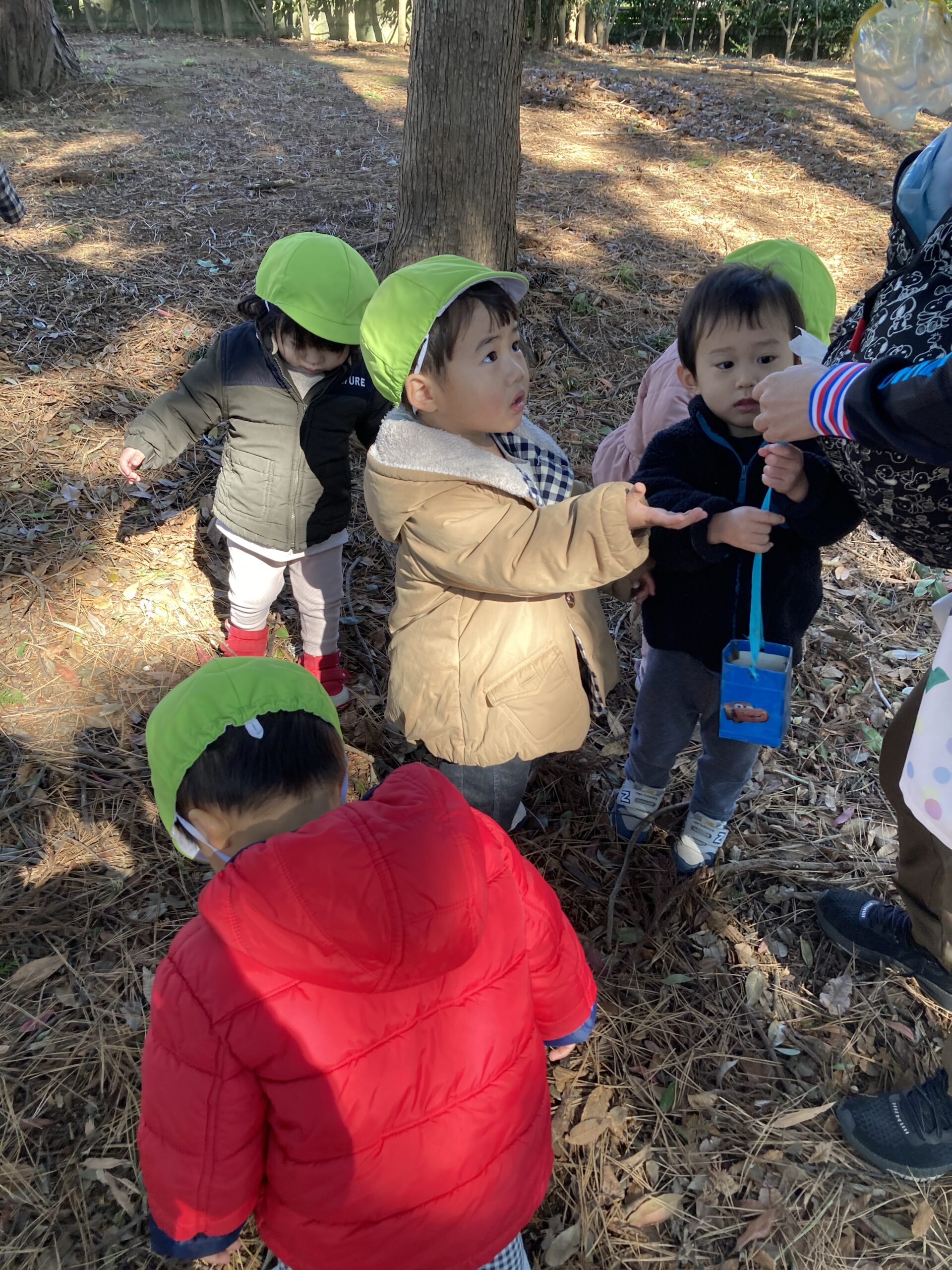 公園に着くと松ぼっくりやどんぐり拾い、木の枝に気をつけながら山の斜面を登っては降りてを何度も繰り返して全身を使って遊びます。拾った自然物は大事に袋に入れて持って帰ります。