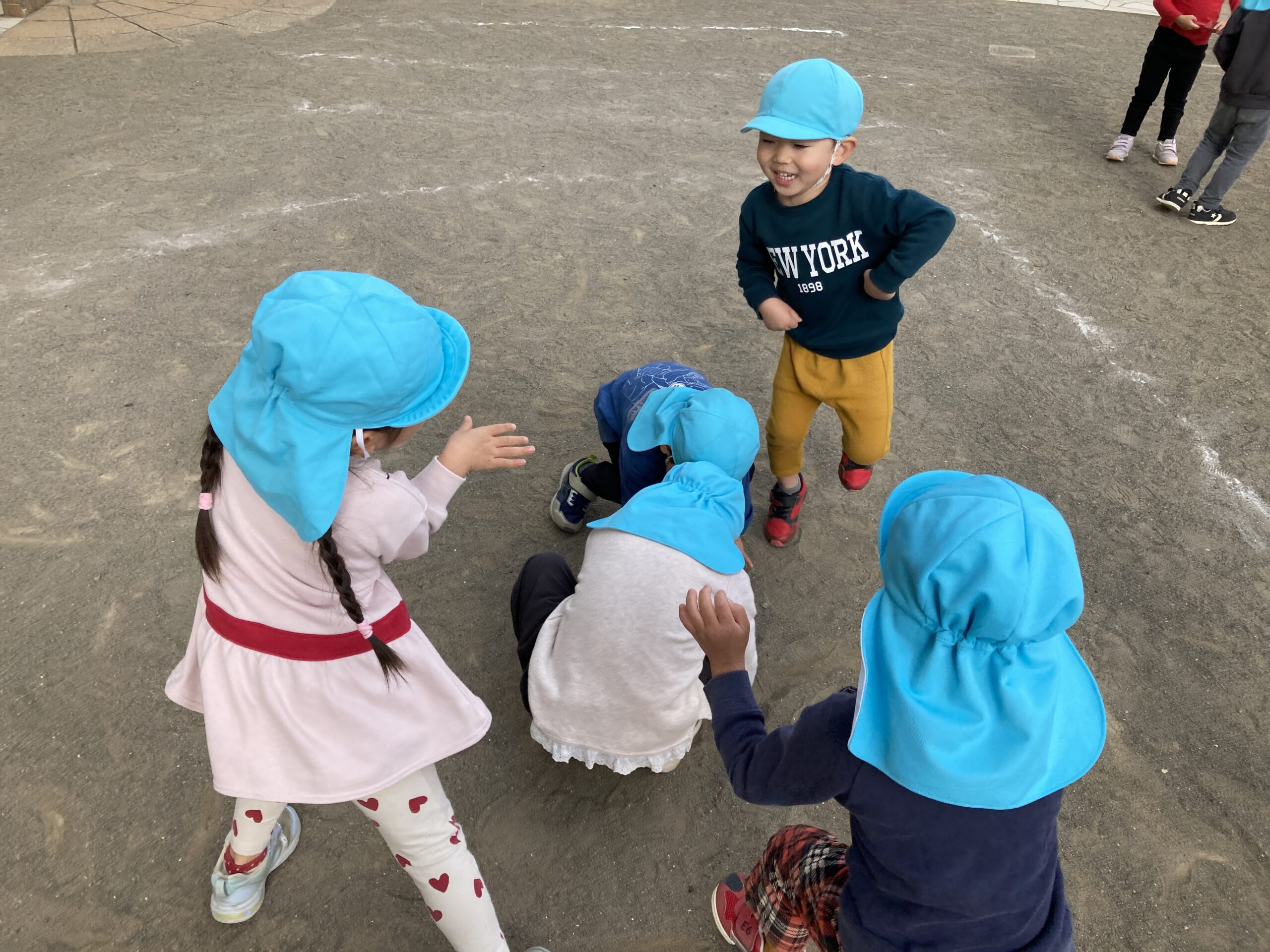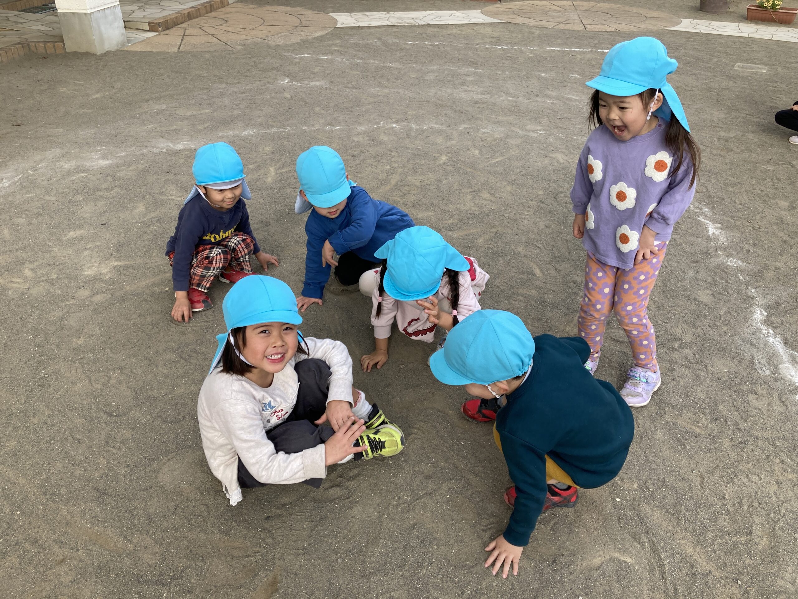 12月の寒さの中でも、子どもたちは元気いっぱい!園庭では鬼ごっこや砂遊びを楽しみ、体を動かすたびに笑顔が広がっています。