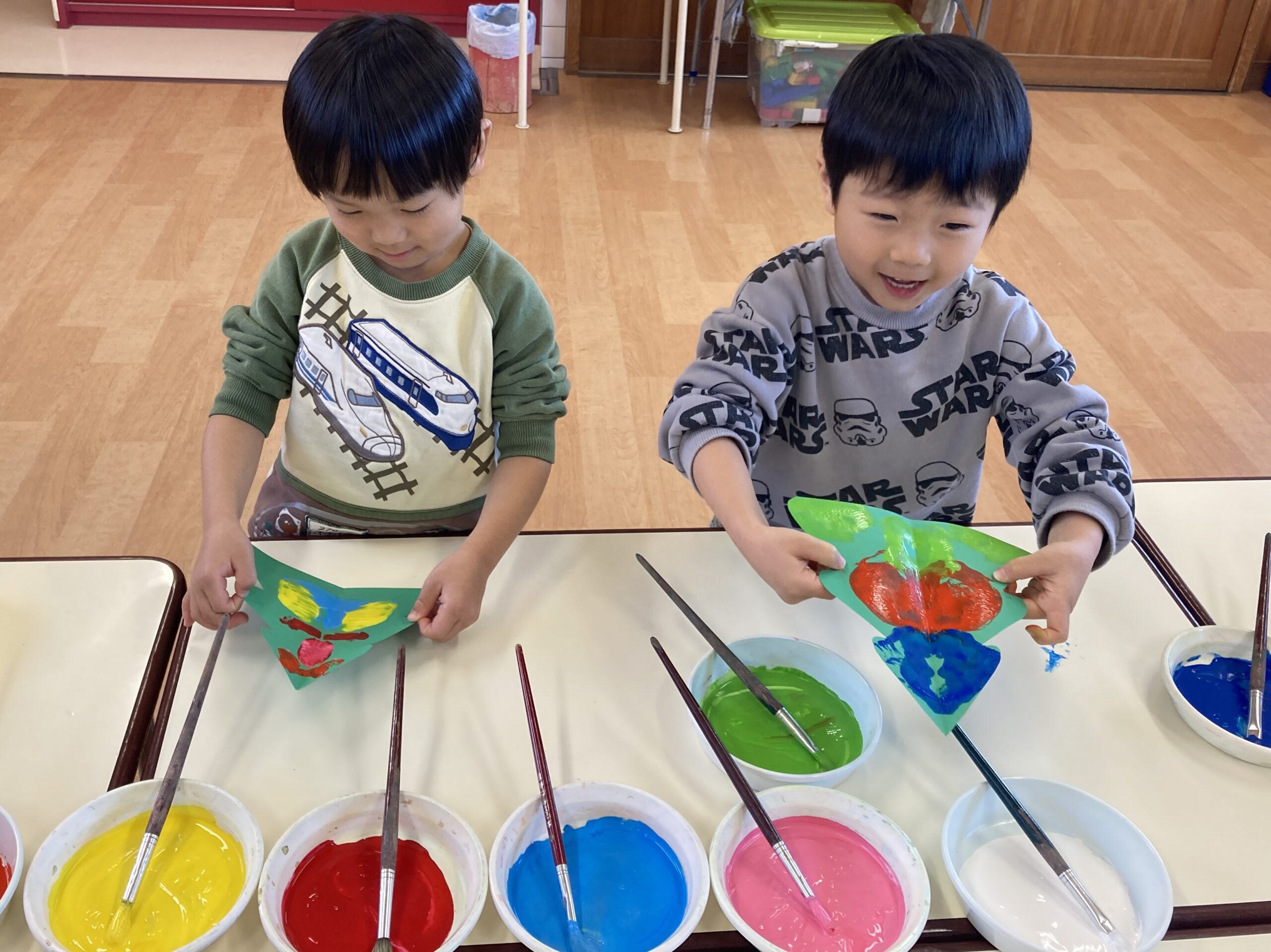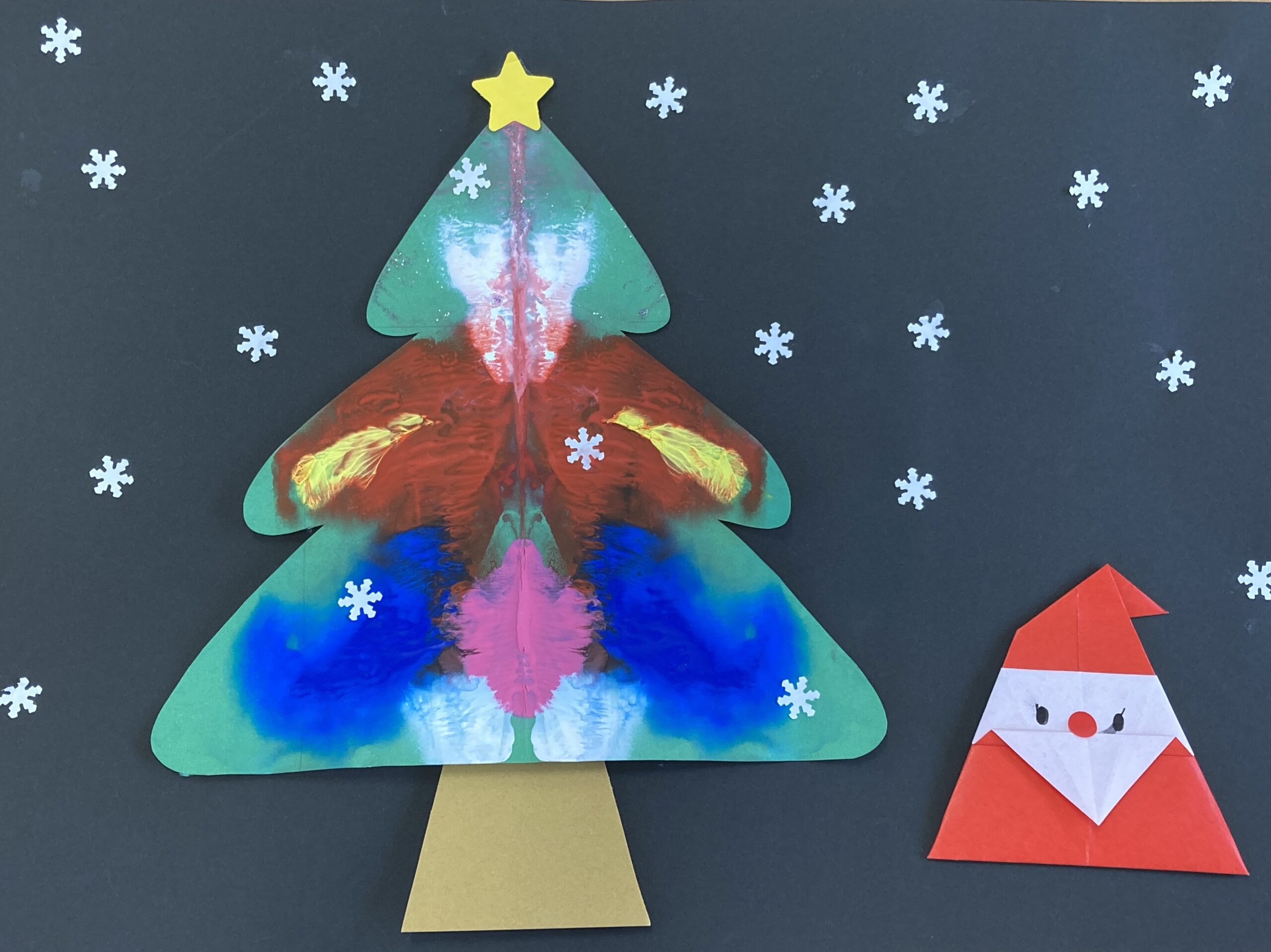 色付けをした後はツリーを半分に折り、デカルコマニーを楽しみました。