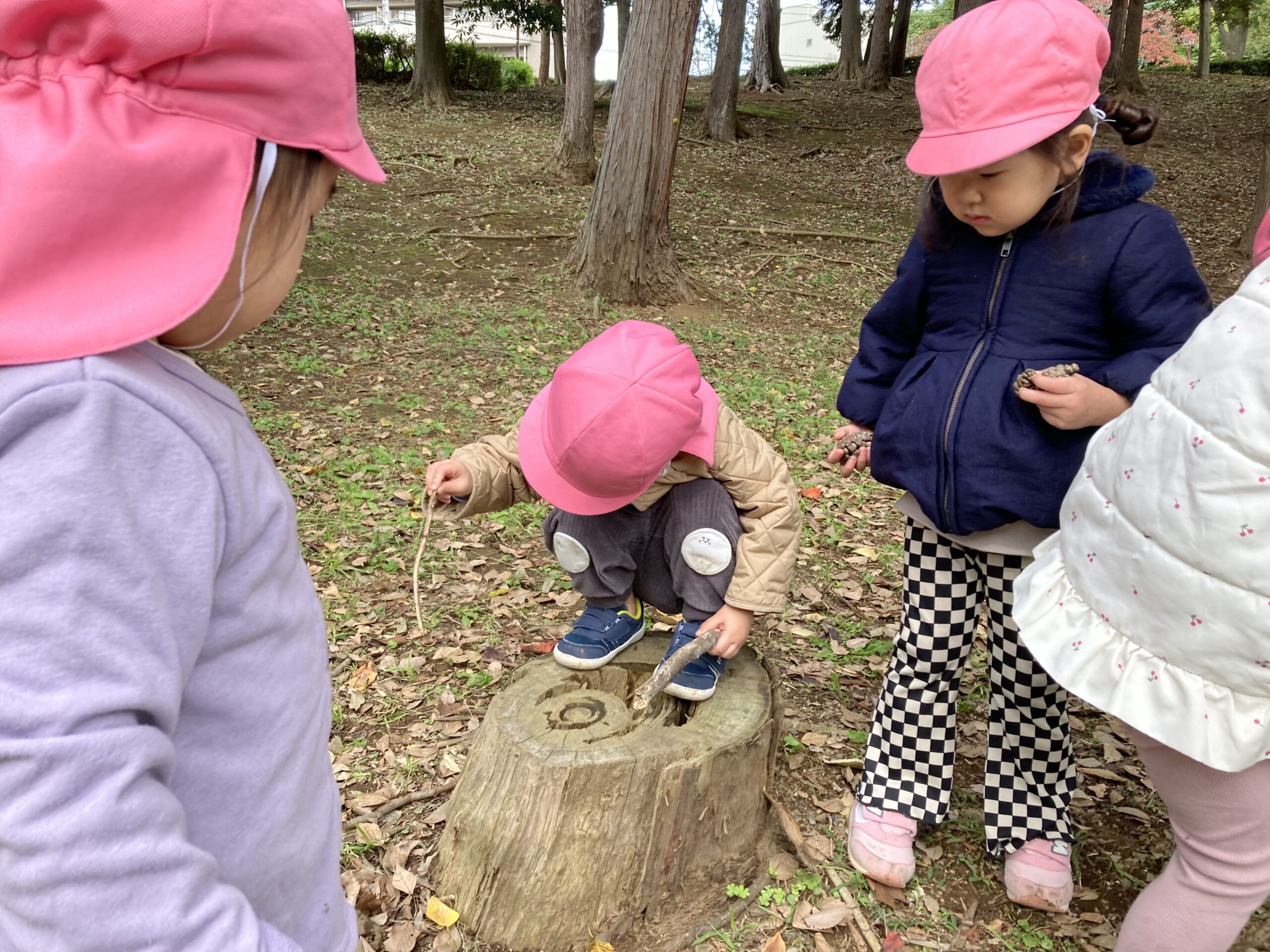 「切り株の中何かあるかな〜?」