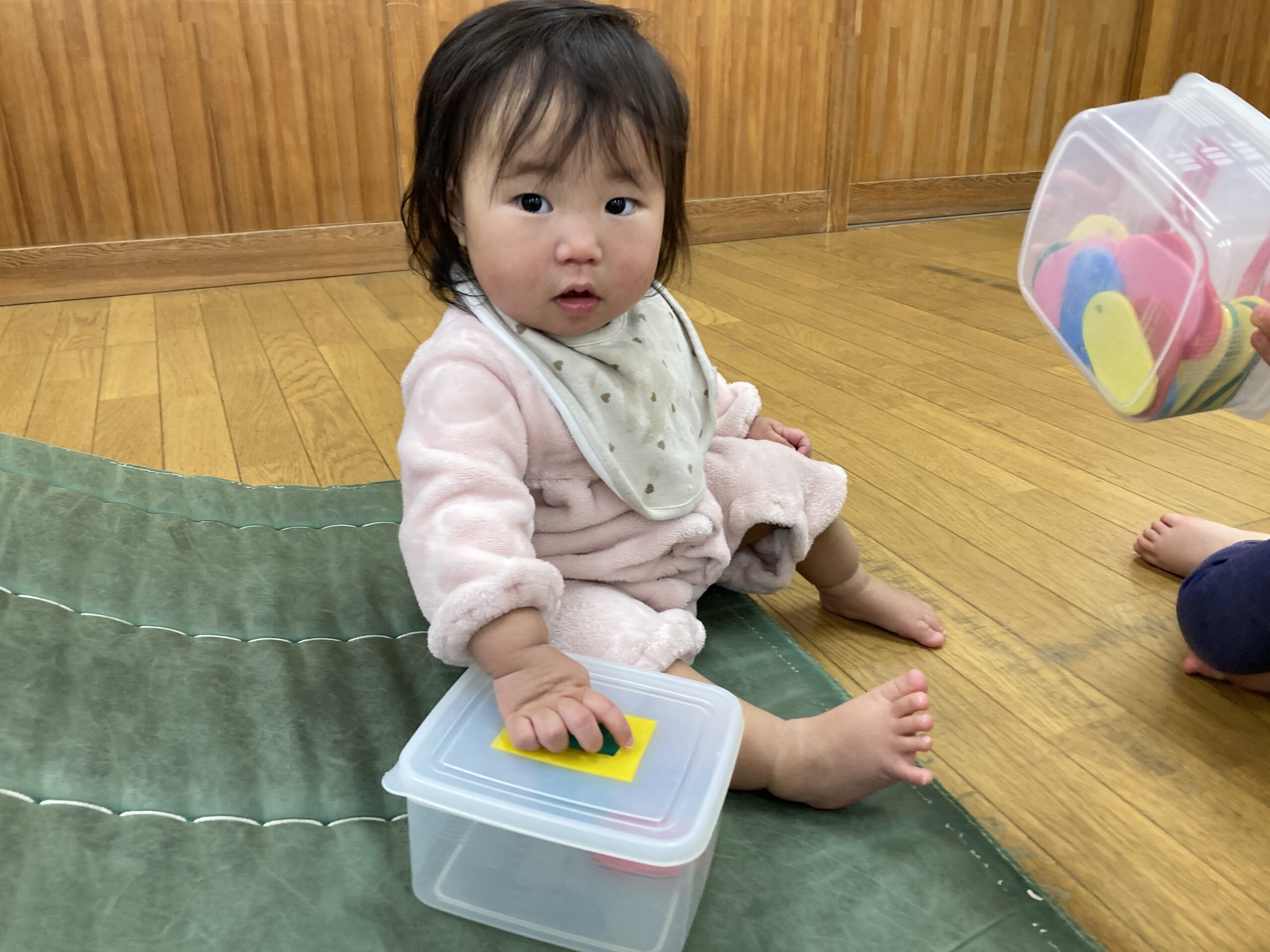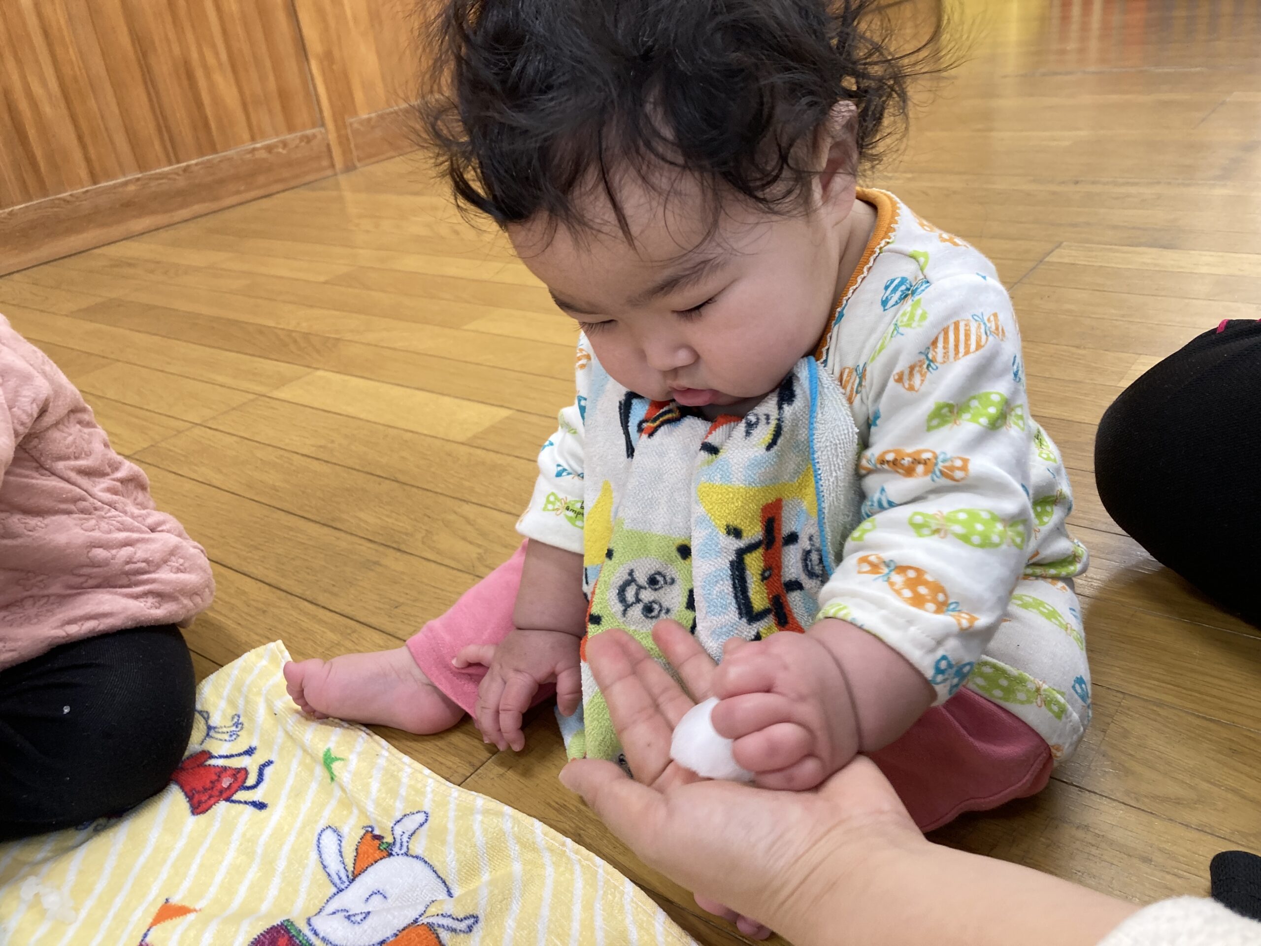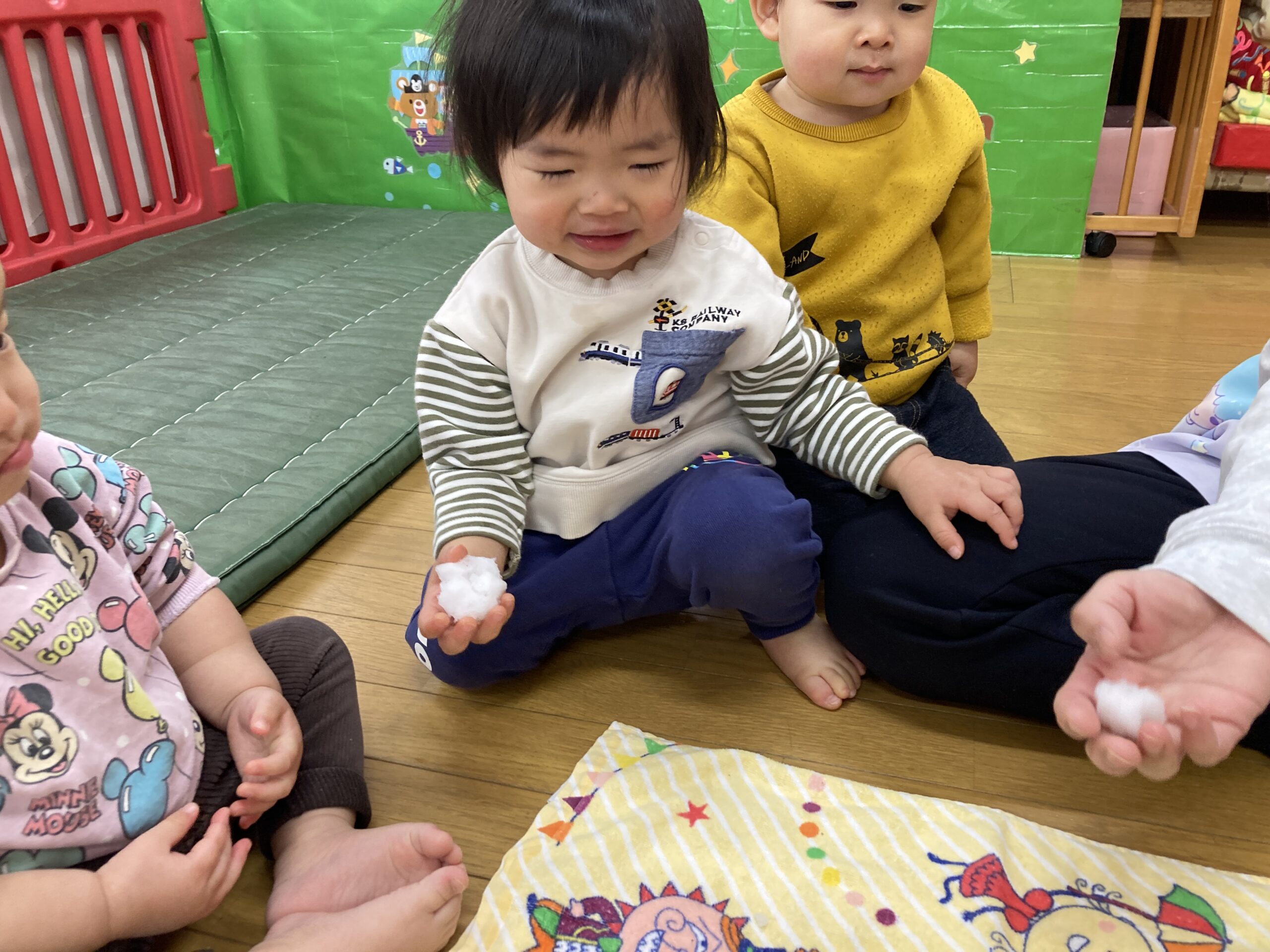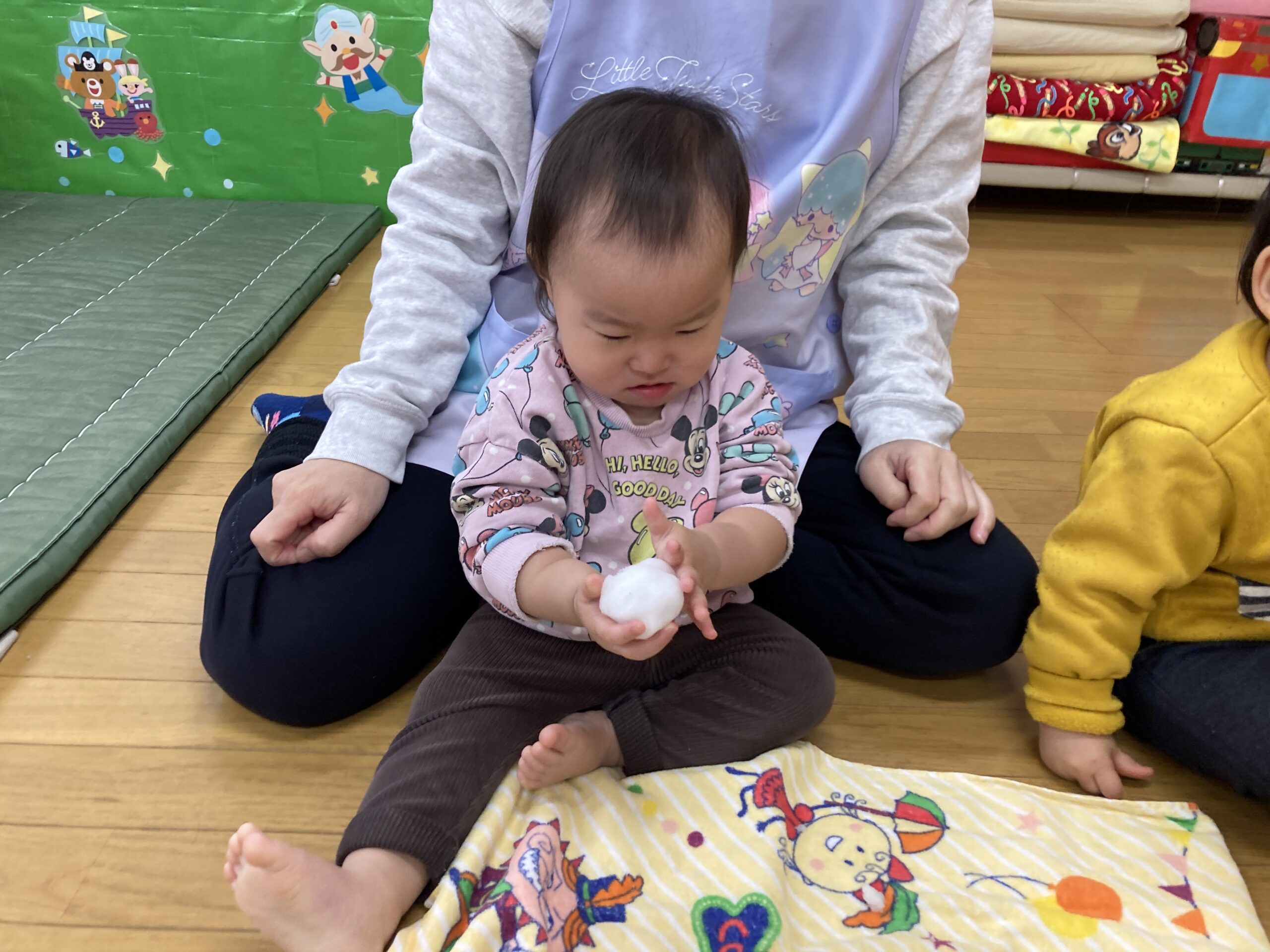恐る恐る触ってみるお友達や、丸めると手を伸ばしてくれたお友達もいました。