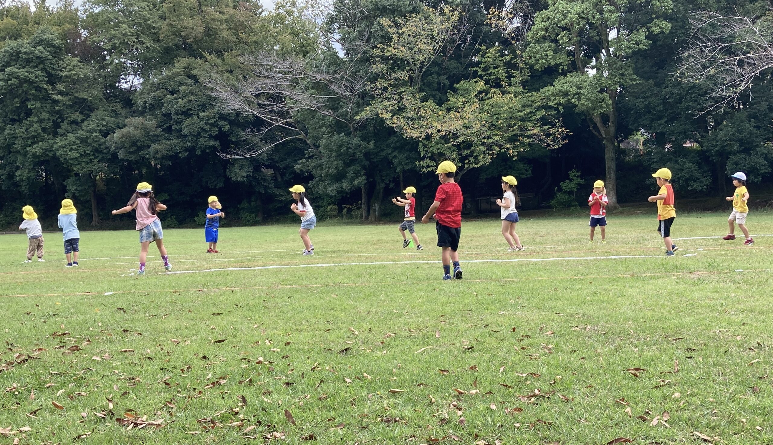 公園について早速ソーランの練習開始!いつも練習している保育園のホールの広さとは違く、その広さに「となりの○○ちゃんが遠いよ・・」と言って、距離を確認していました!