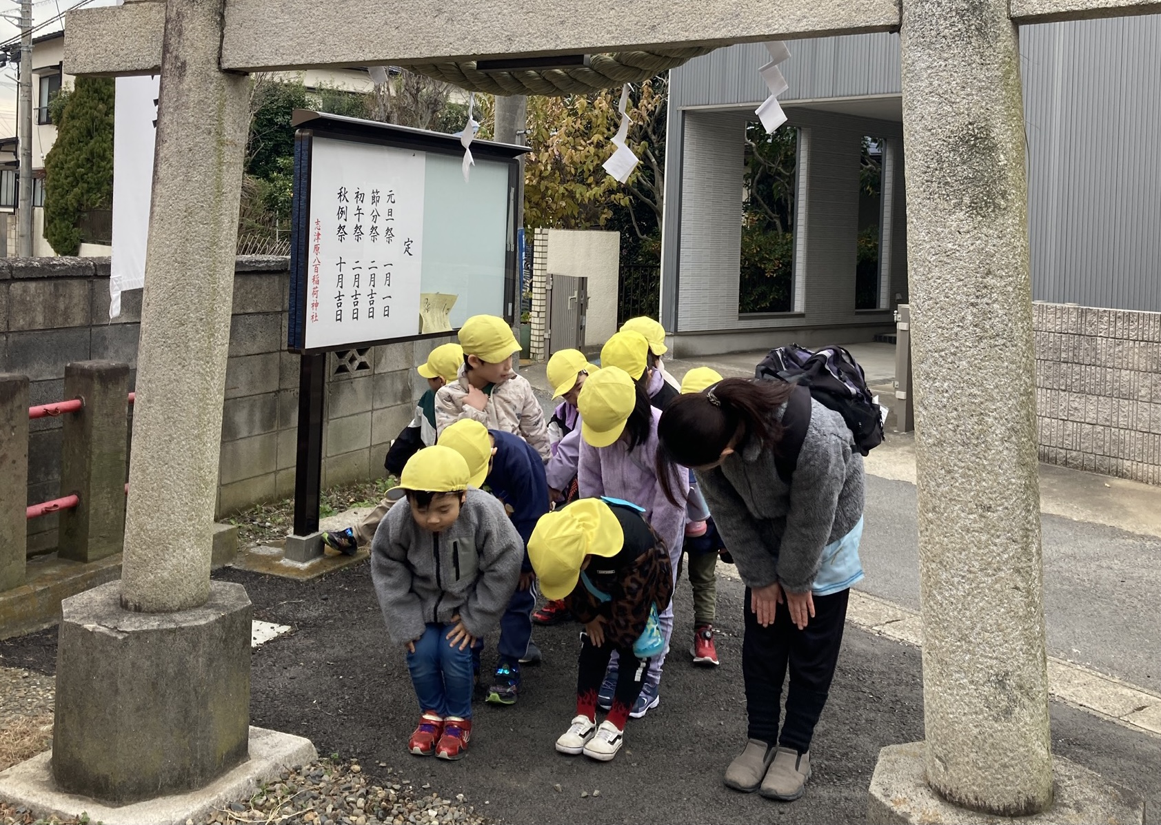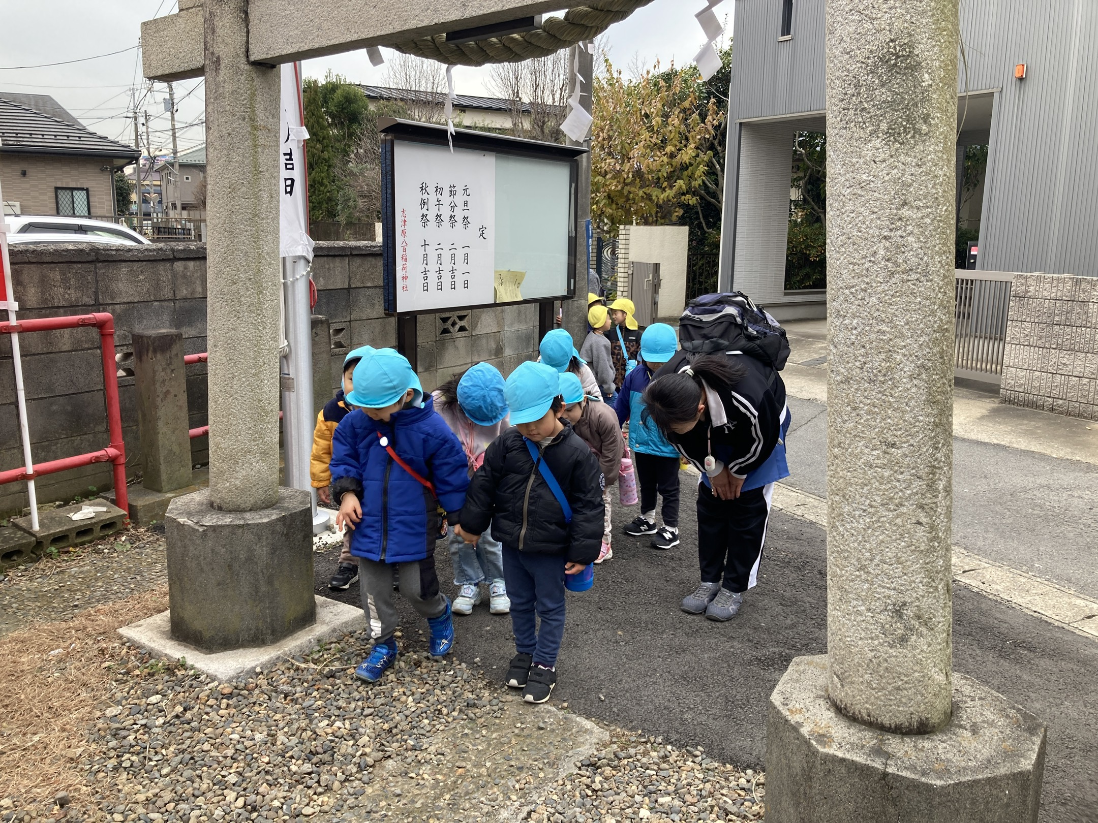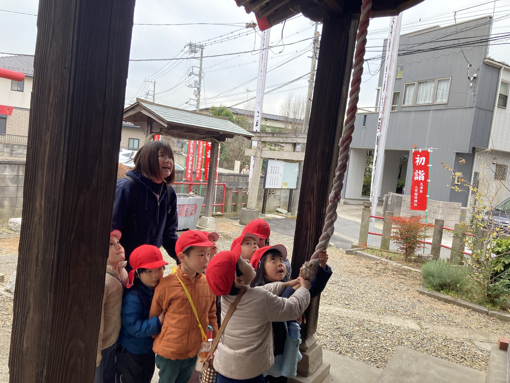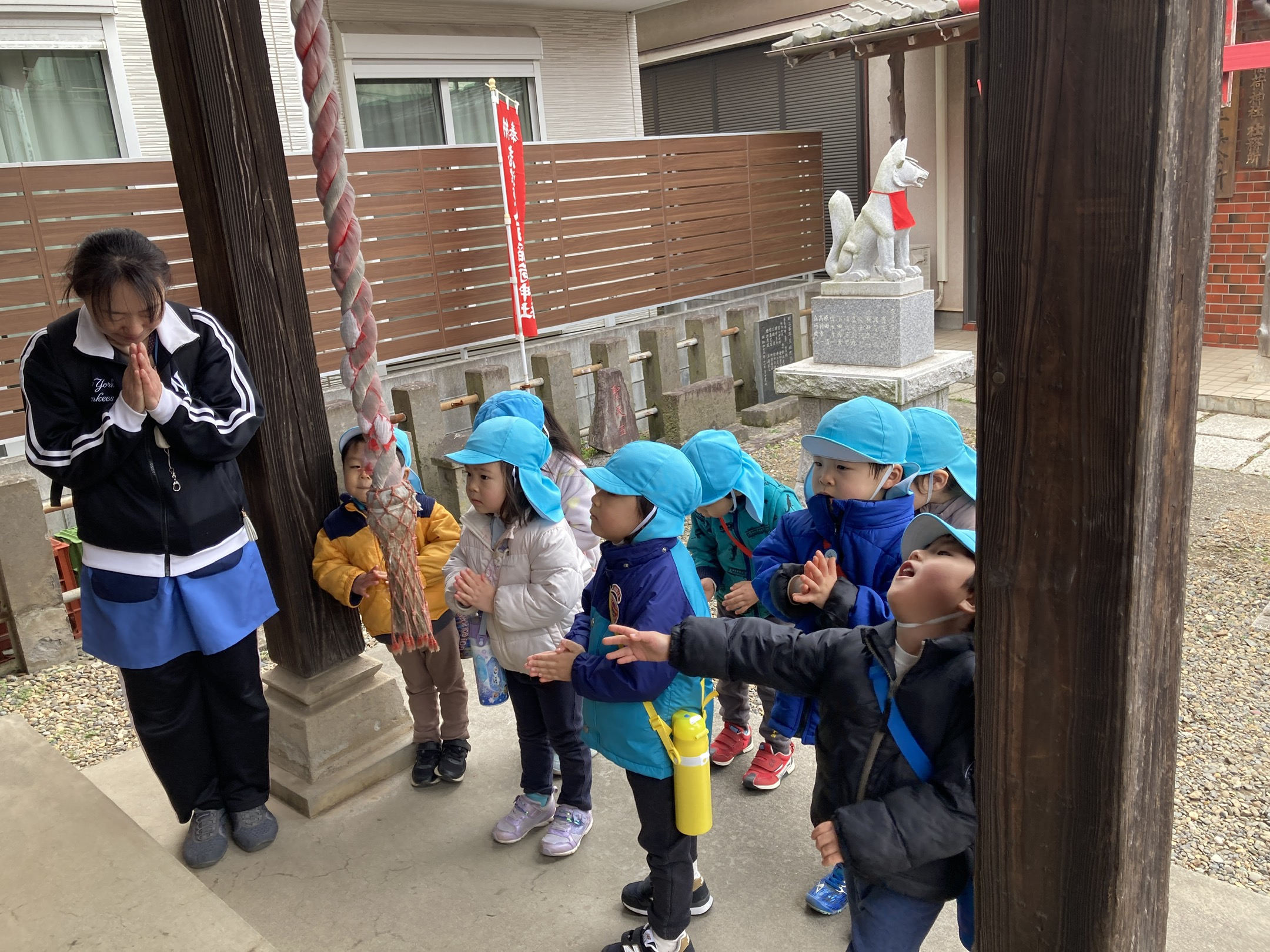 元気に登園してきてくれた子どもたち、今日は近くの稲荷神社に初詣に行ってきました。