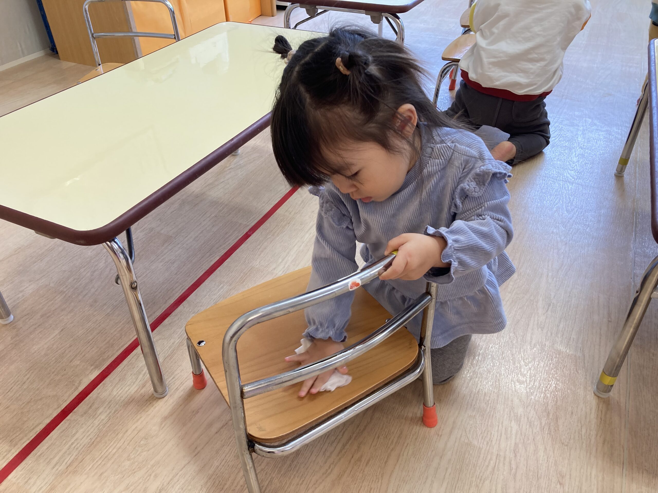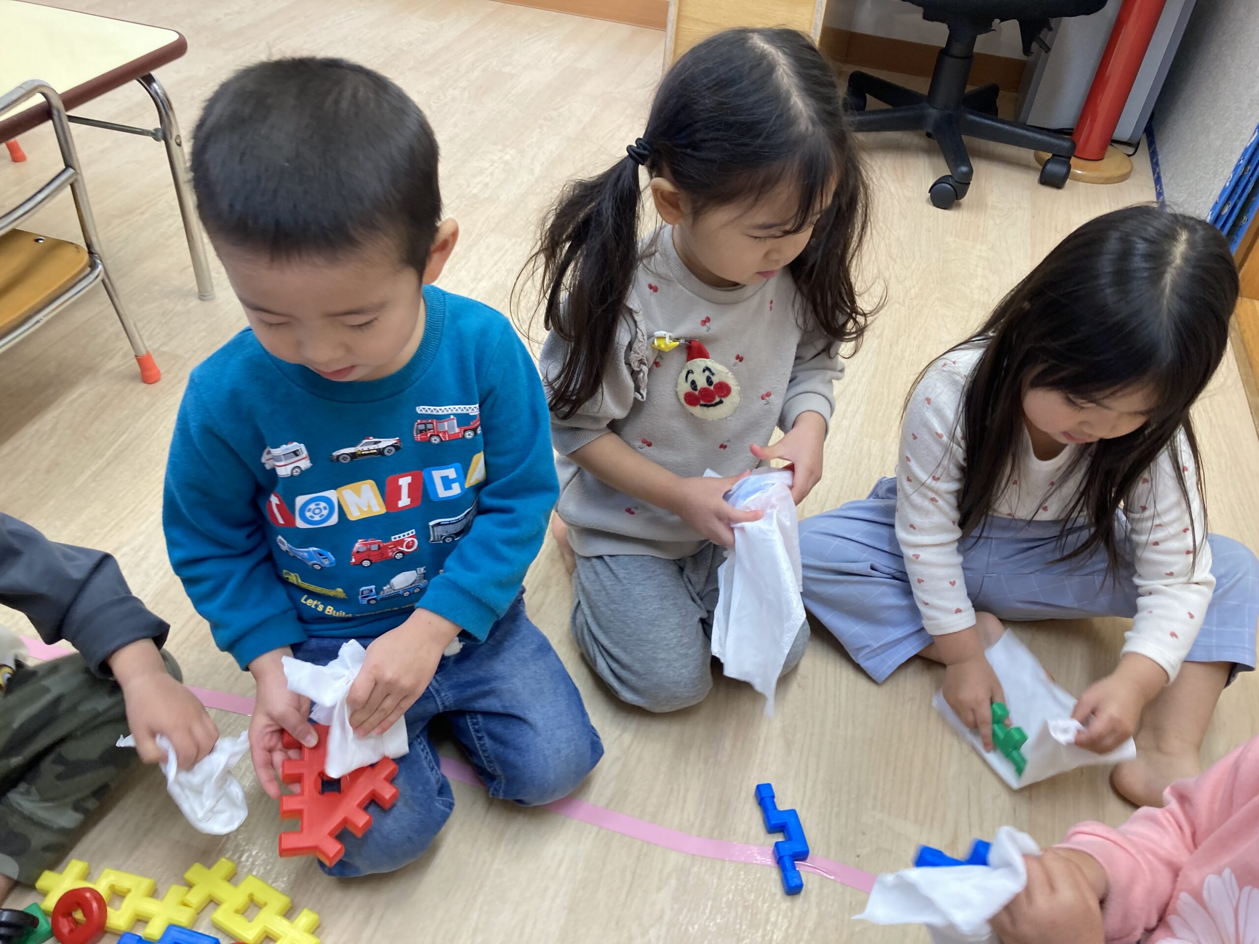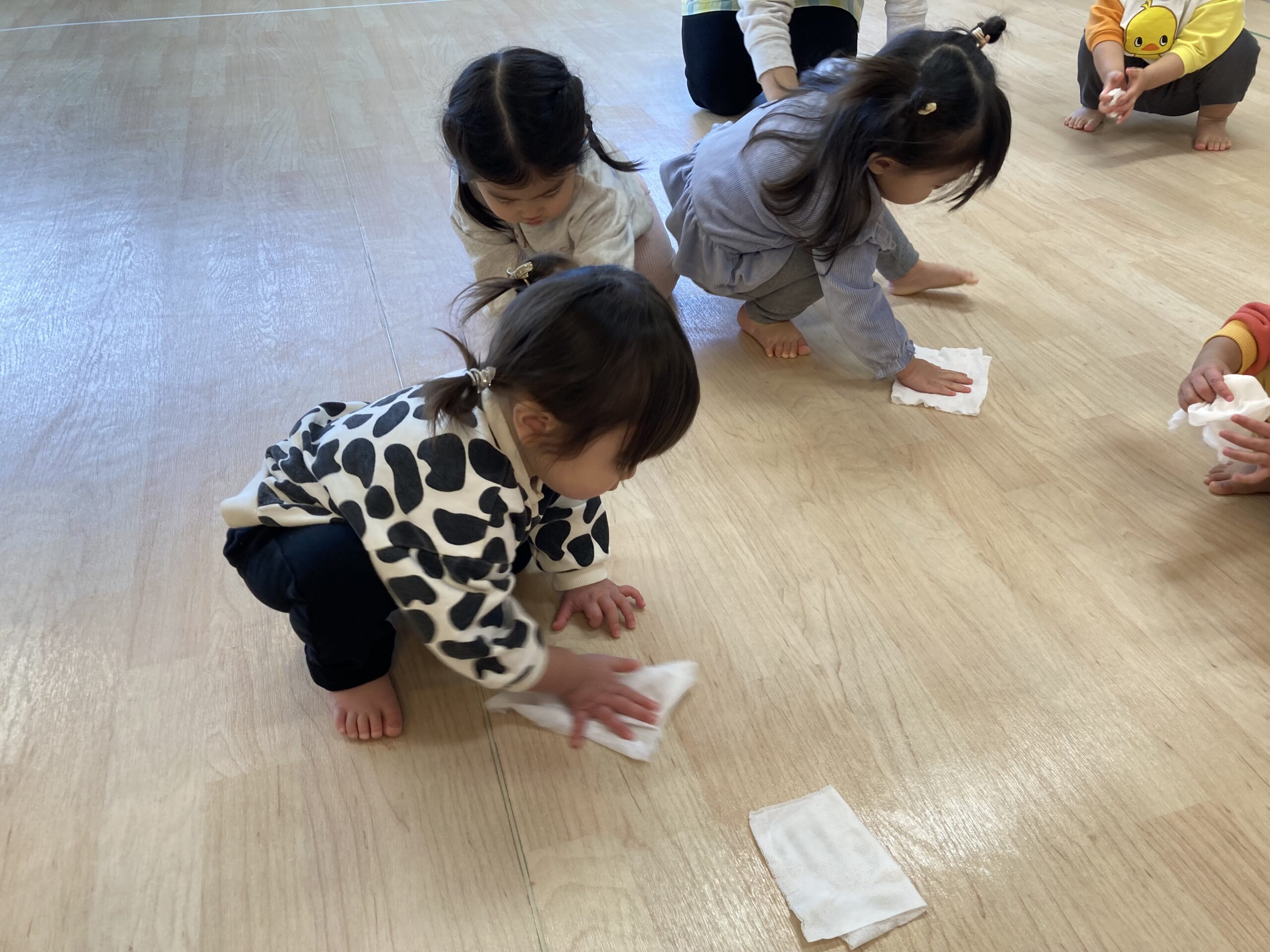 まずは大掃除の話を聞き、お掃除タオルを一人一枚ずつもらいました。どの子もやる気満々で、「ふきふきするの?」と待ちきれない様子でした!