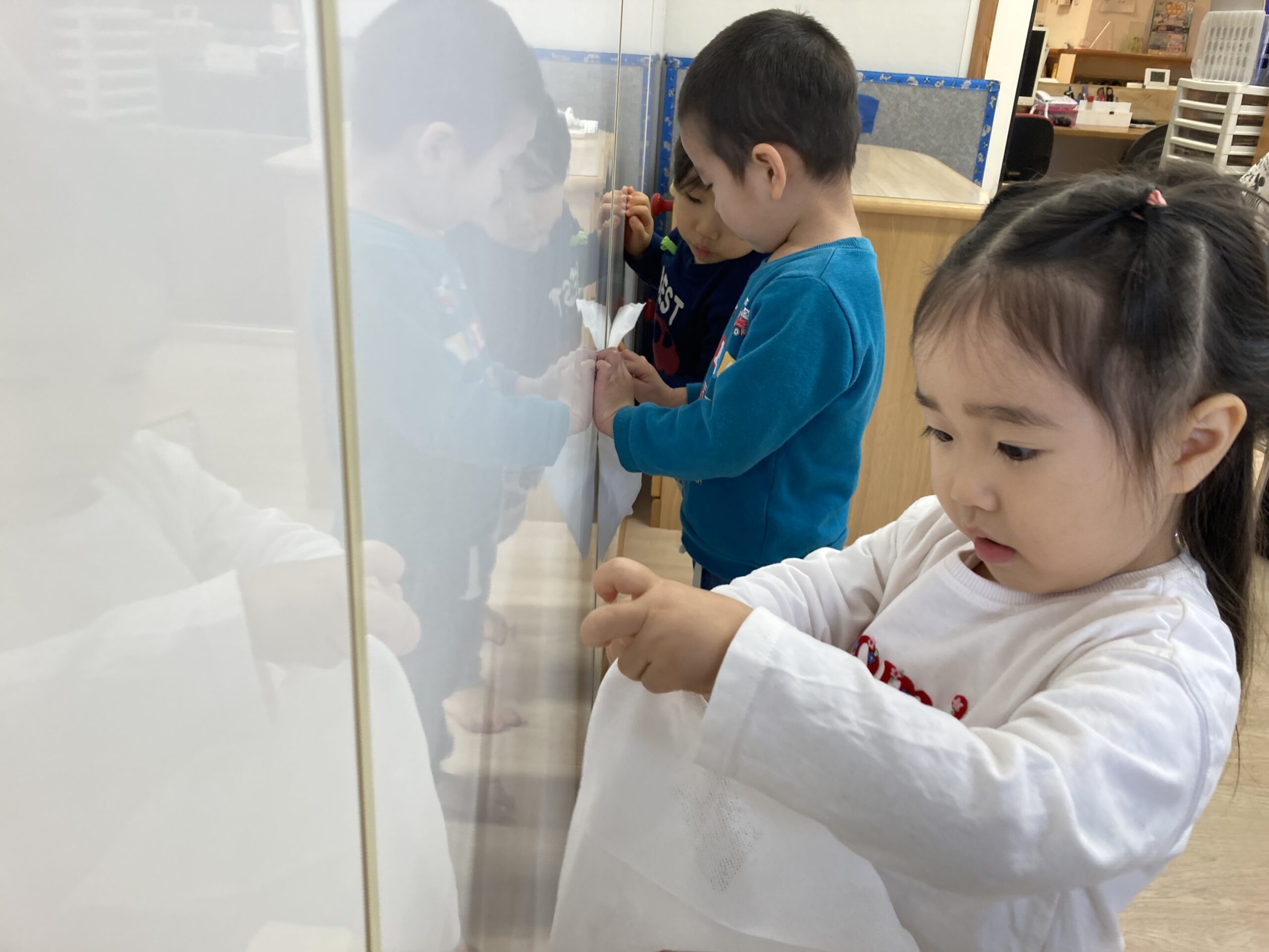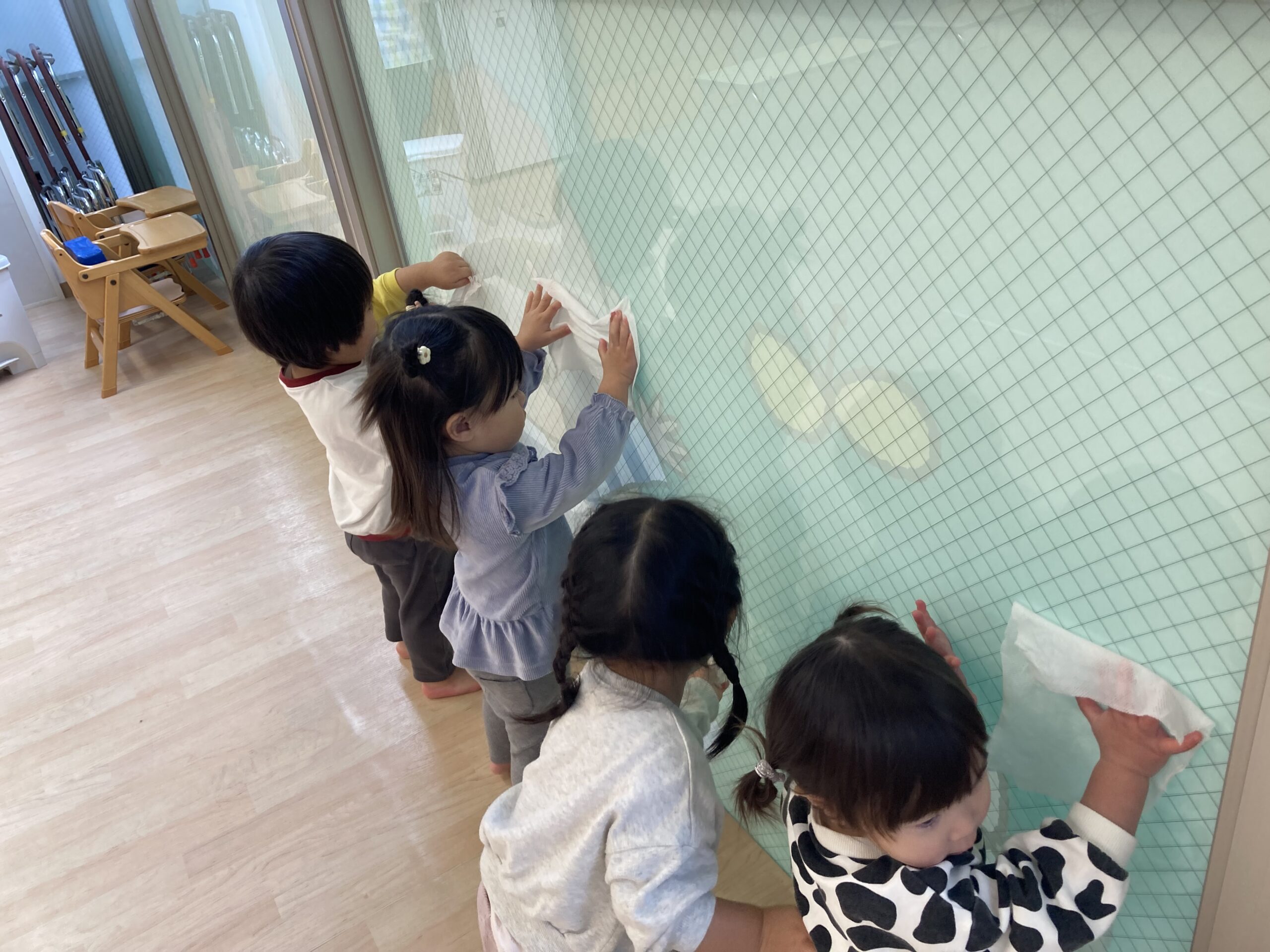 拭くとキュッキュッと音がするのを楽しんでいました。上の方は背伸びをしながら、下の方はしゃがみながら一生懸命拭いていましたよ🎵