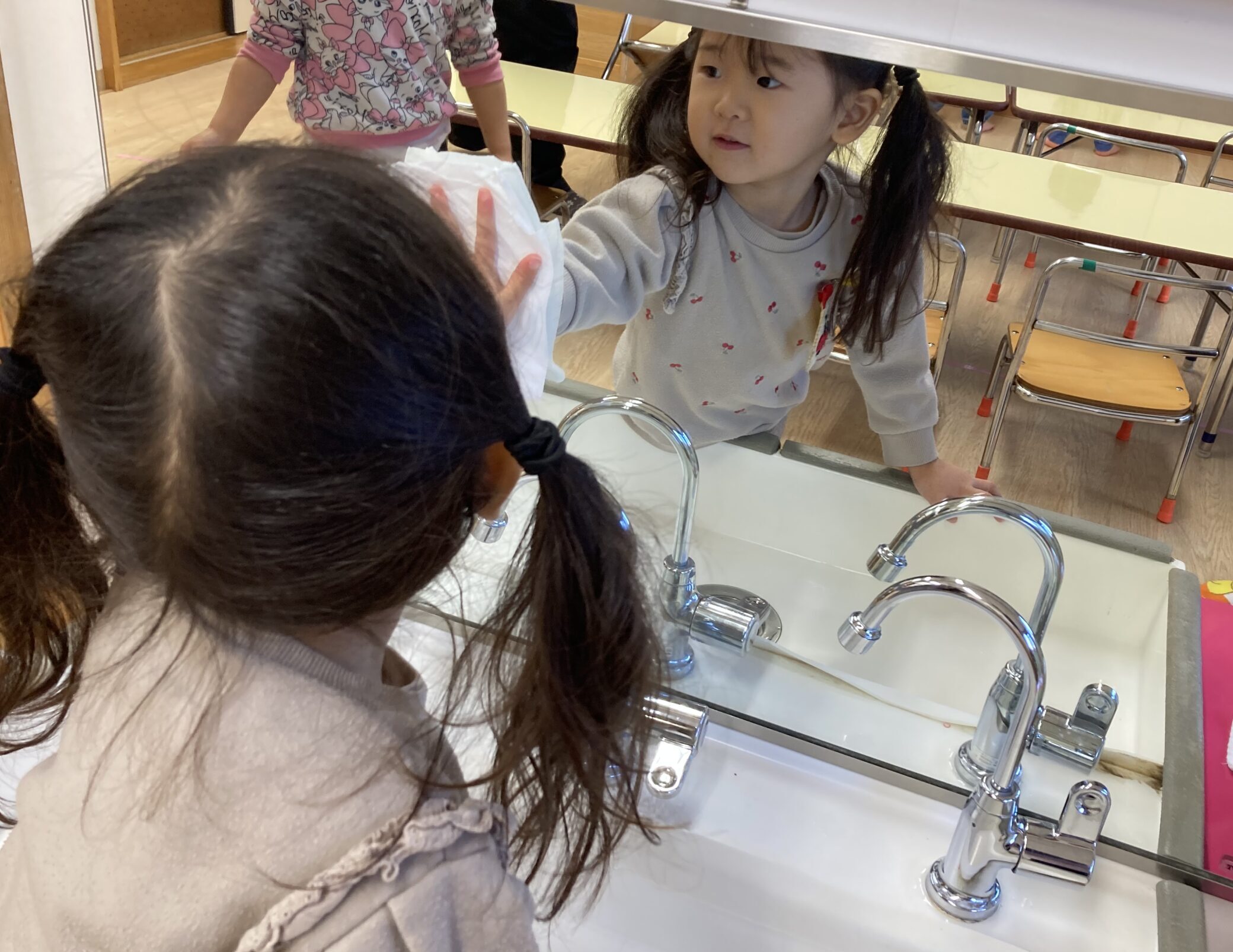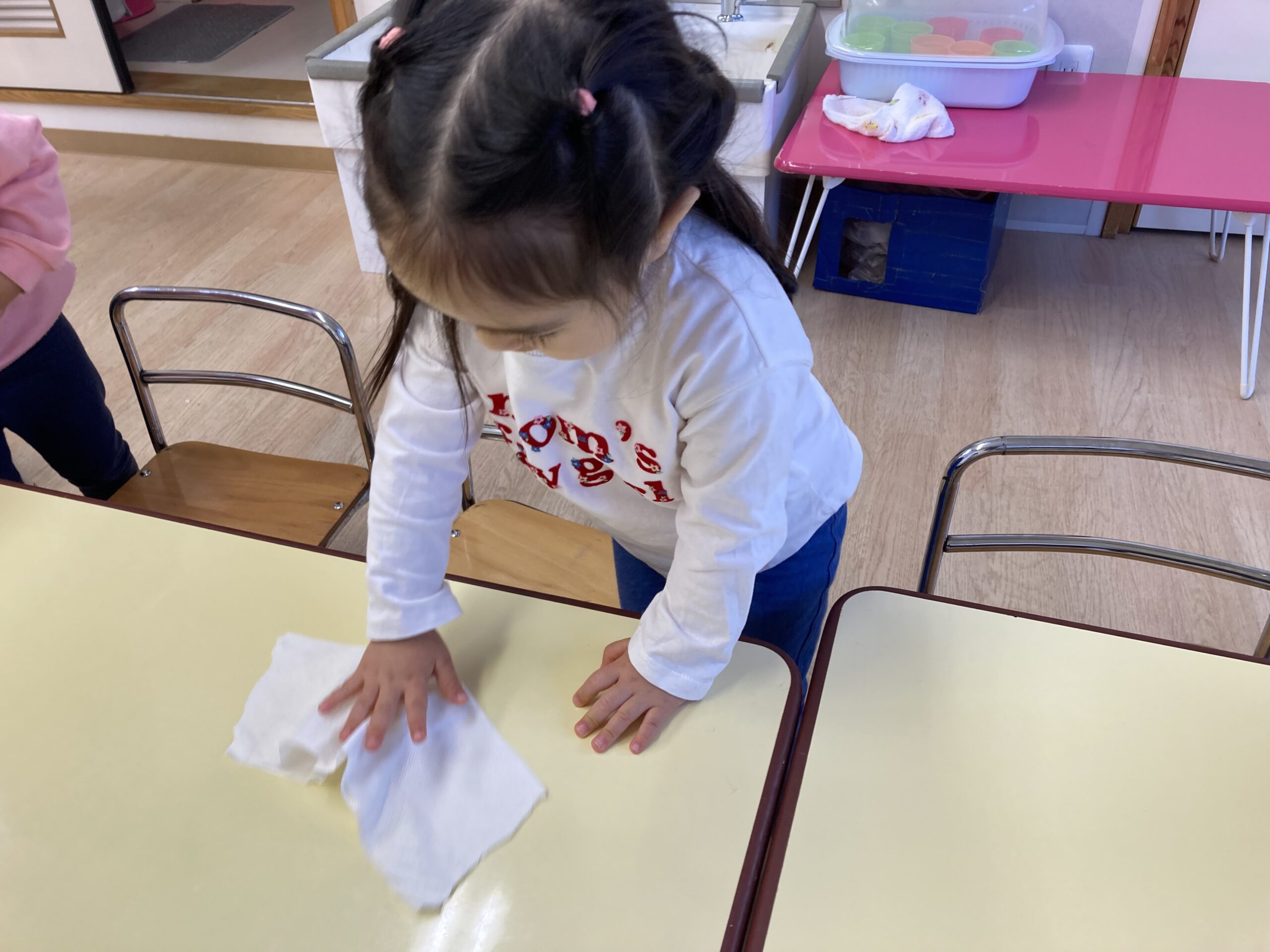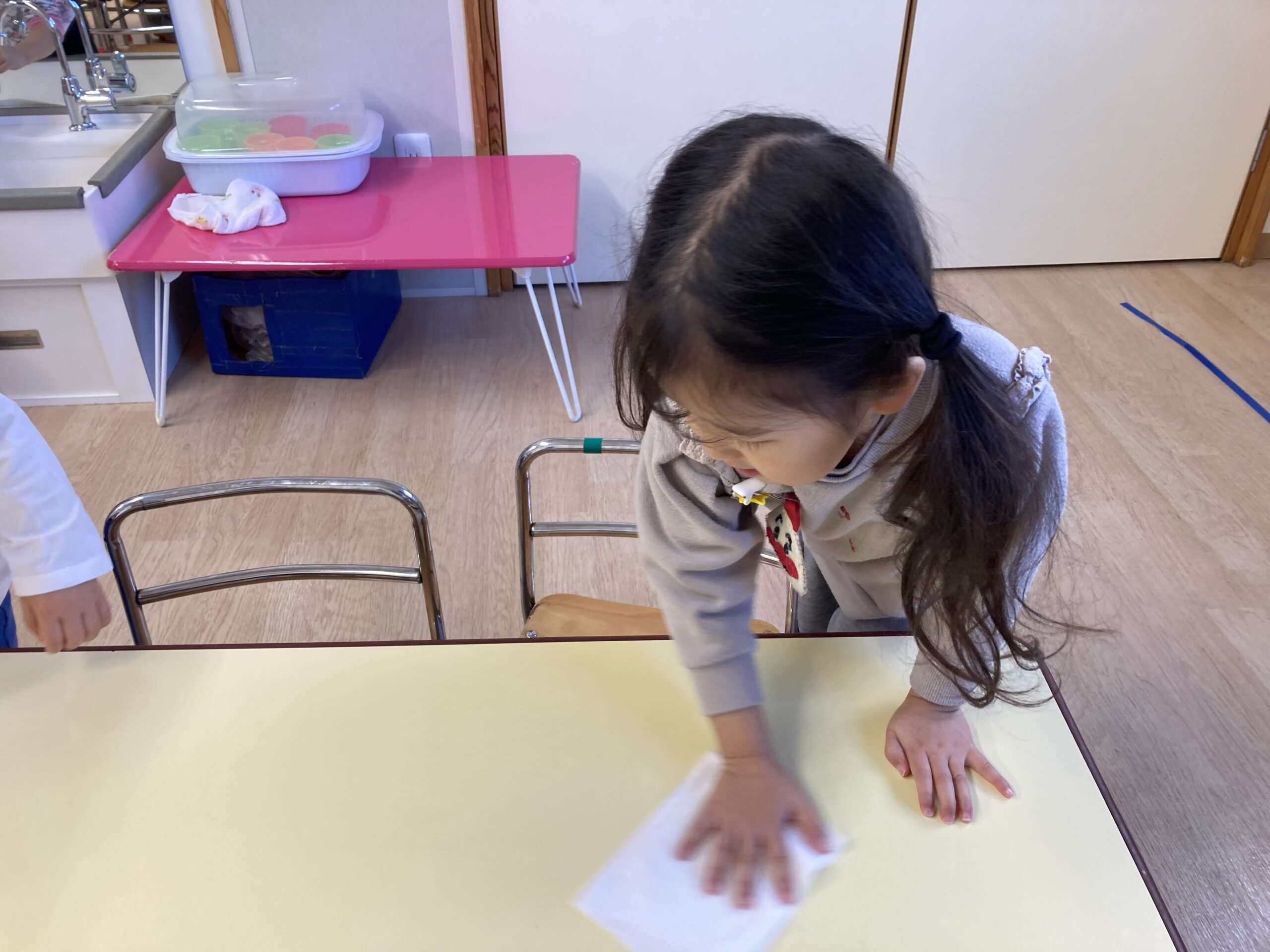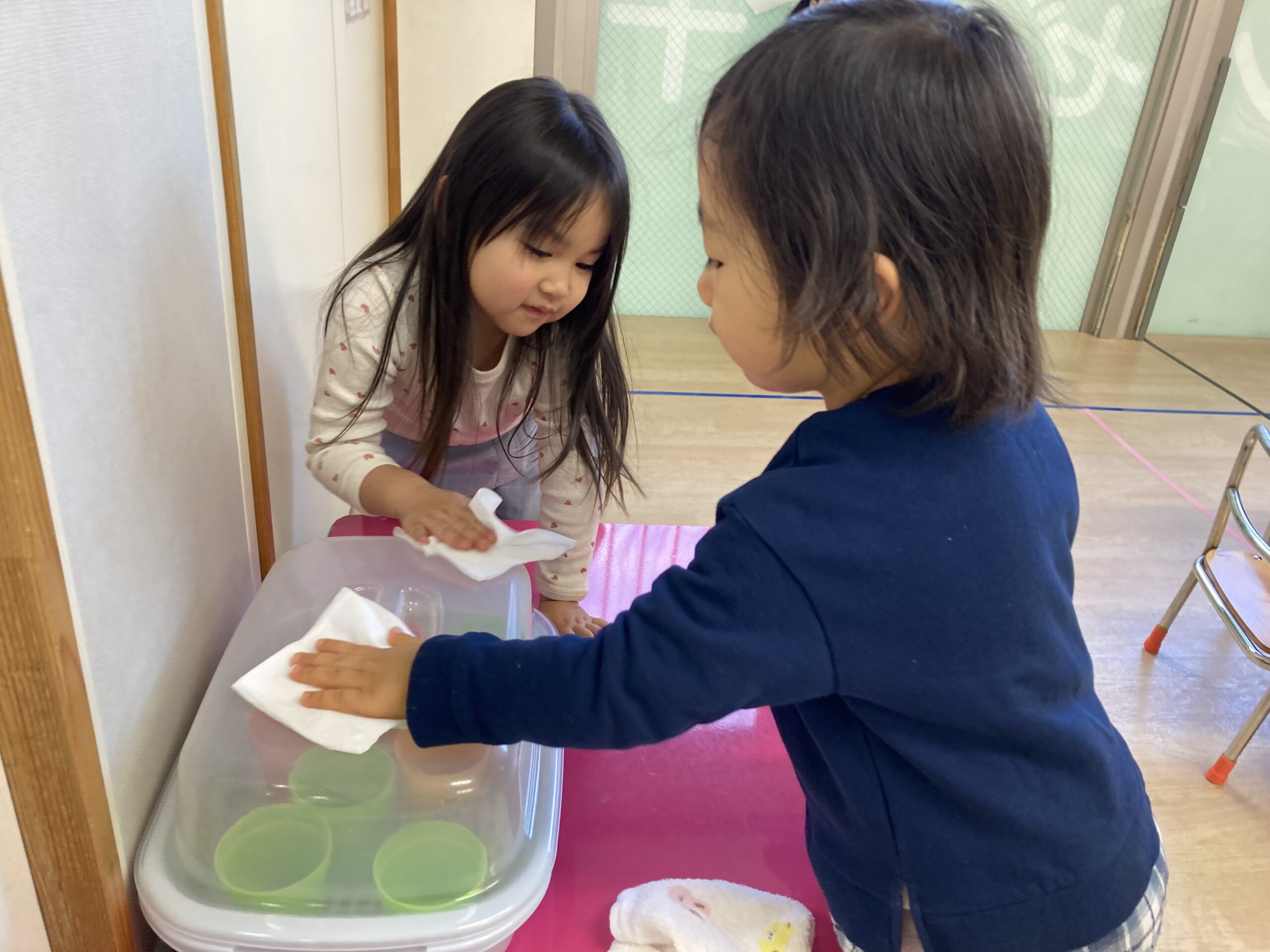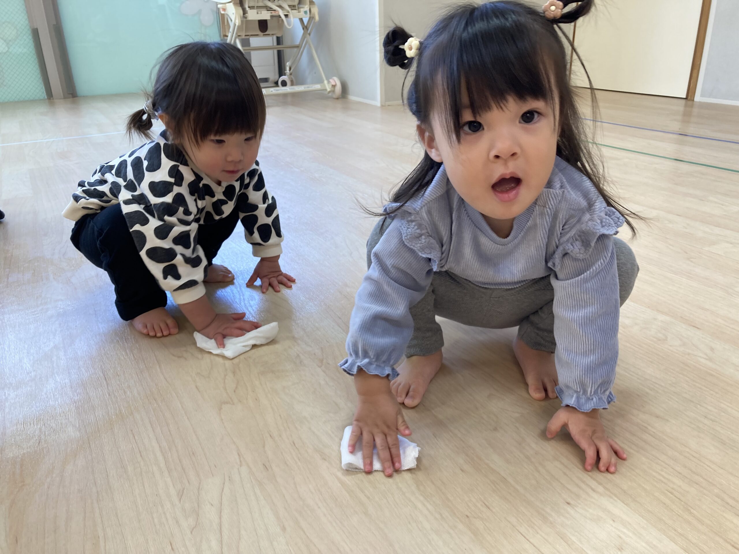 掃除が終わった後、「ここ拭いたねー、ここも拭いたねー」と自分たちで掃除箇所を確認していてかわいかったです❤️