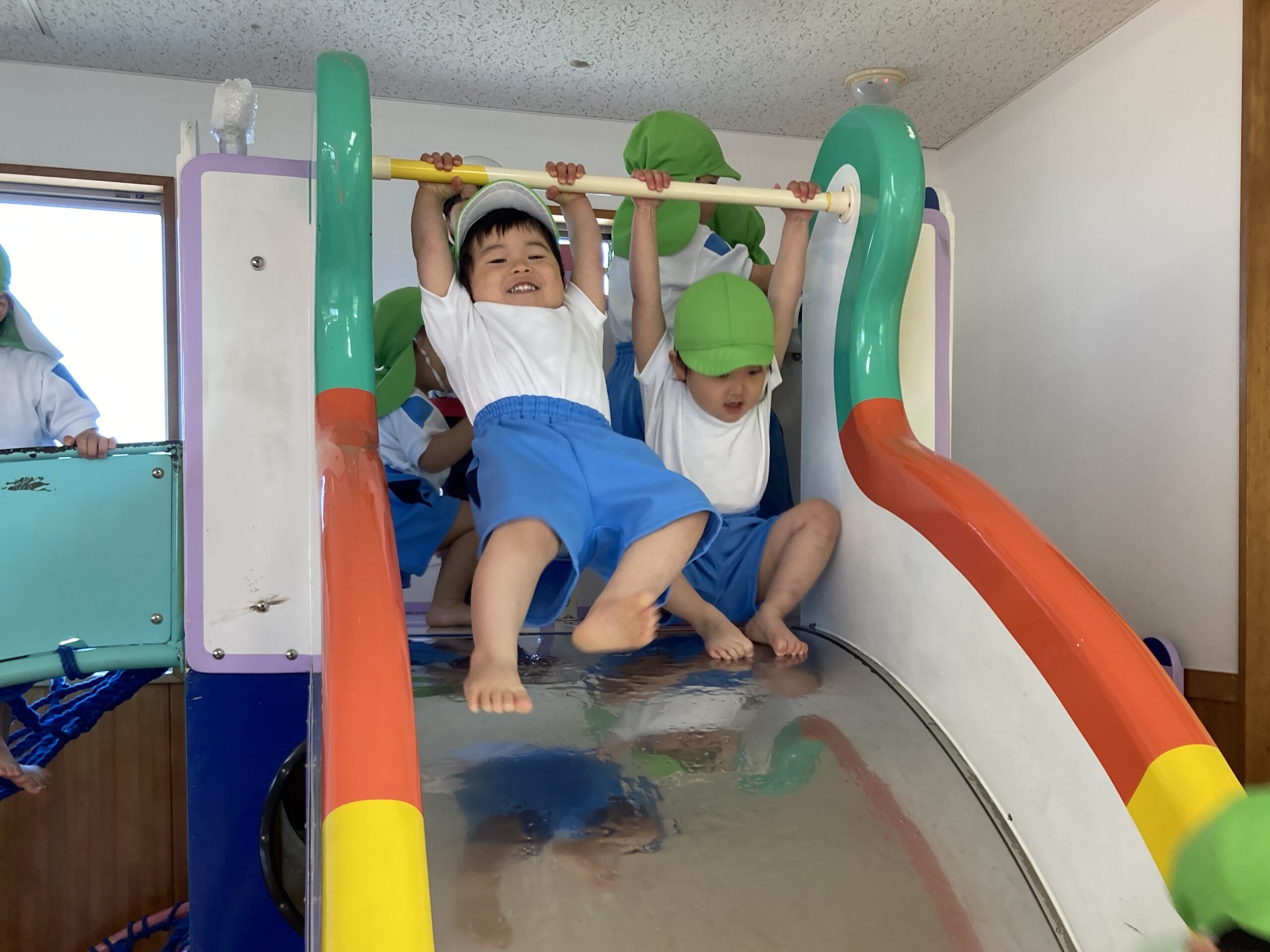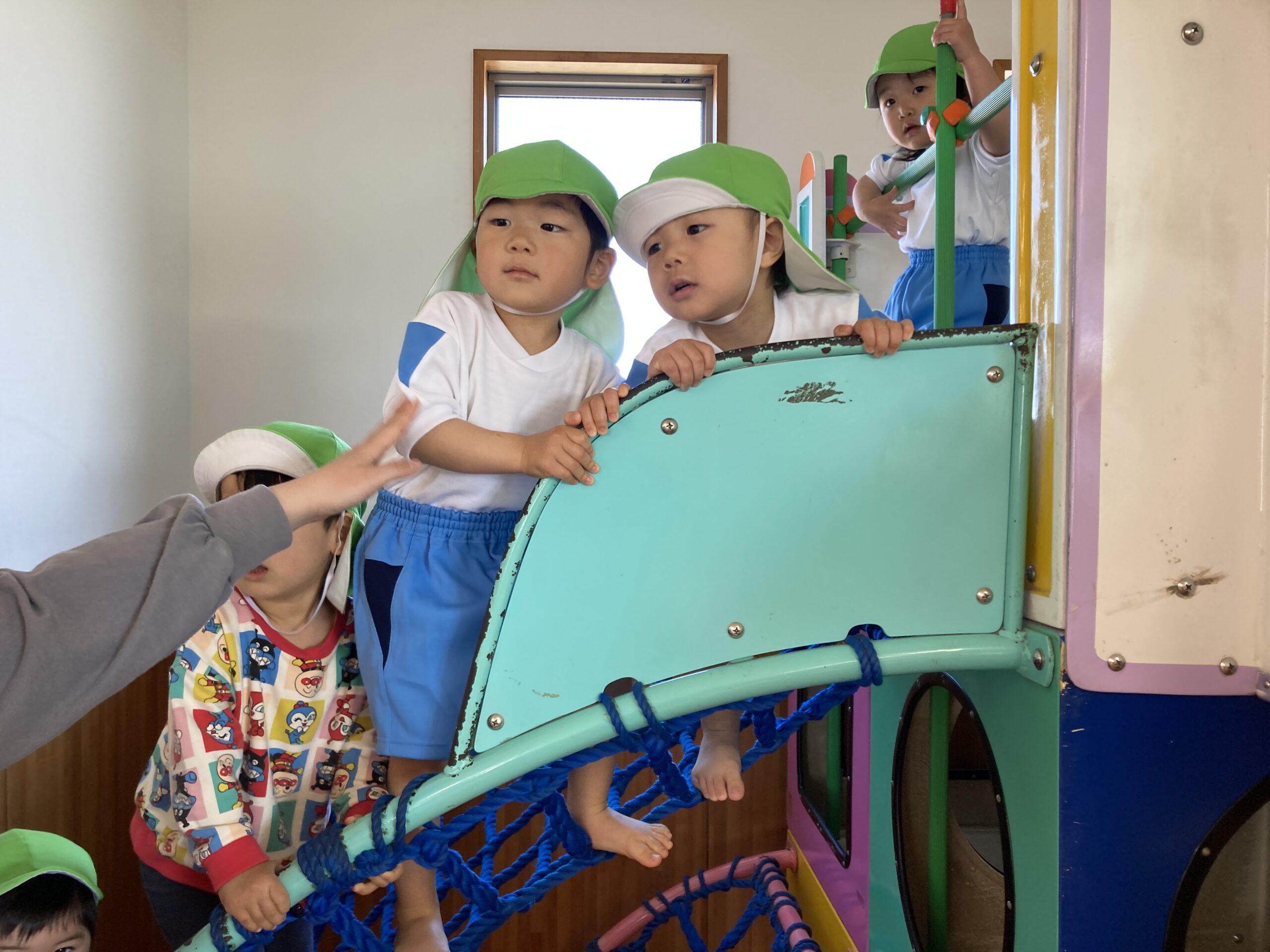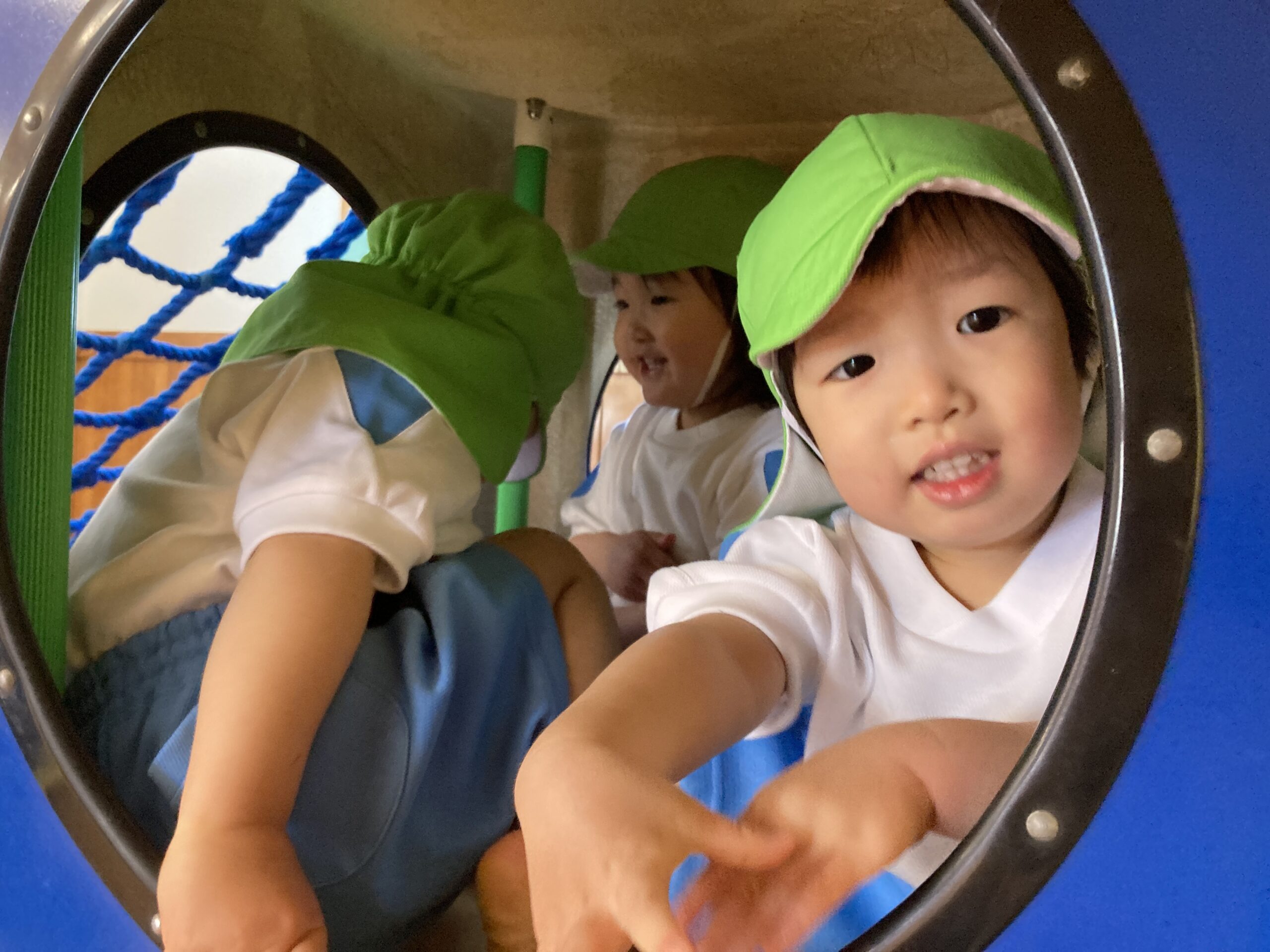 挨拶をしたら緊張もほぐれ、滑り台や網の遊具を登って元気いっぱい体を動かしました。