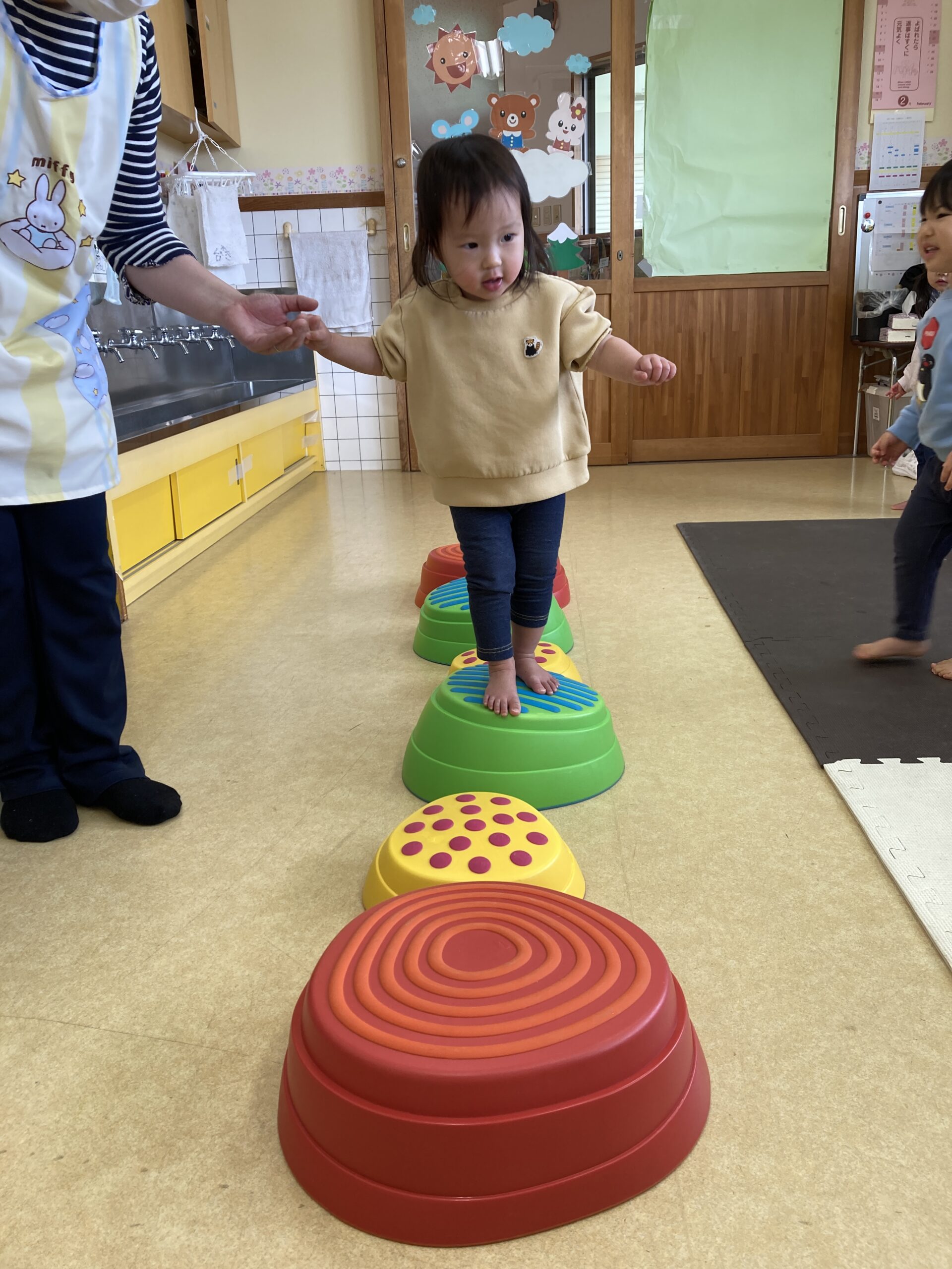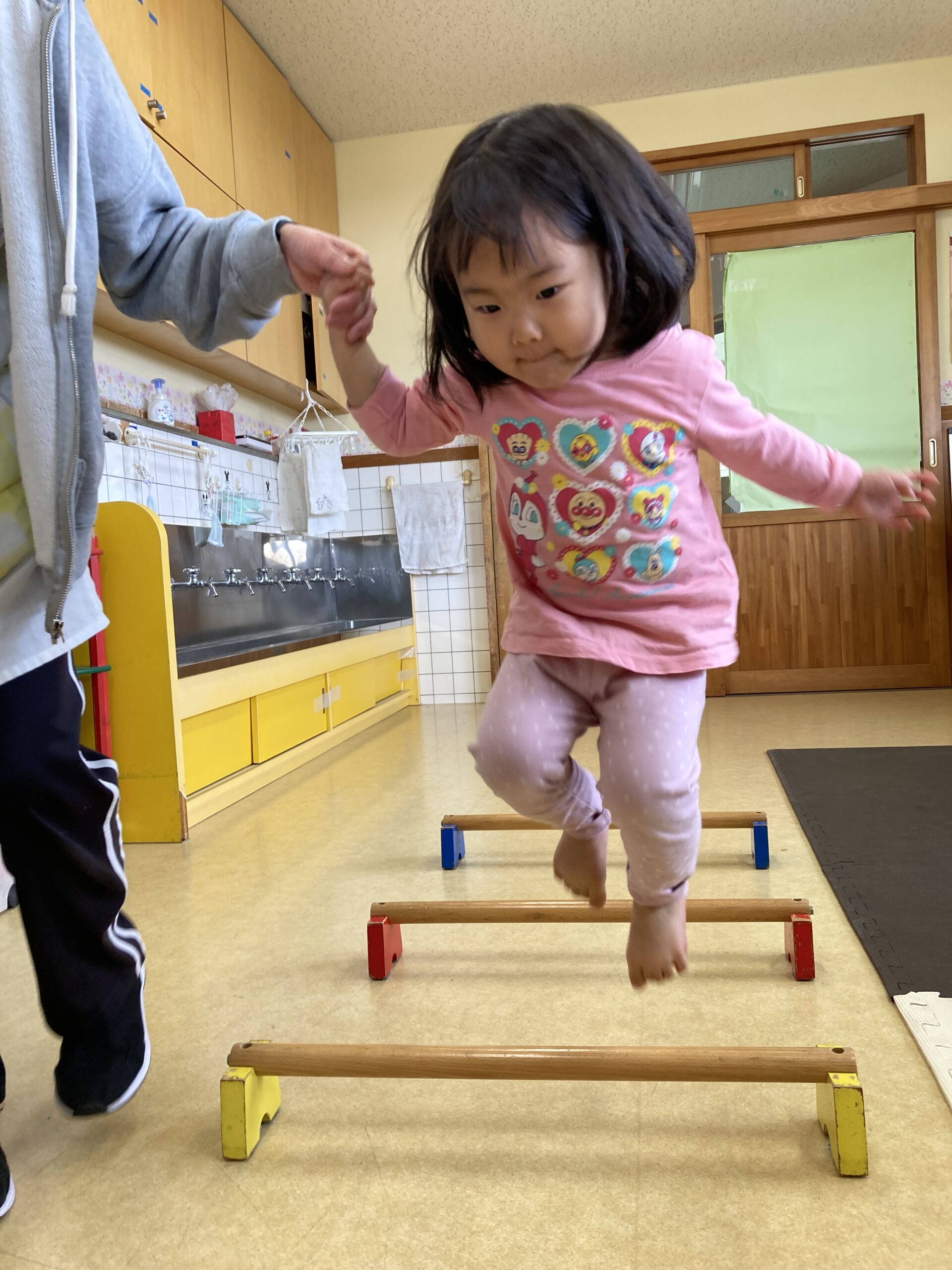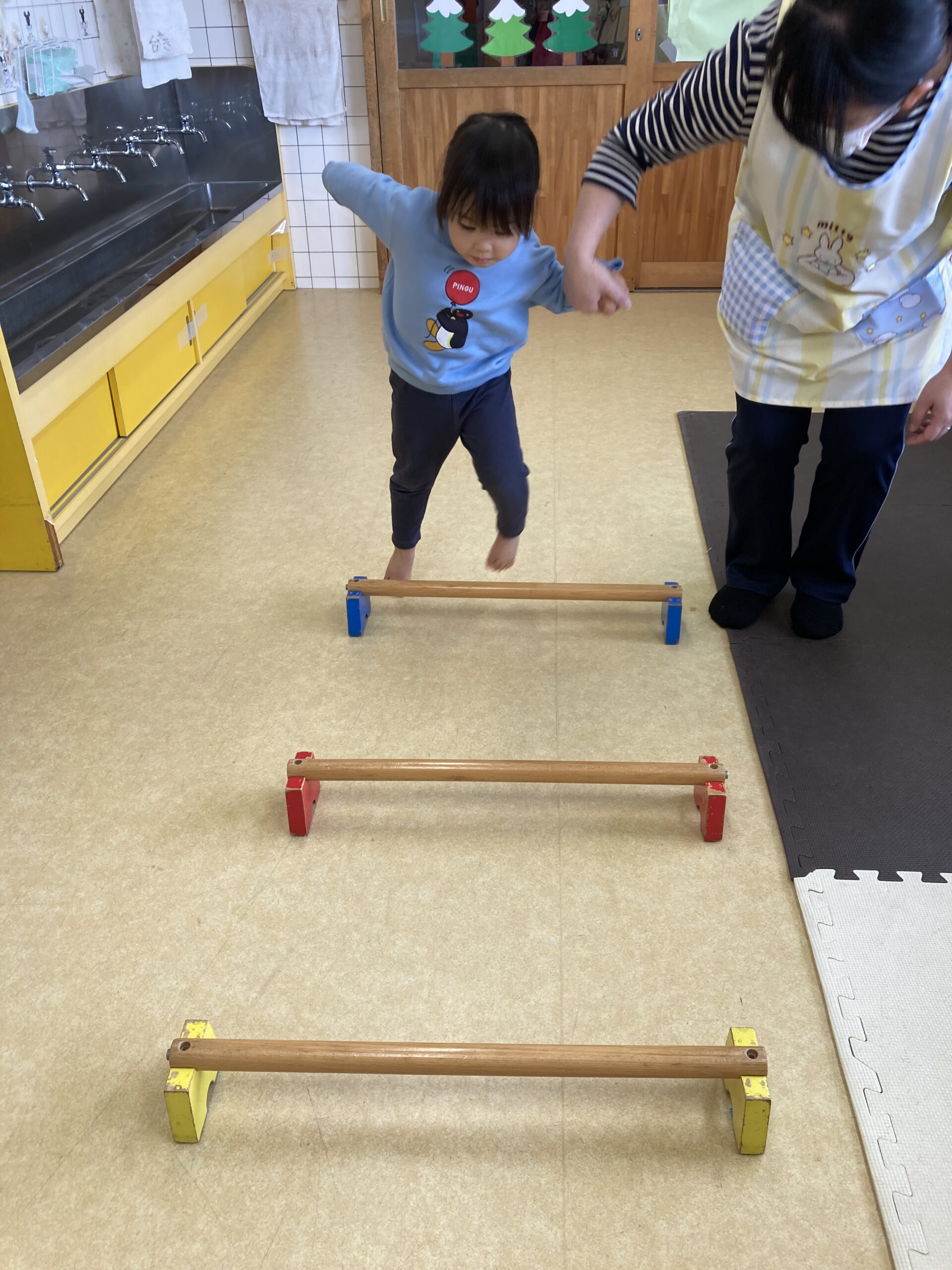 初めはちょっと怖くて先生と手を繋いで跳んでいたお友だちも、回数を重ねていくと一人で跳べるように!!