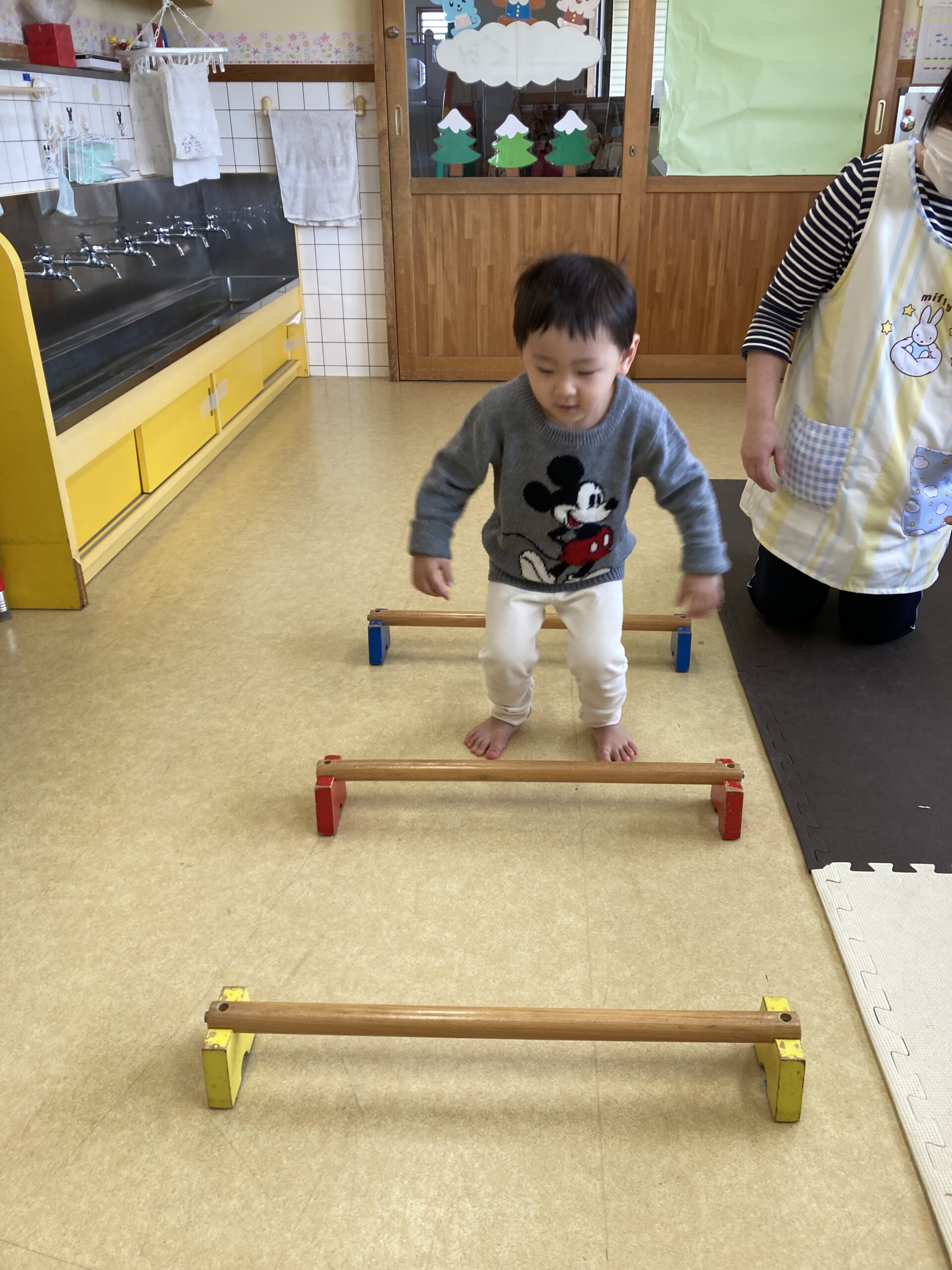 初めはちょっと怖くて先生と手を繋いで跳んでいたお友だちも、回数を重ねていくと一人で跳べるように!!