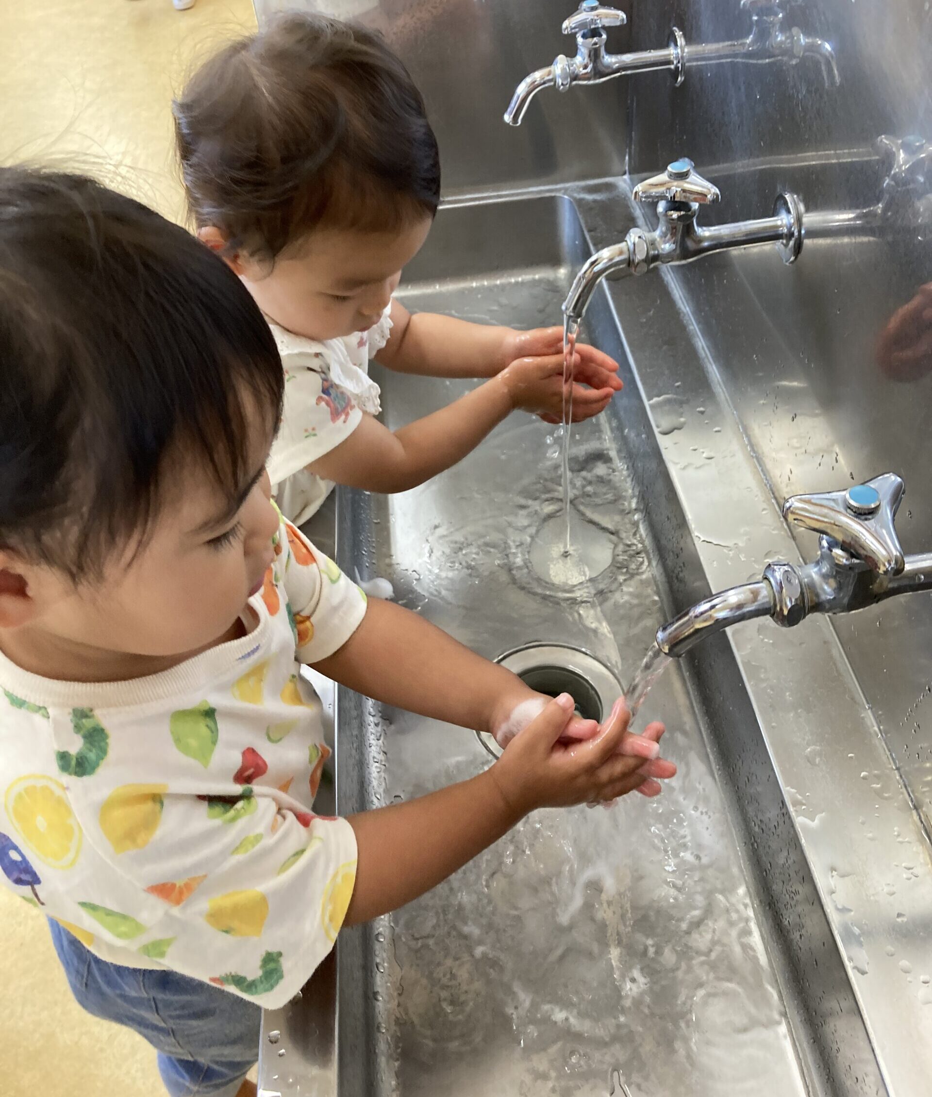 まずは、手を洗います。せっけんをつけて…「ゴシゴシ!バイキンバイバーイ!!」