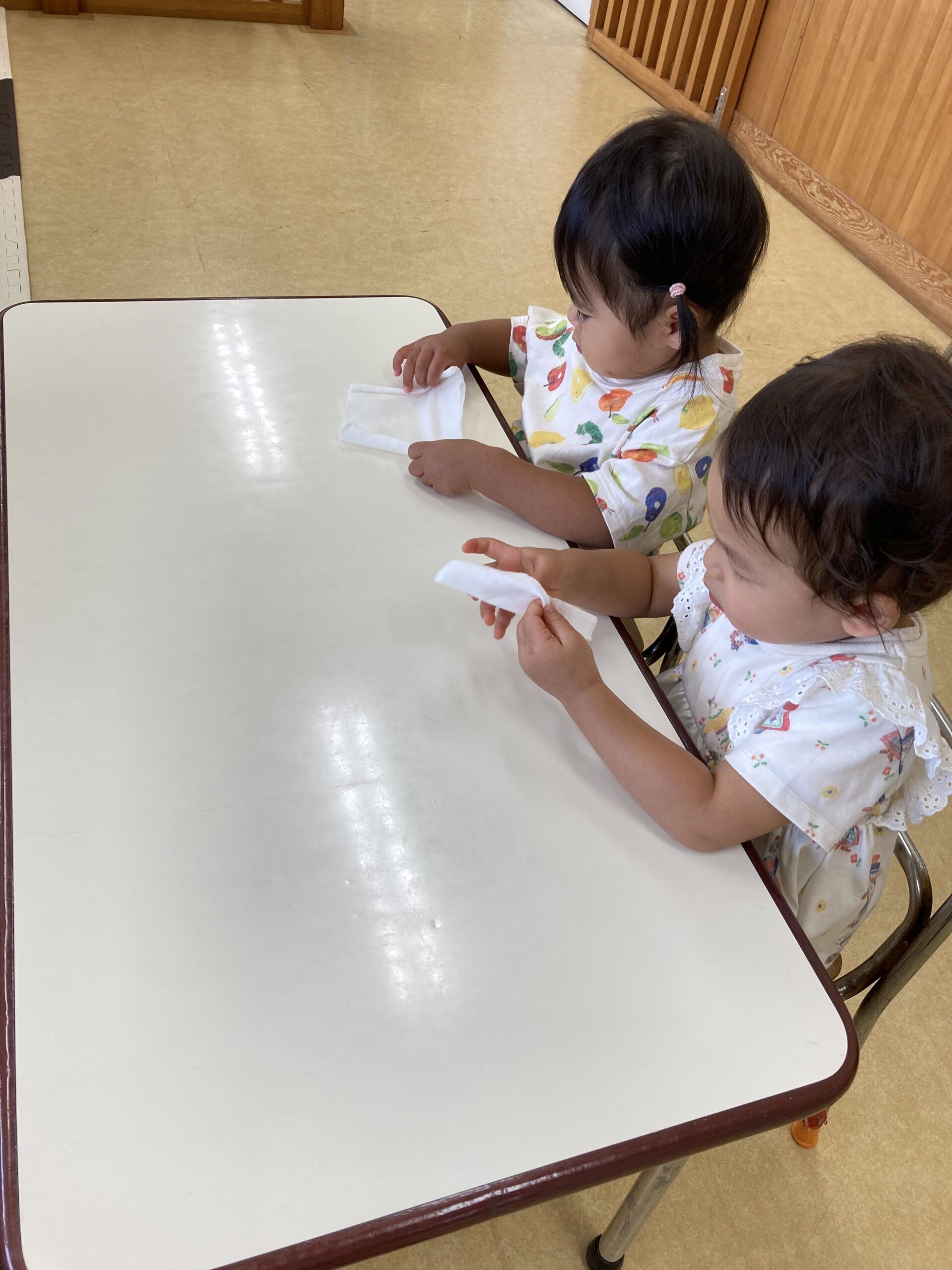 椅子に座り、お口拭きを広げ二つに折りたたみます。小さいお友だちは、先生と一緒に行います。
