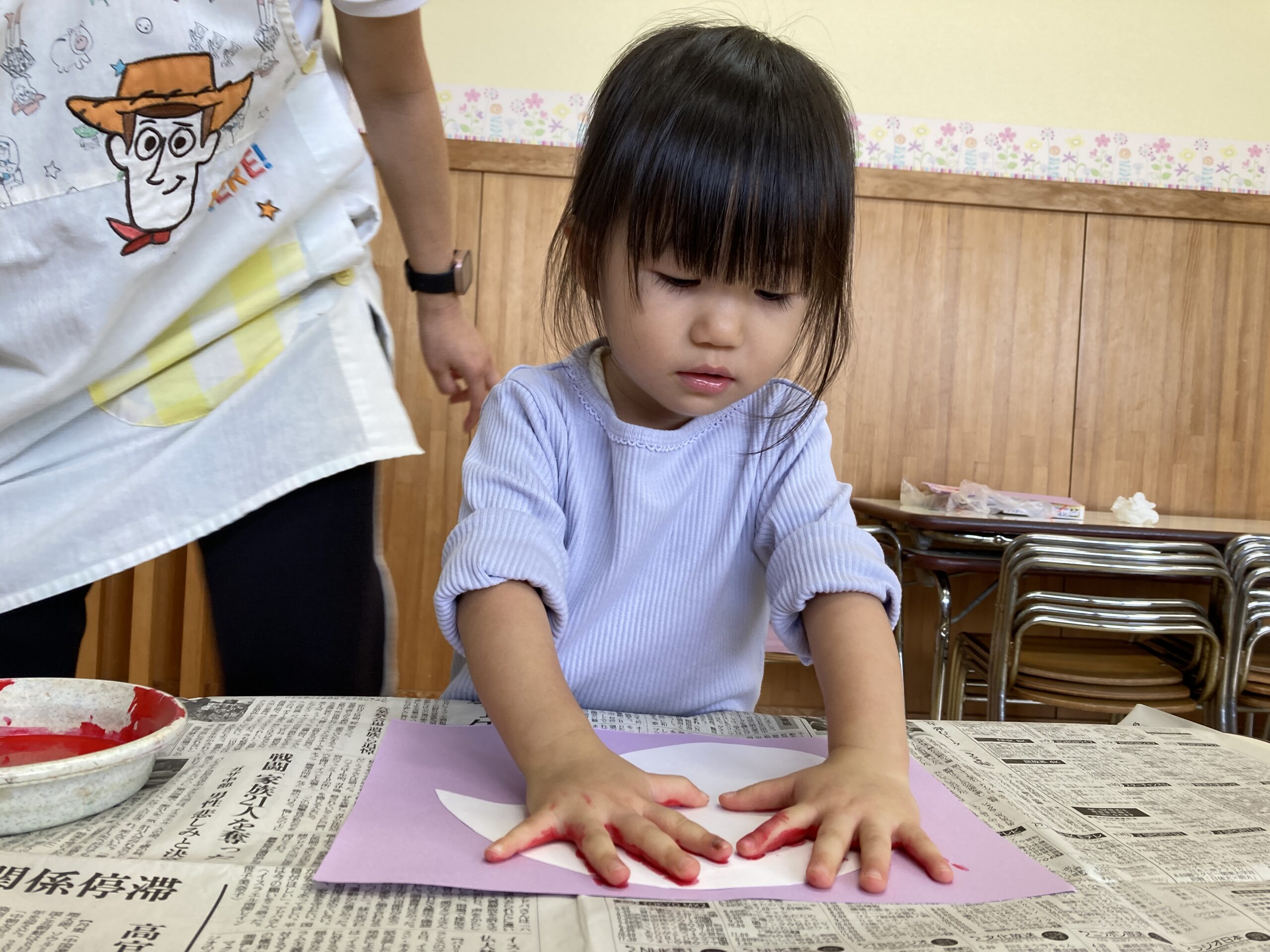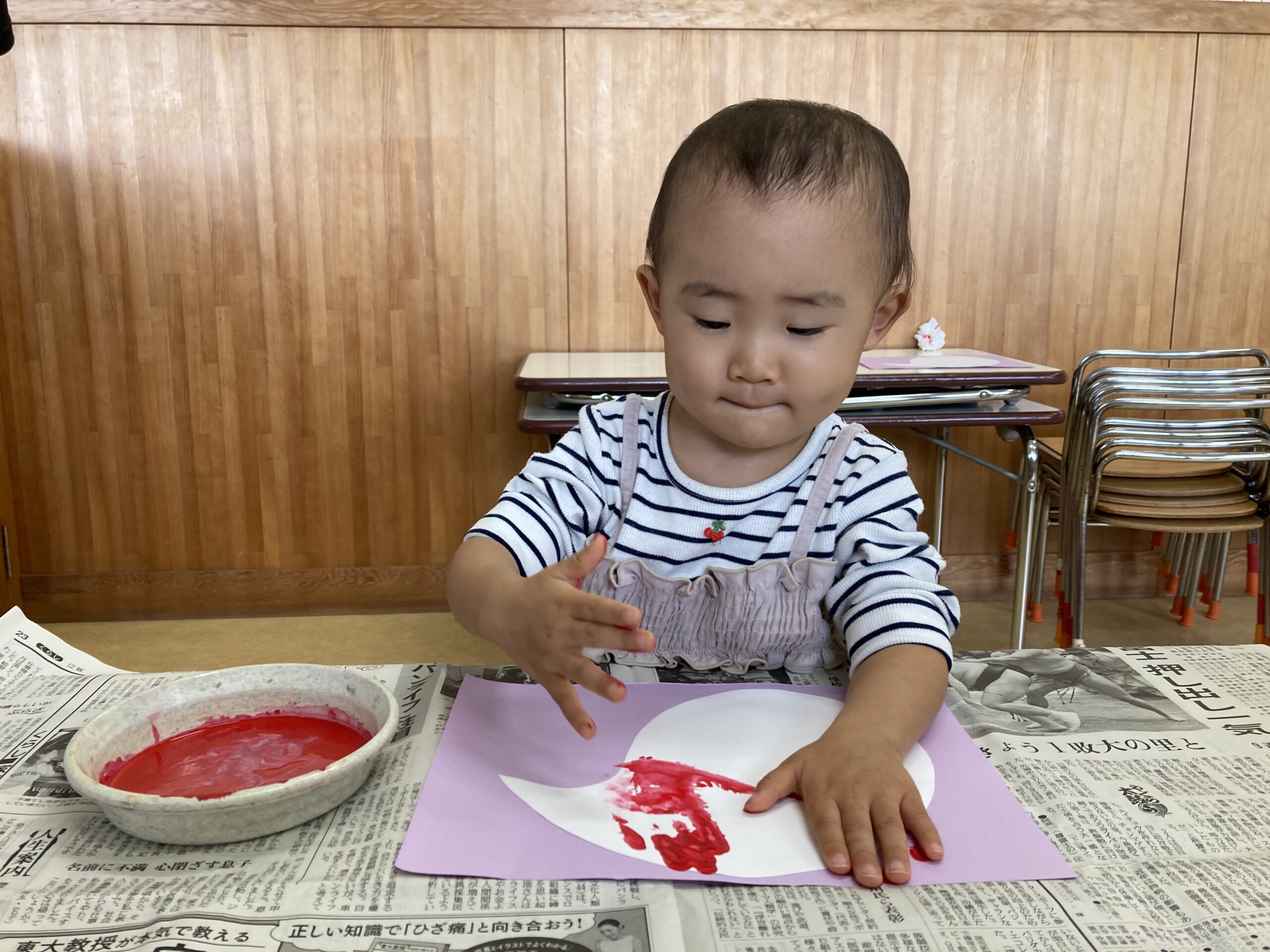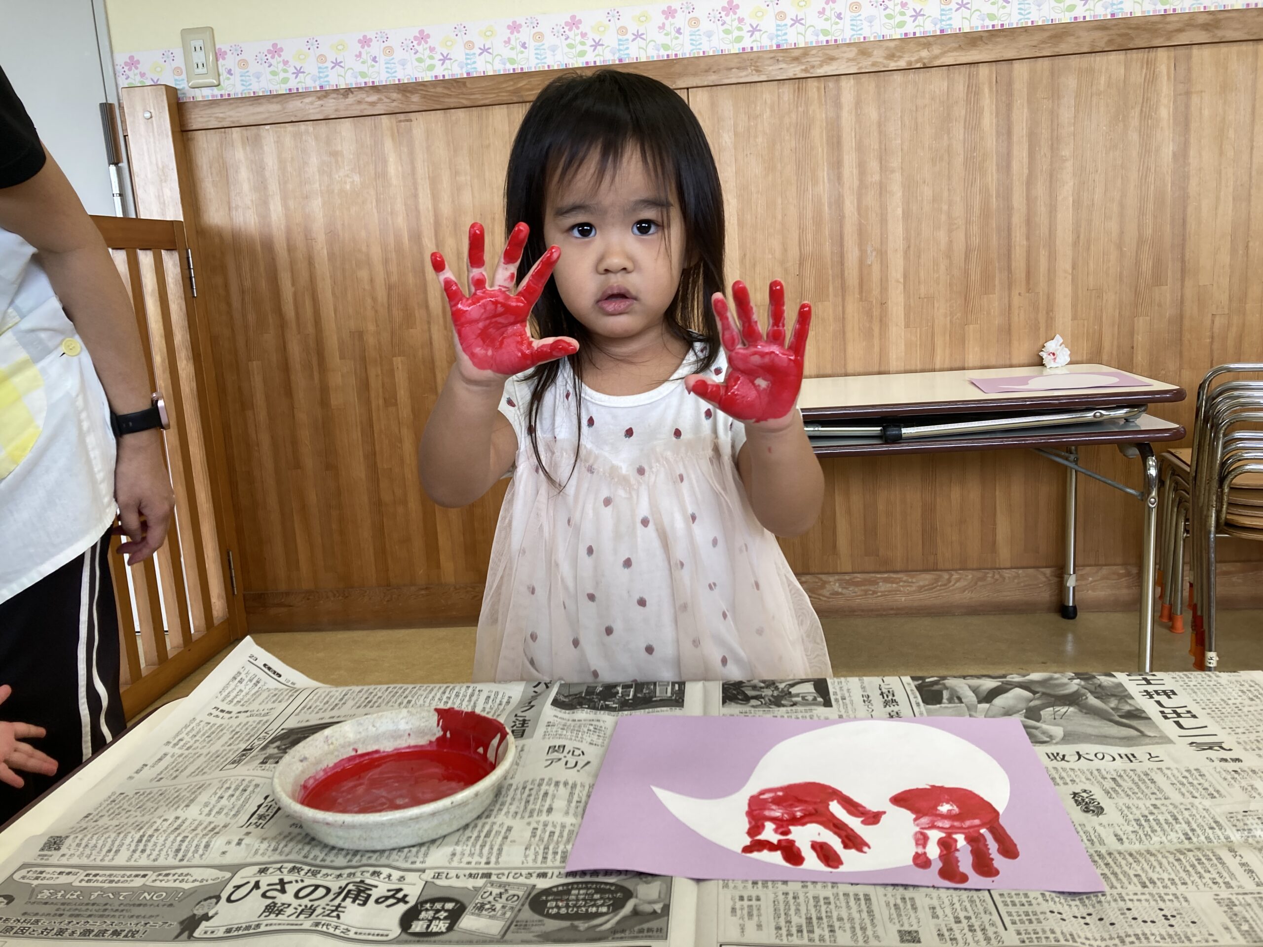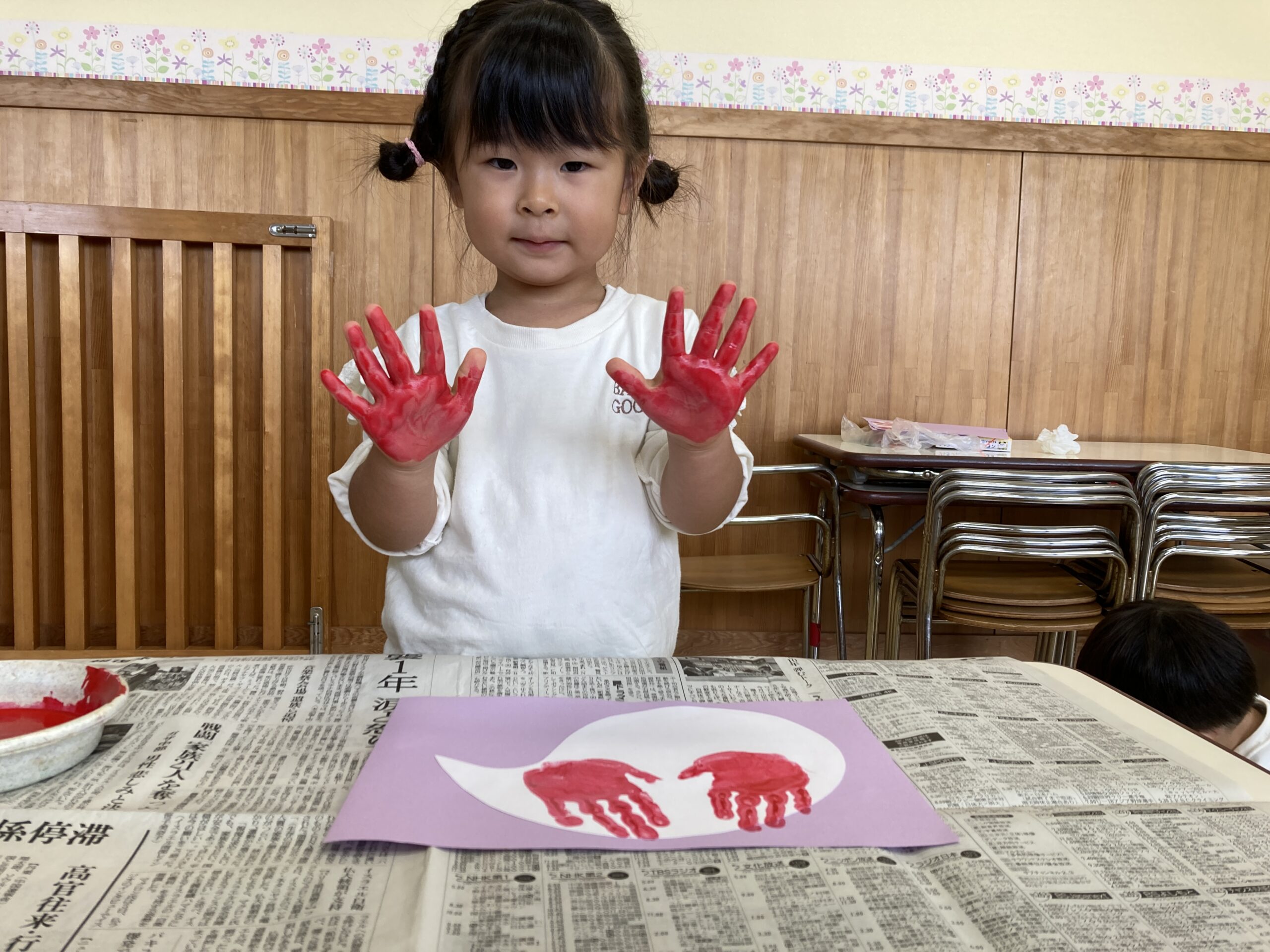 赤い絵の具を両手に付けて、ペタッ!!手形は、おばけの手になりました。