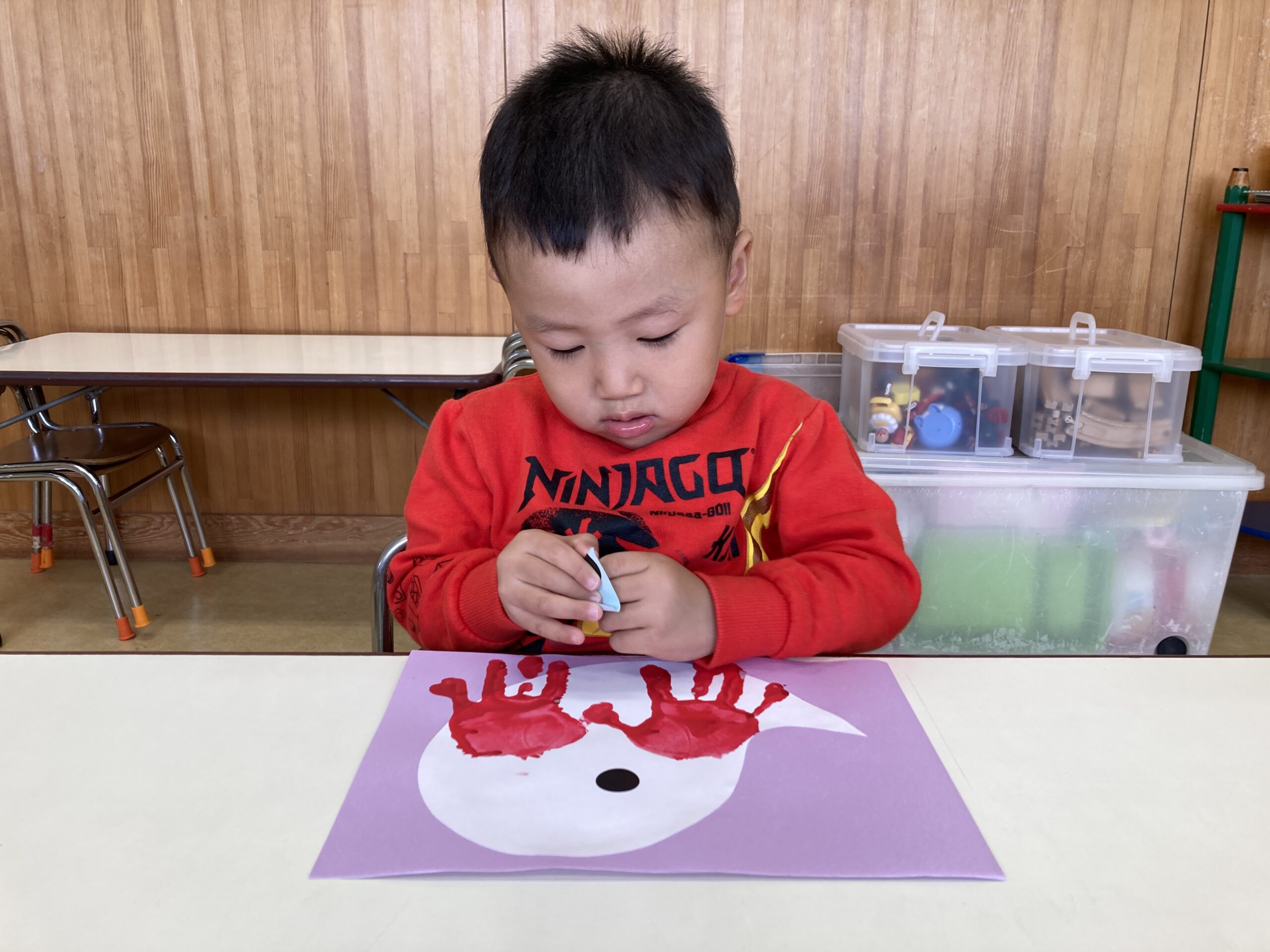 出来た作品をお友だちとみて「おばけ~!きゃ~!!」と、楽しそうでした。