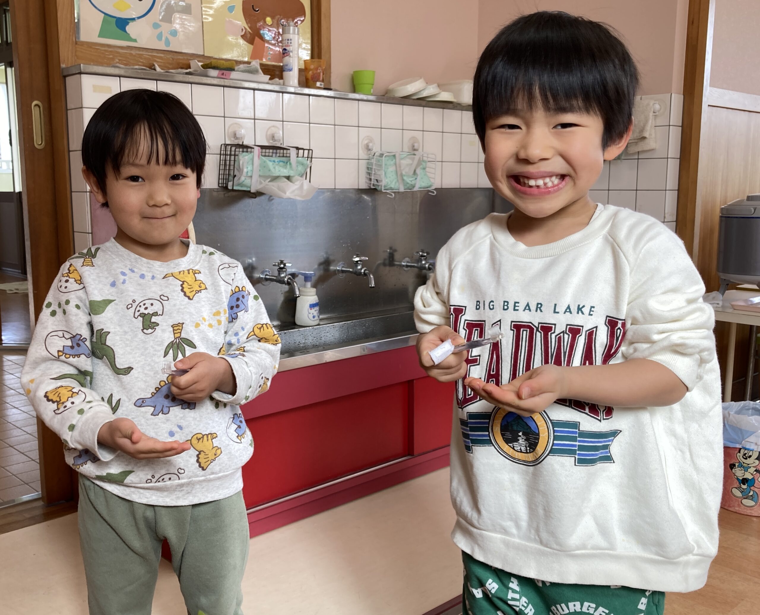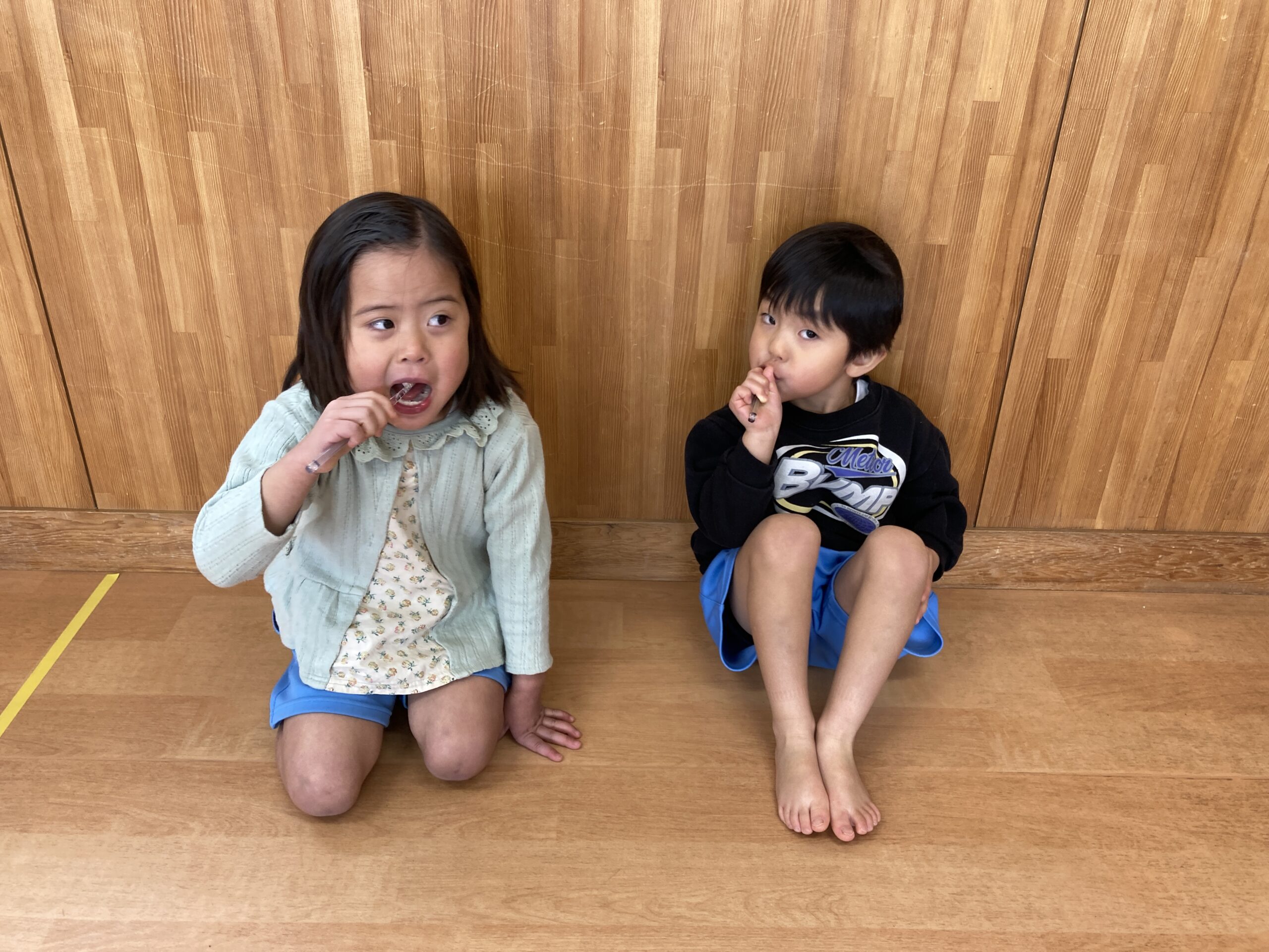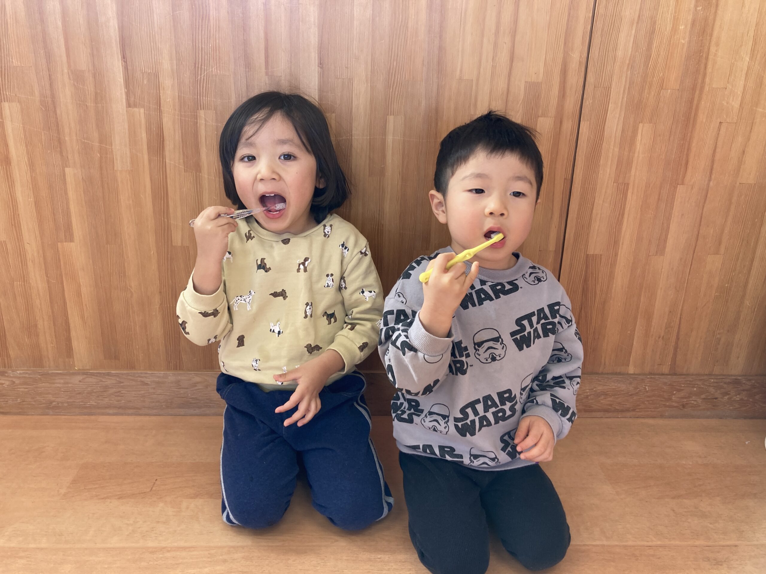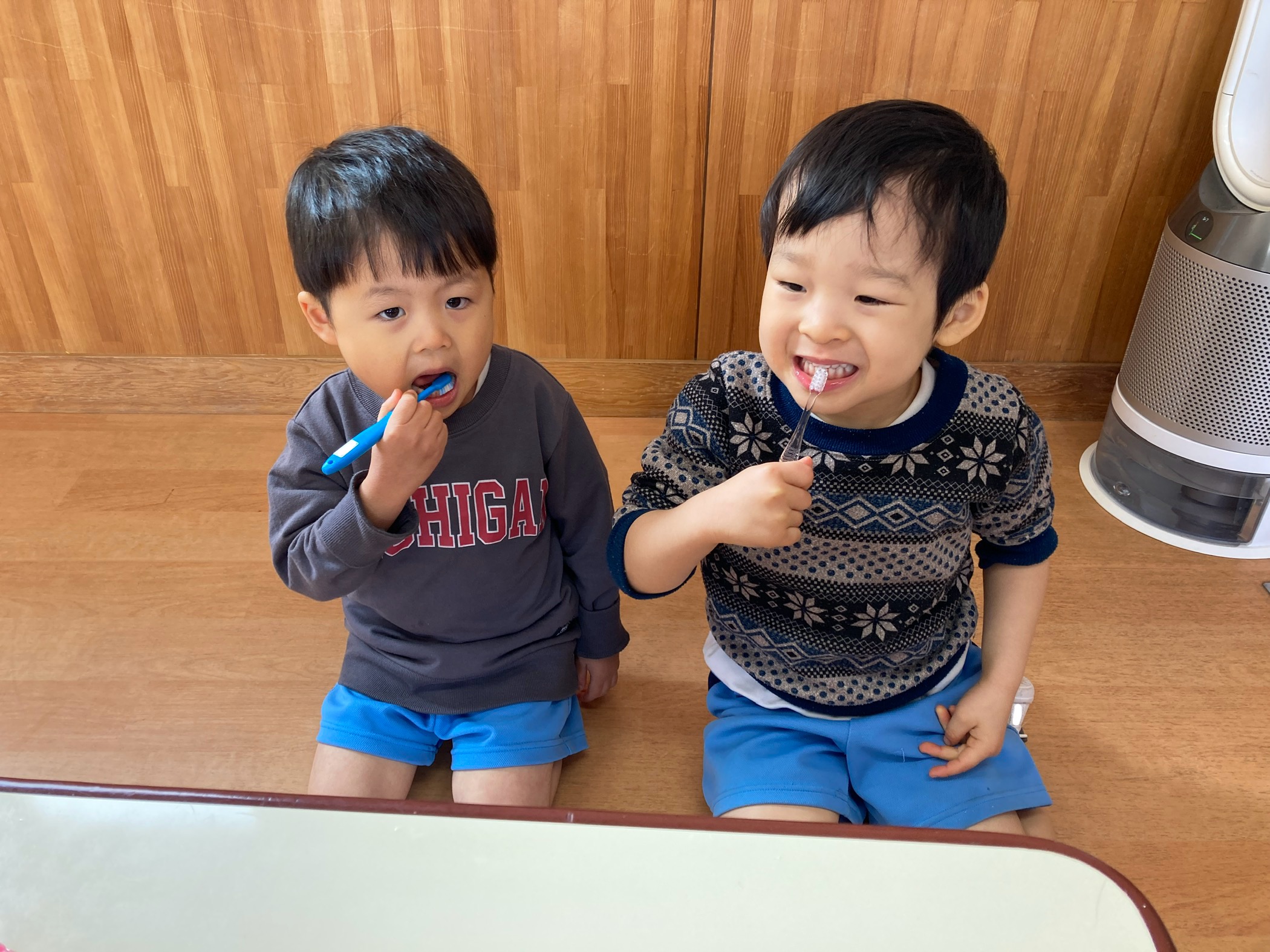 楽しみにしていたにじ組さんは、朝からお友だちと歯ブラシの見せ合いっこをしたり、やり方をよく聞いて意欲的に取り組んでいます。