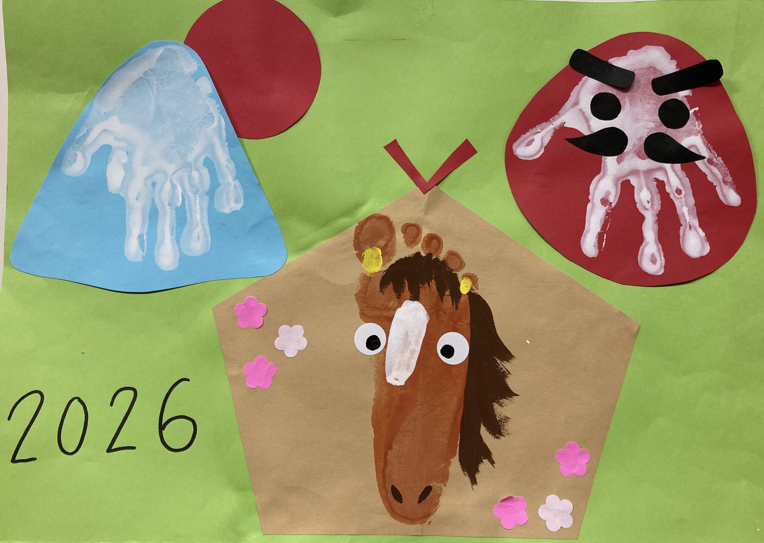 白い手形でだるまの模様と富士山の雪を表現し、茶色い足形で今年の干支『午』の顔を作りました。