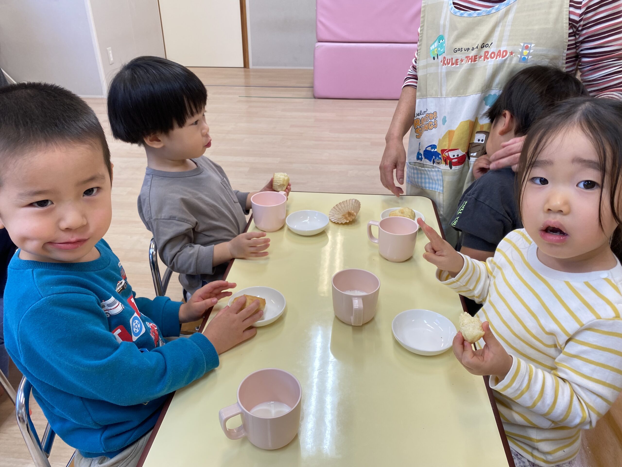 おやつの後は先生からのプレゼント。ドーナツ屋さんのお話を見ました。