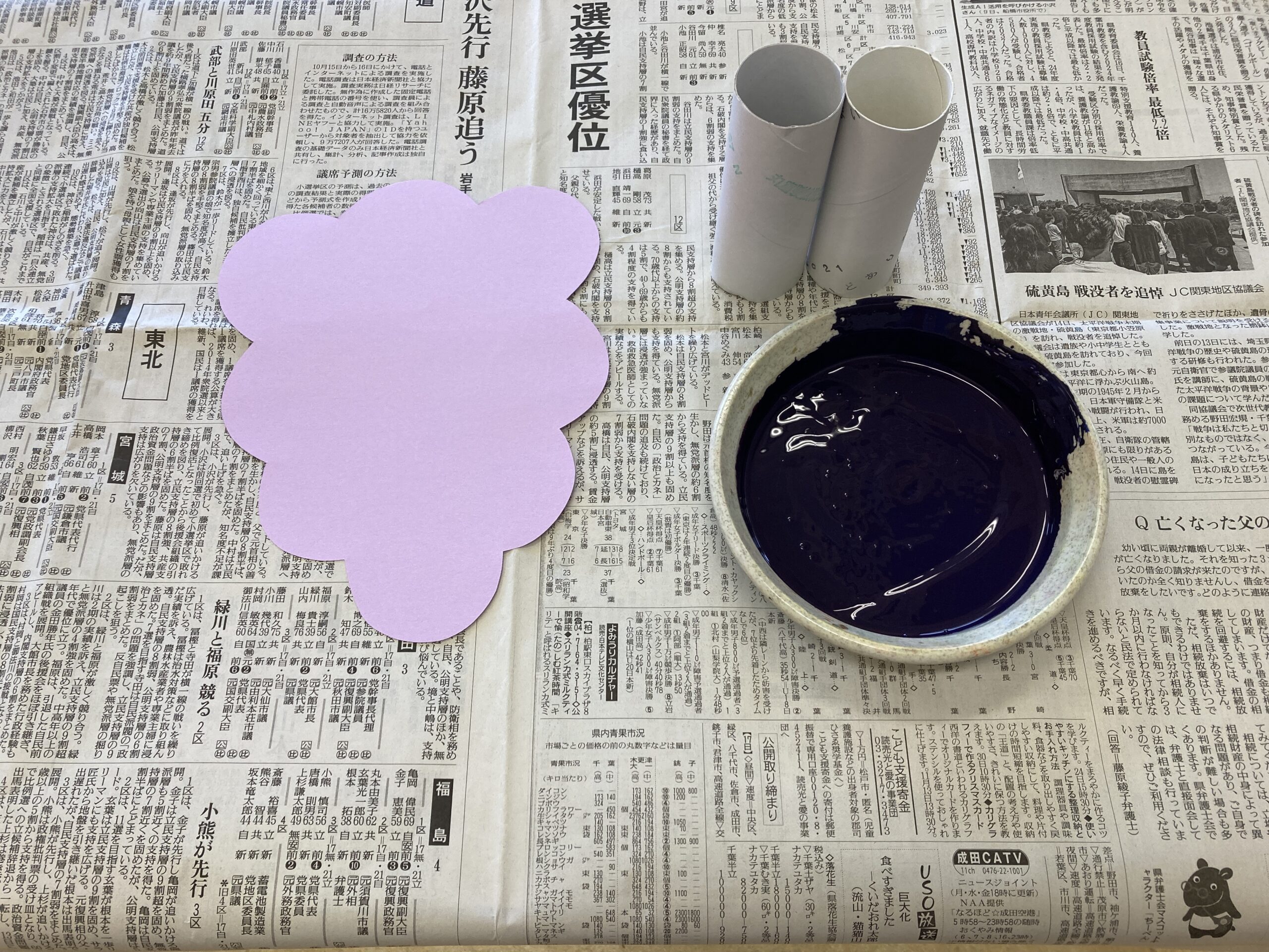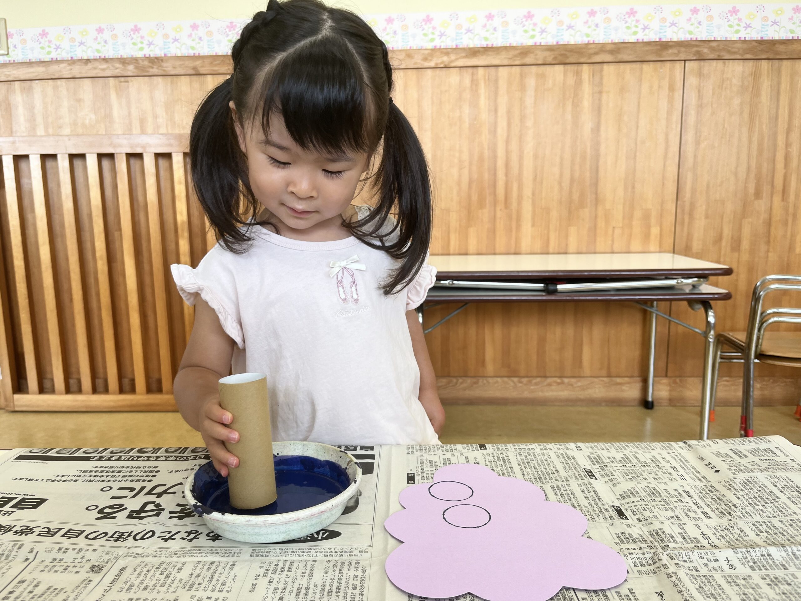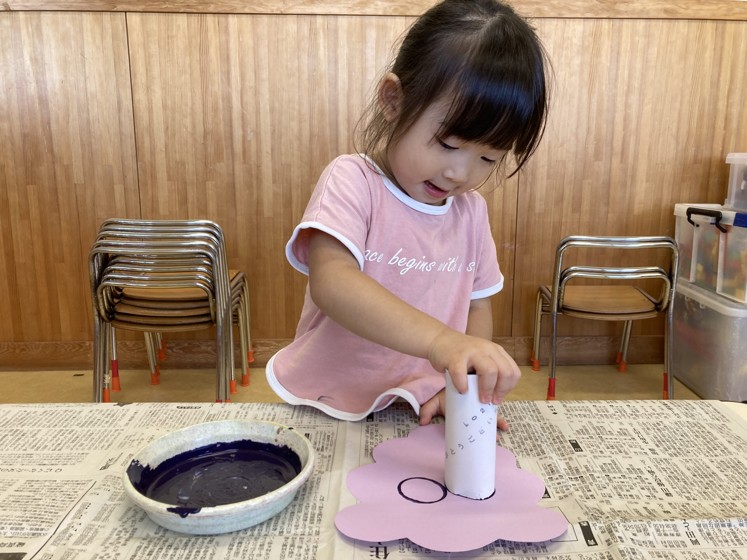 トイレットペーパーの芯に紫の絵の具をつけて…画用紙にトントン!
