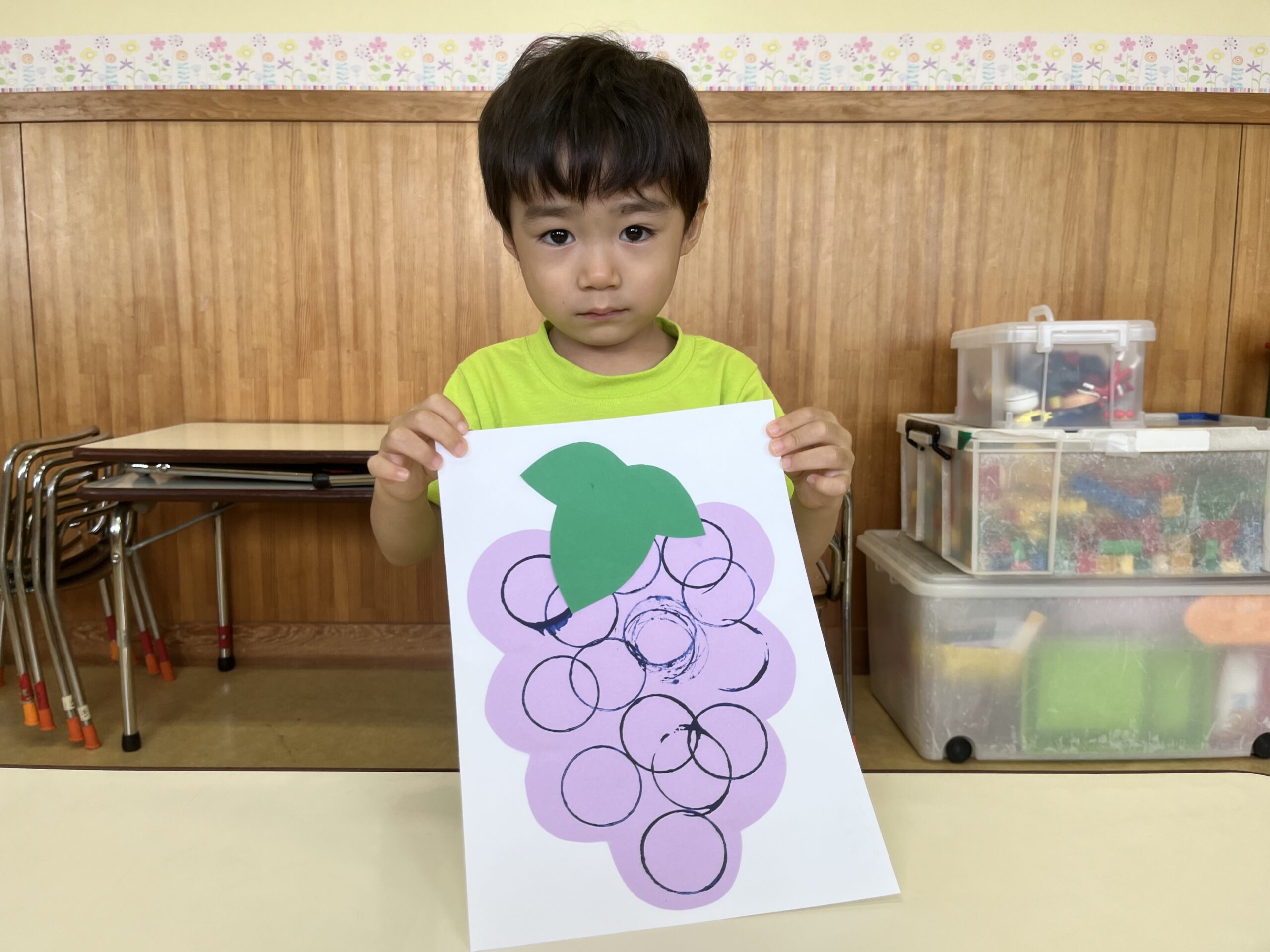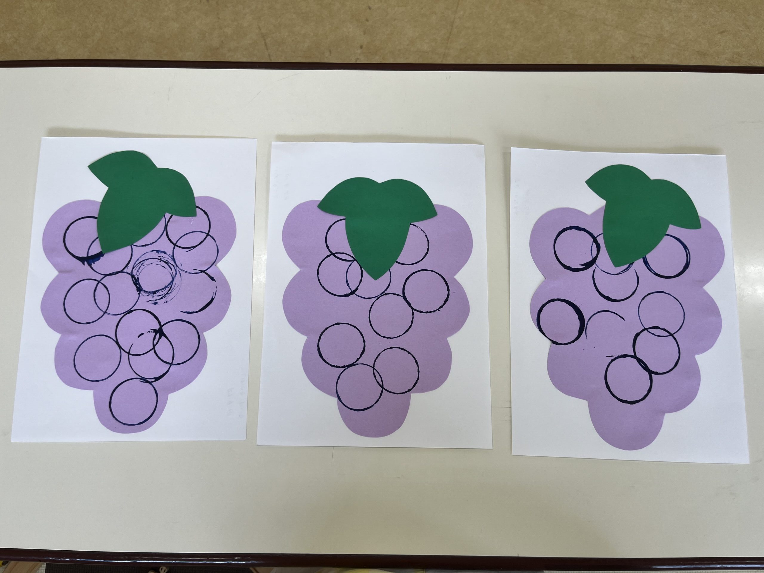 押したスタンプを見てすぐに、「見て見て~!ぶどうみたい!丸いね!」みんなとても喜んでスタンプをしていました。