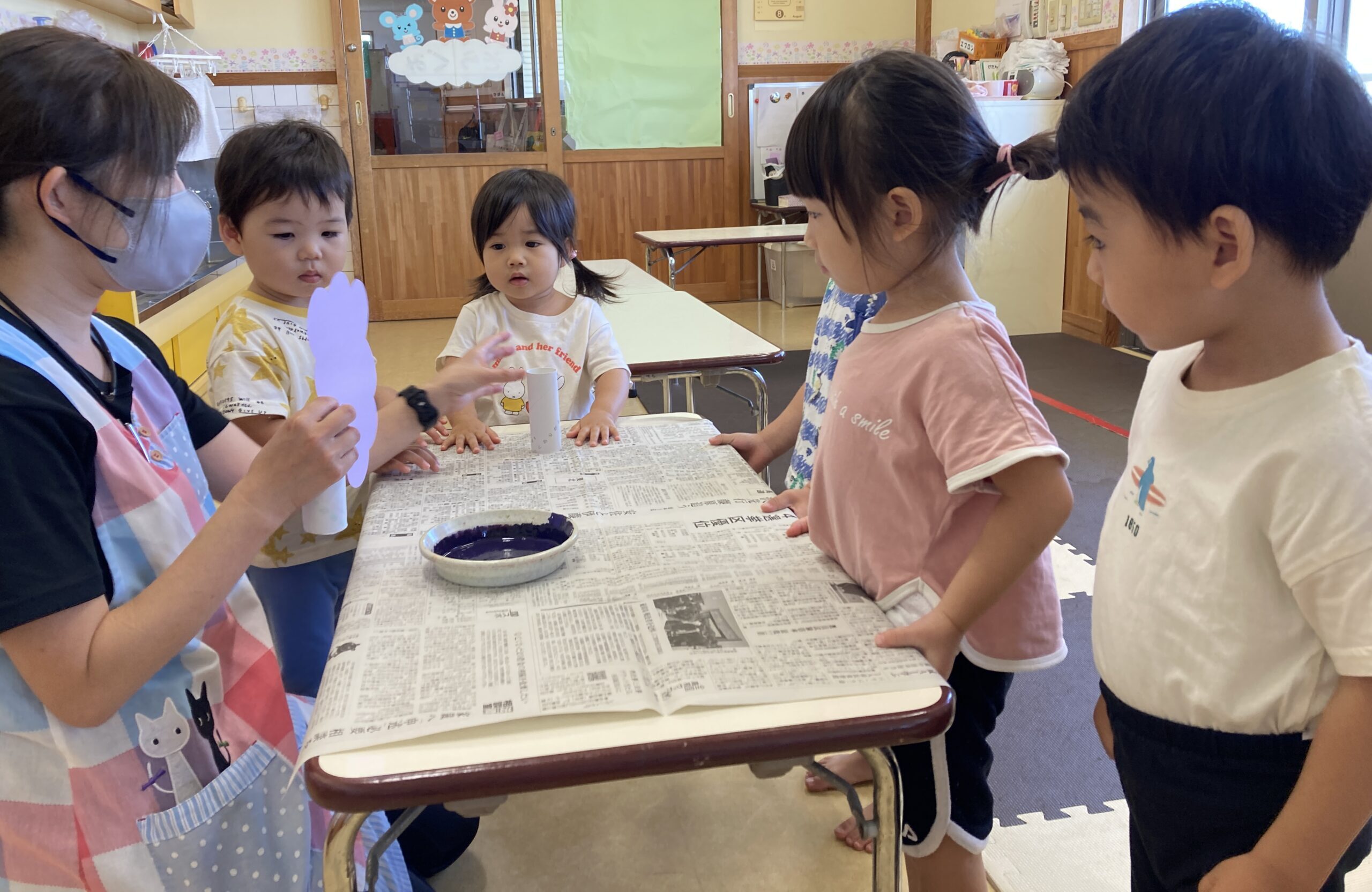 7月の制作で、トイレットペーパーの芯でスタンプをし、「またやりたい!」の声が多かったので、今回もスタンプを楽しみました!