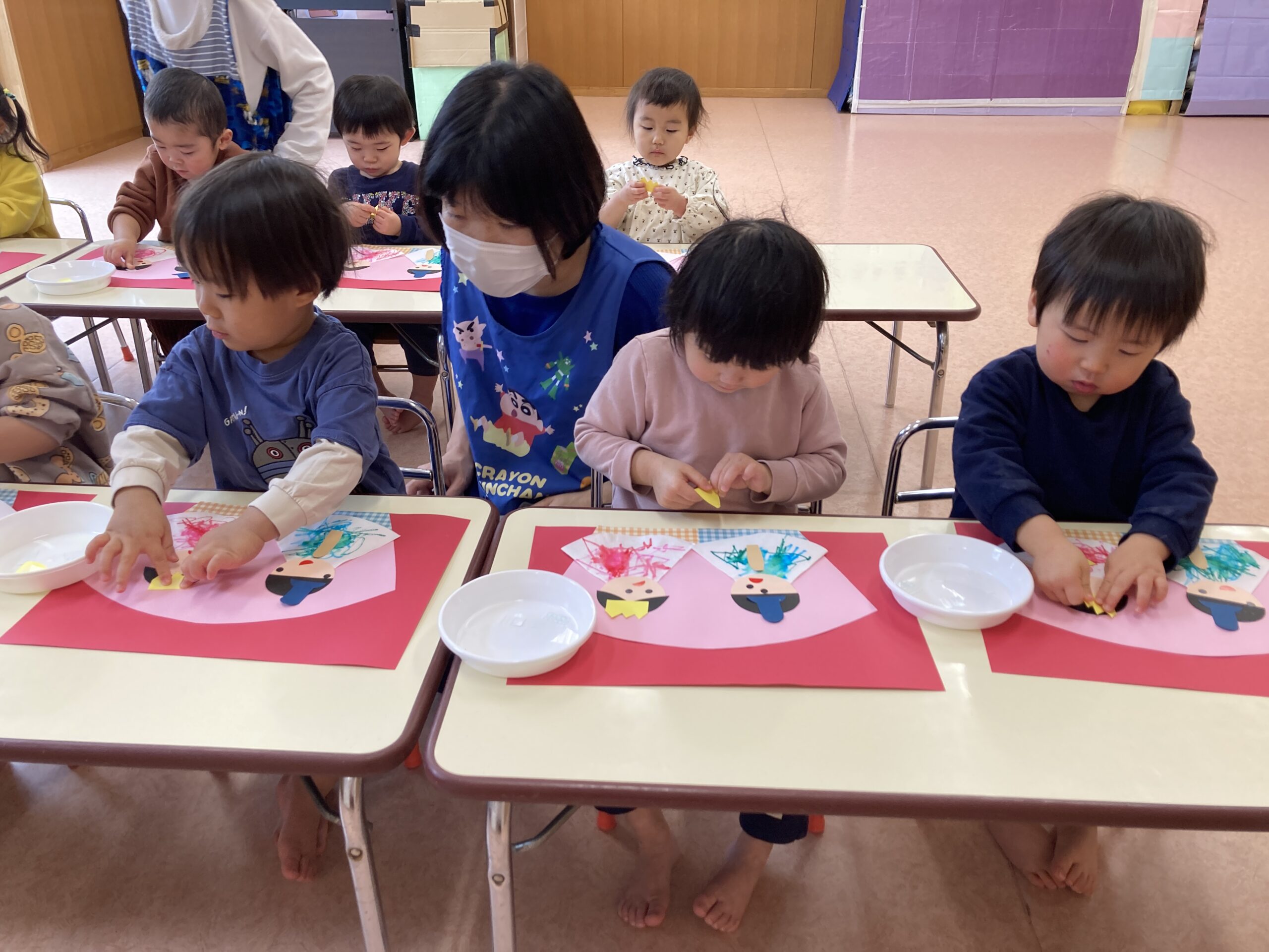 小さいシールや両面テープなど指先を使った遊びも集中してチャレンジする姿が見られるようになり成長を感じた作品となりました。保育園に飾ってあるのでぜひお子さんと一緒に見てみてくださいね。