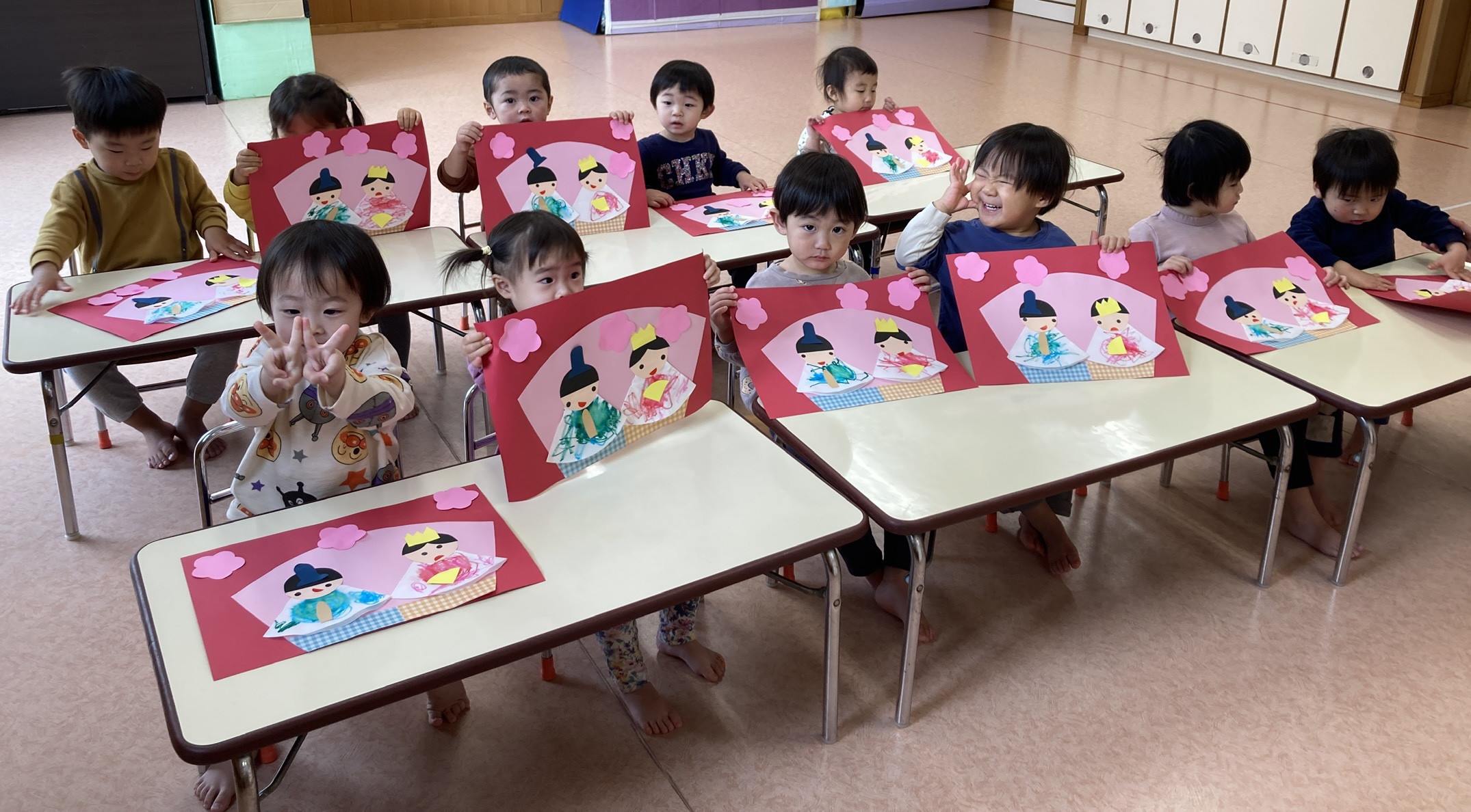 「かわいいお雛様が出来たよ」と見せてくれ、みんなでニコニコでハイボーズ。