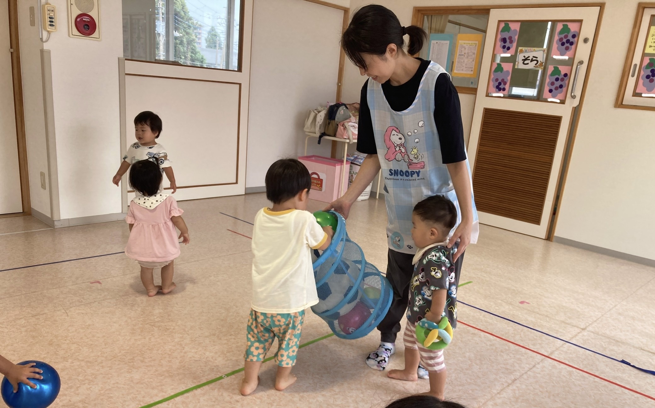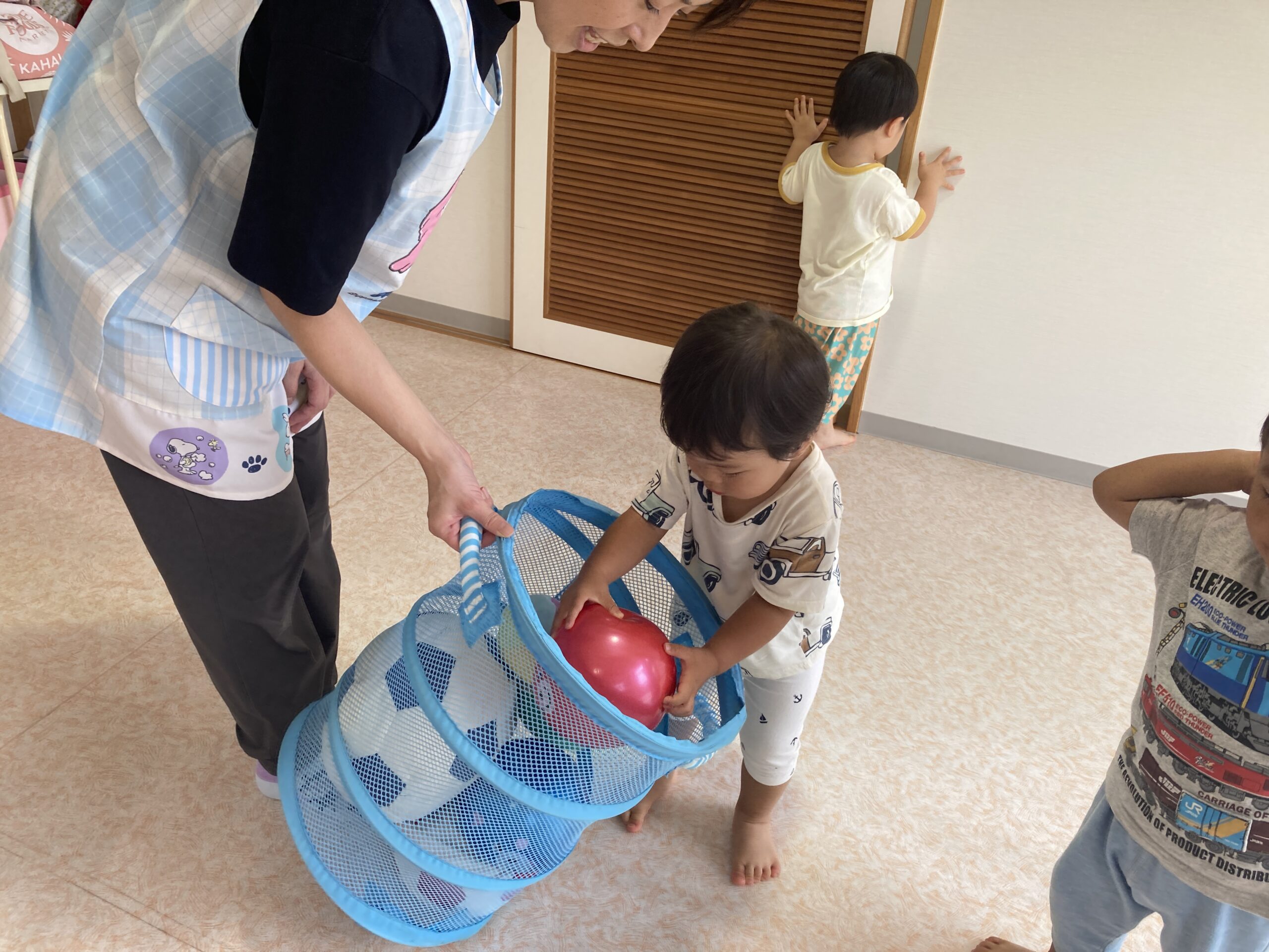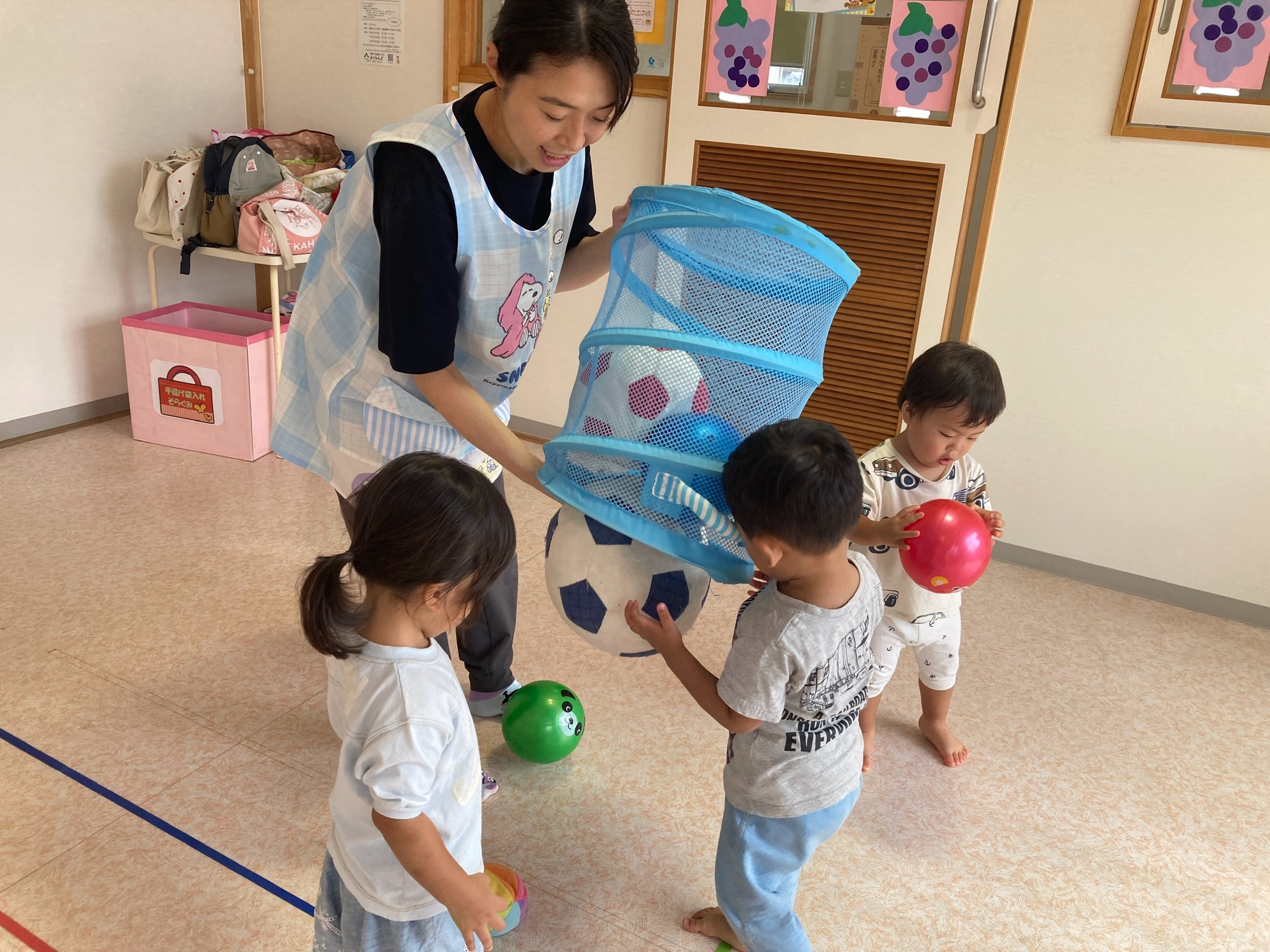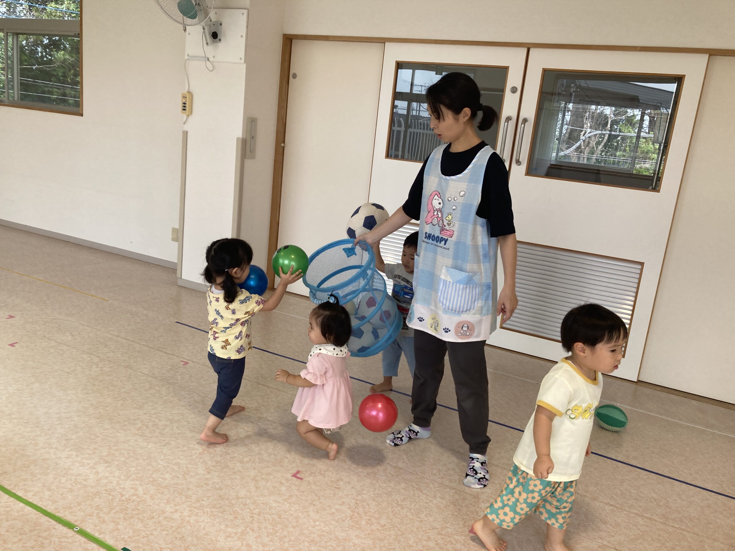 ボール遊びをした後は、かごを出して、ボールをかごの中に入れていきます。