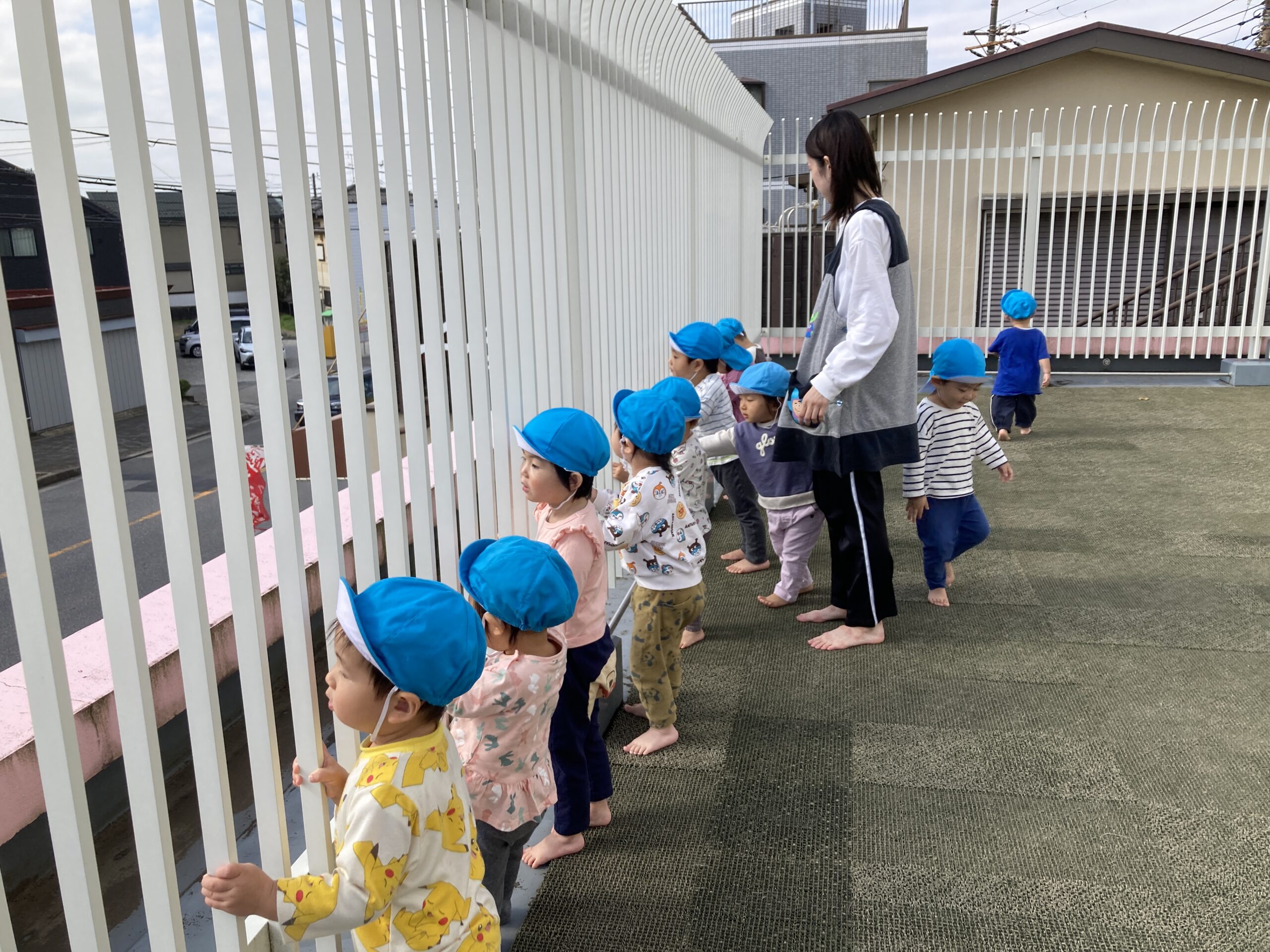 みんなのお気に入りは、柵をしっかり握って車を見ることです。「トラックきたね」「バス」とお話しながら楽しんでいますよ。