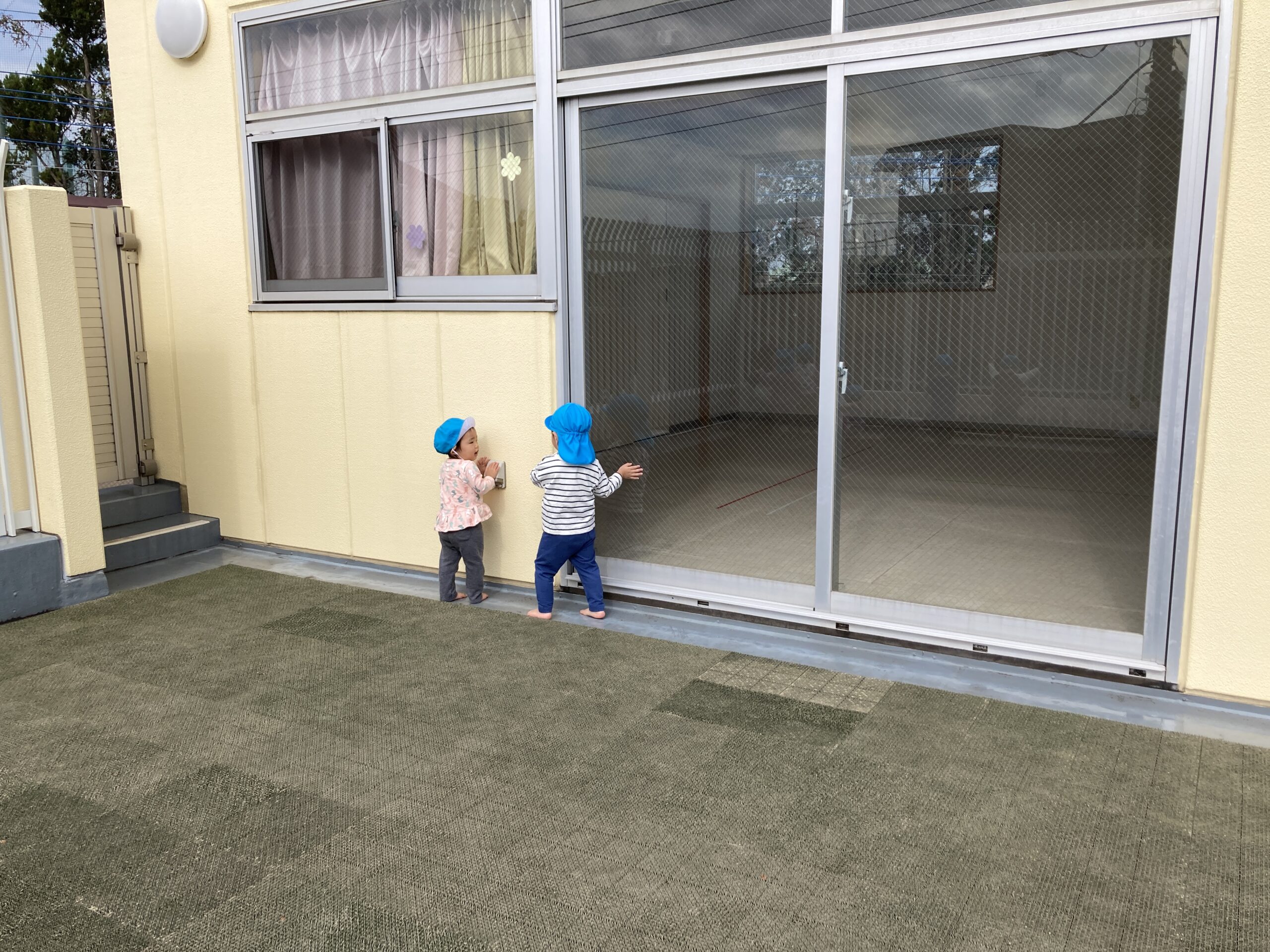 久しぶりのテラス遊びで人工芝がちょっと痛かった様で、人工芝がないところを見つけて歩いているお友達もいましたが
