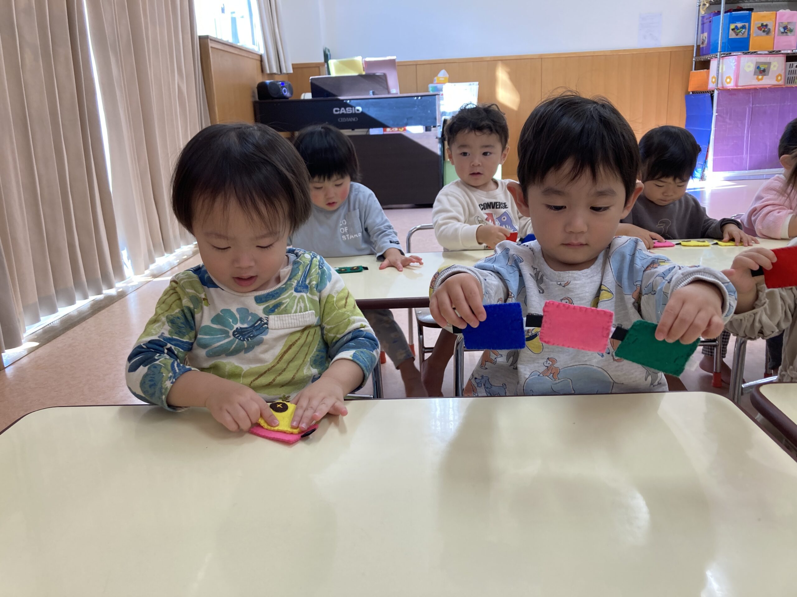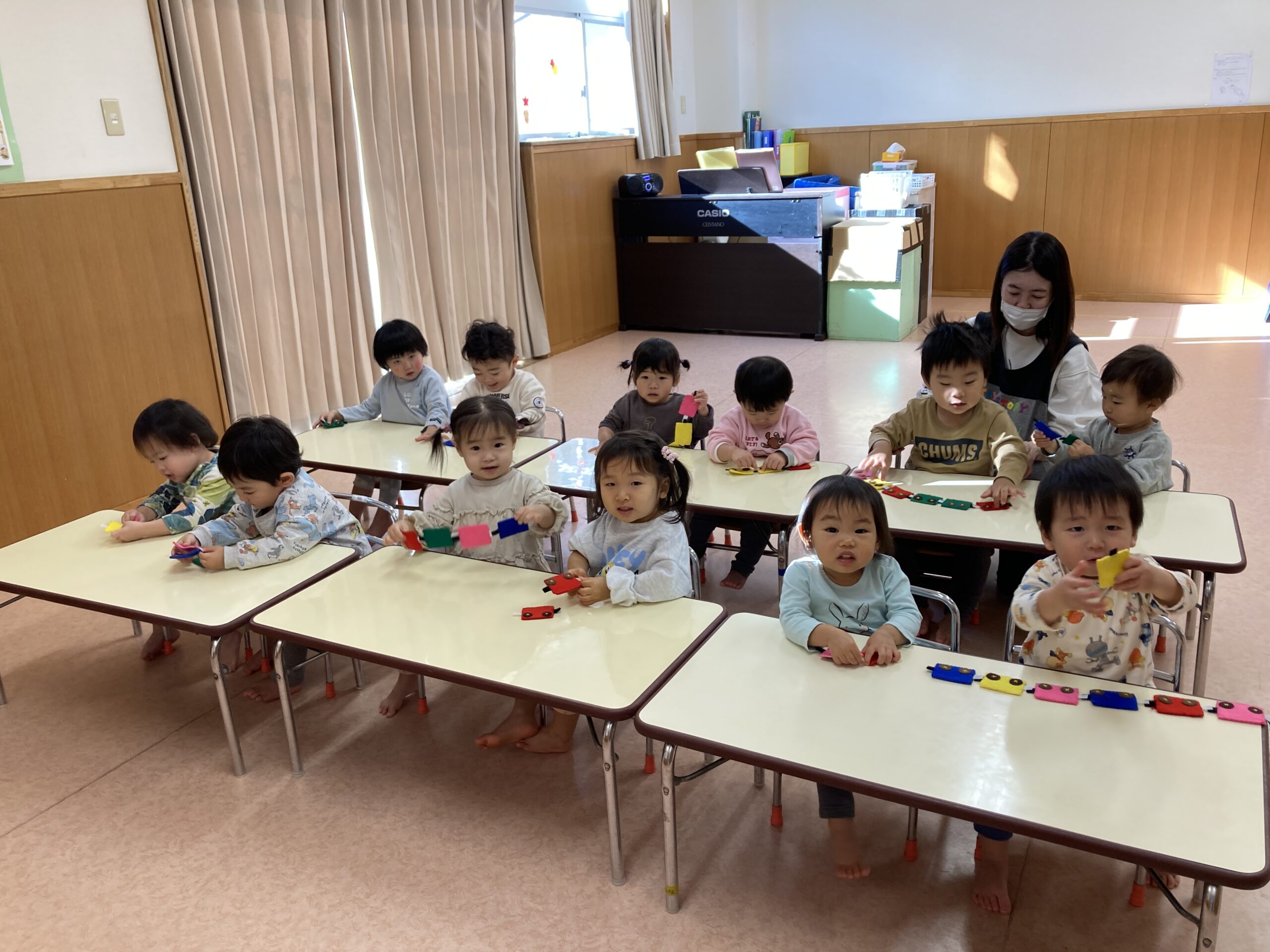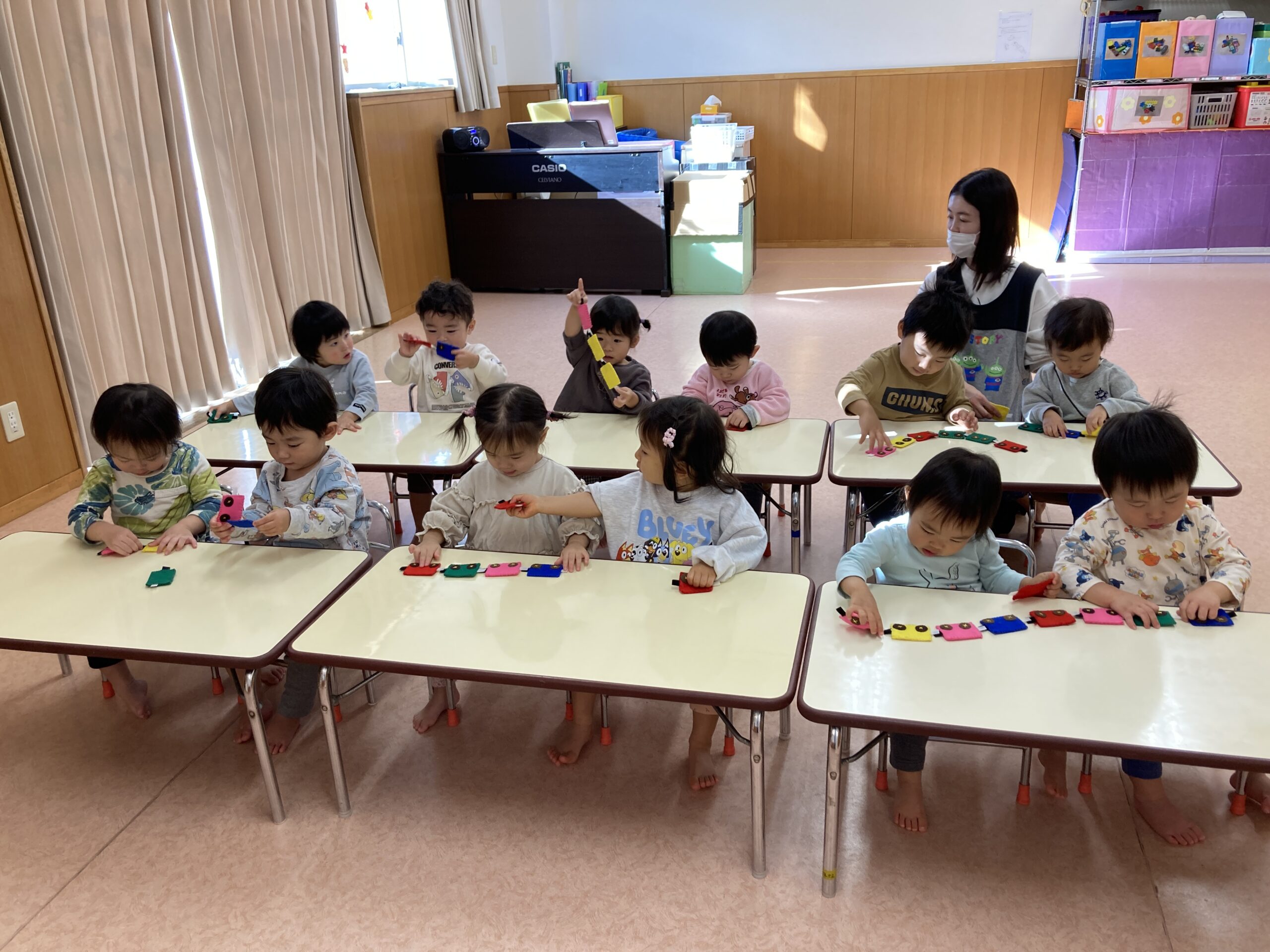 最近のほし組さんのお気に入りの指先遊びは、電車をマジックテープでくっつけて長くする遊びです。